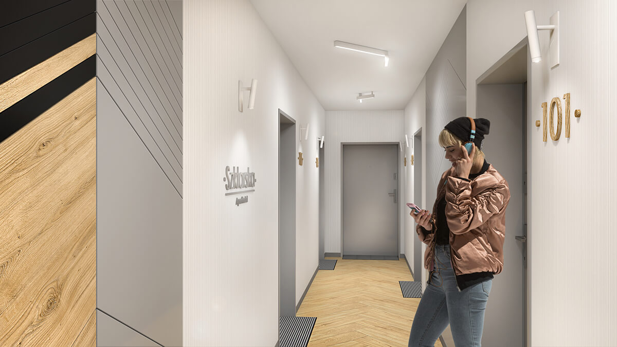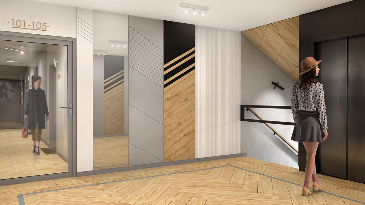 Czerń stanowi akcent dodający wyrazu i dynamiki do dość stonowanych wnętrz, pełnych okładzin w kolorze drewna z graficznym motywem jodły.