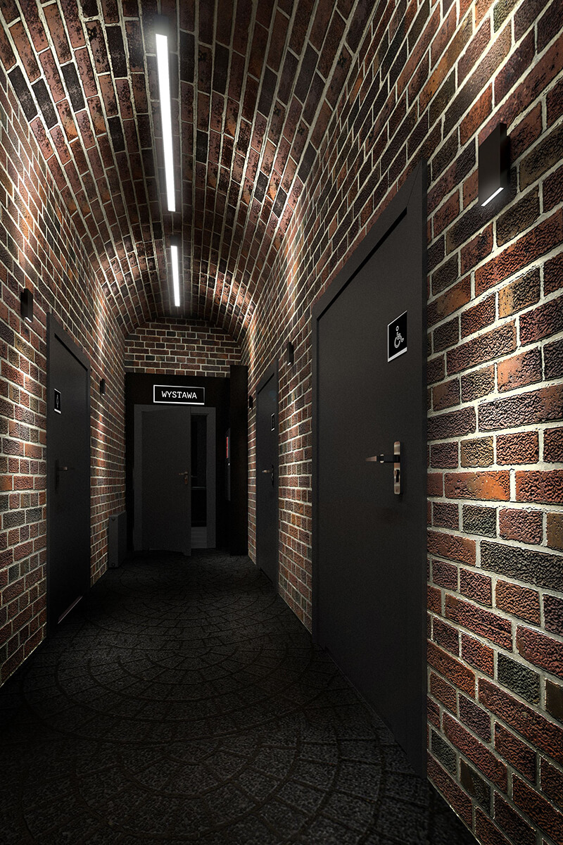 Na pierwszej kondygnacji głównego obiektu zlokalizowane zostały sale dla dzieci przeznaczone na cele kulturalne. Wnętrza utrzymane są w gamie szarości podbitej odcieniami brązów i pomarańczy. Materiałami podbijającymi industrialny charakter miejsca jest pojawiająca się we wnętrzach blacha cięto-ciągniona oraz konstrukcje mebli ze stalowych, czarnych profili.