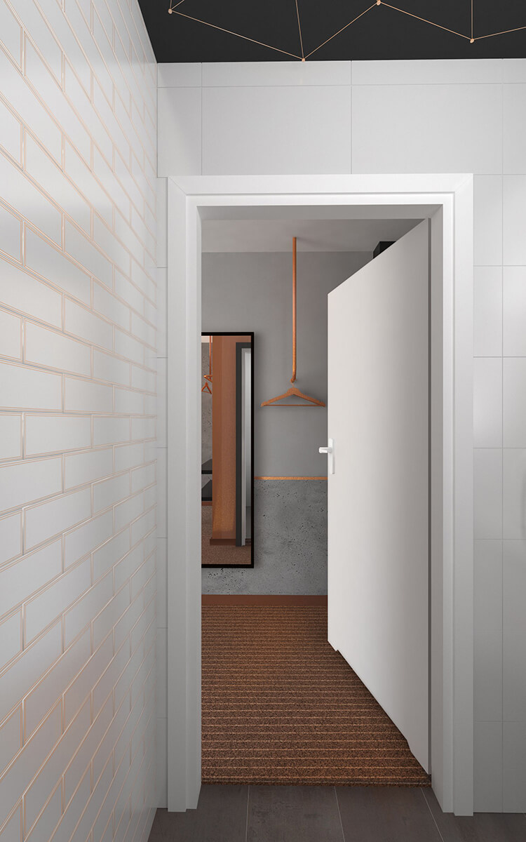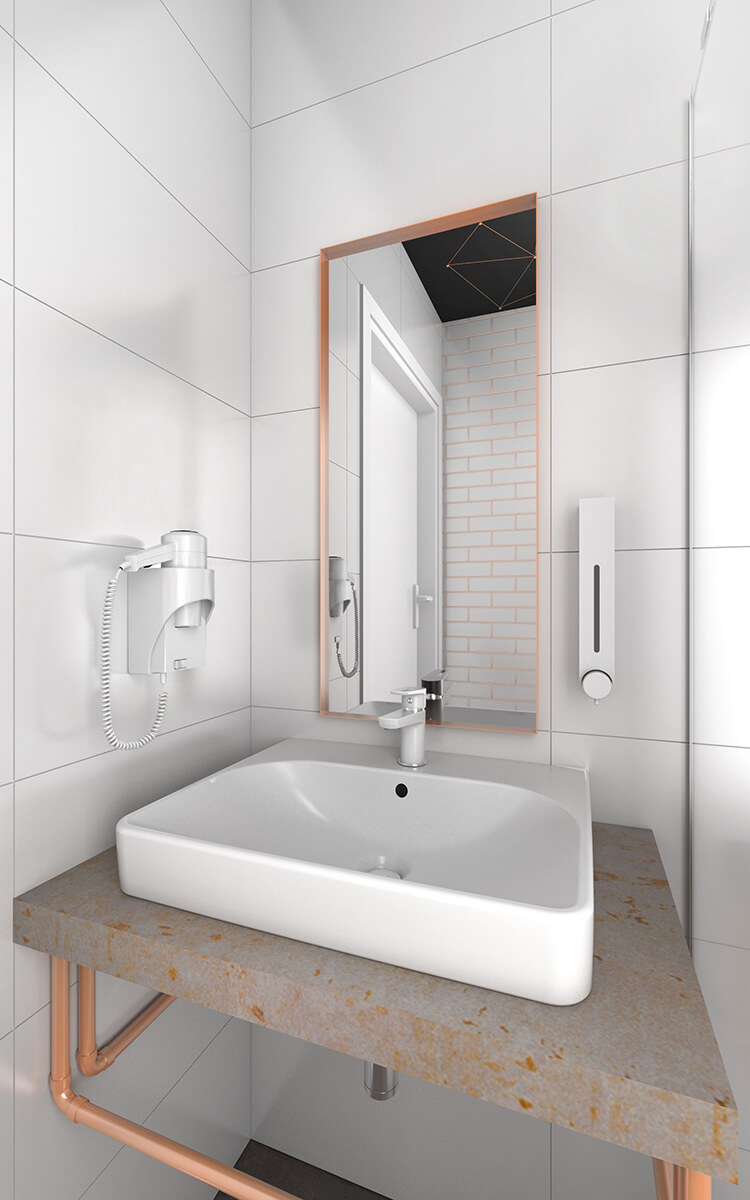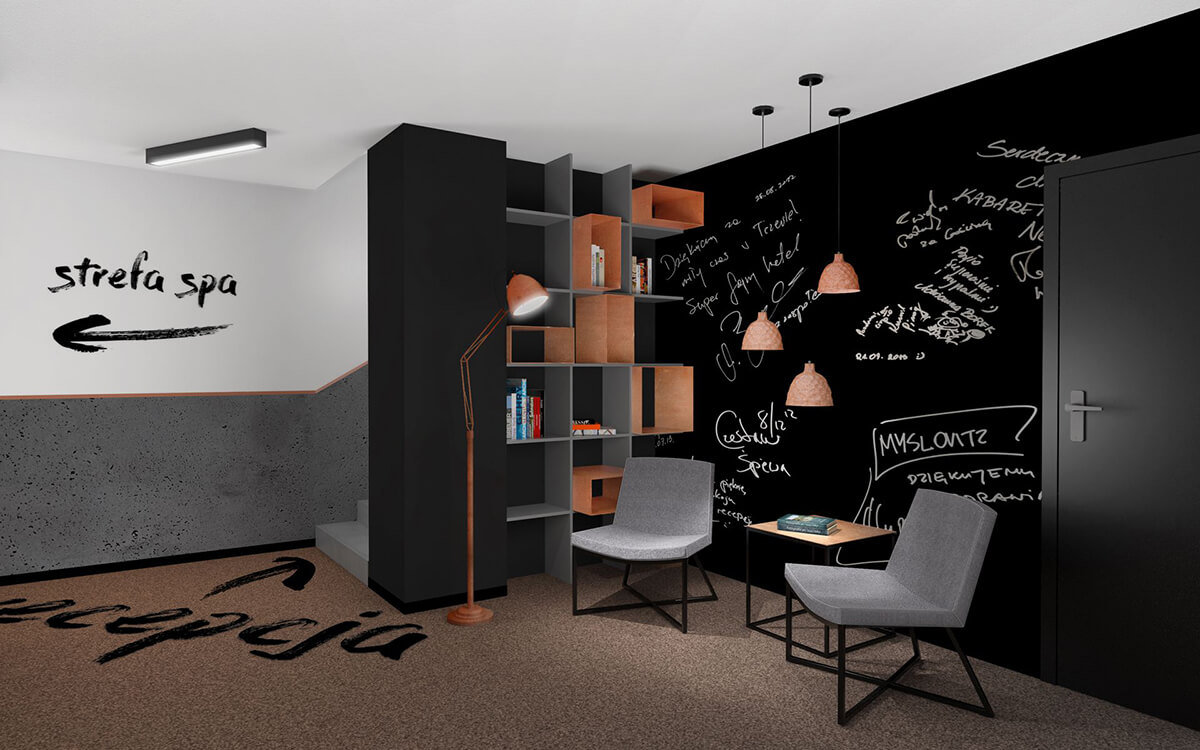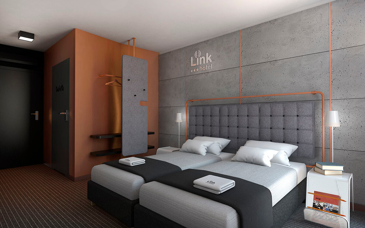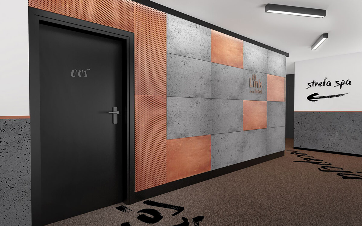 Projekt wnętrz nowej części Linkhotelu zakładał motyw przewodnim w postaci połączenia surowego betonu z miedzią. Ten szlachetny metal występuje we wnętrzach w postaci dekoracyjnych płaskowników, czy też maty Sibu o miedzianym kolorze i połysku. Dopełnieniem są drobne sprzęty, tj. lampy stojące, a także kinkiety. Wnętrze utrzymane jest w skali szarości z dużą ilością czerni i grafitów, co nadaje mu elegancji i szlachetności. W połączeniu z surowym betonem, miedź na czarnym tle wygląda szykownie i nowocześnie zarazem.