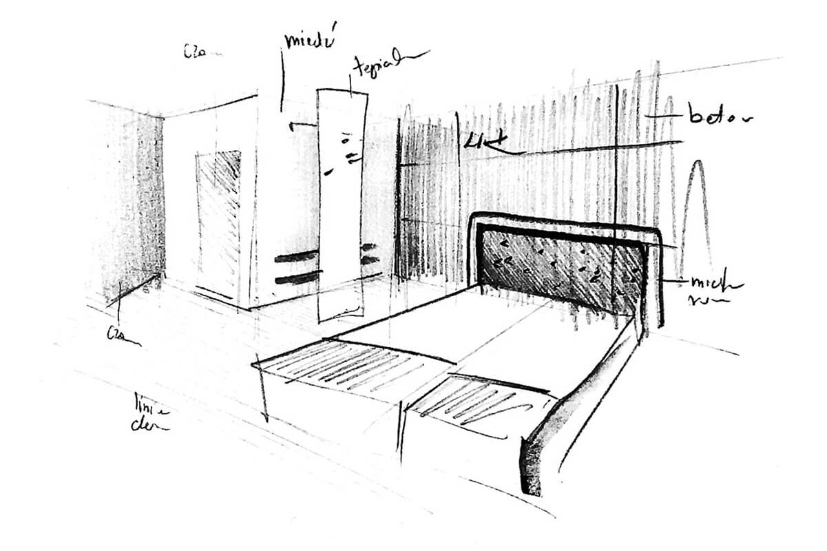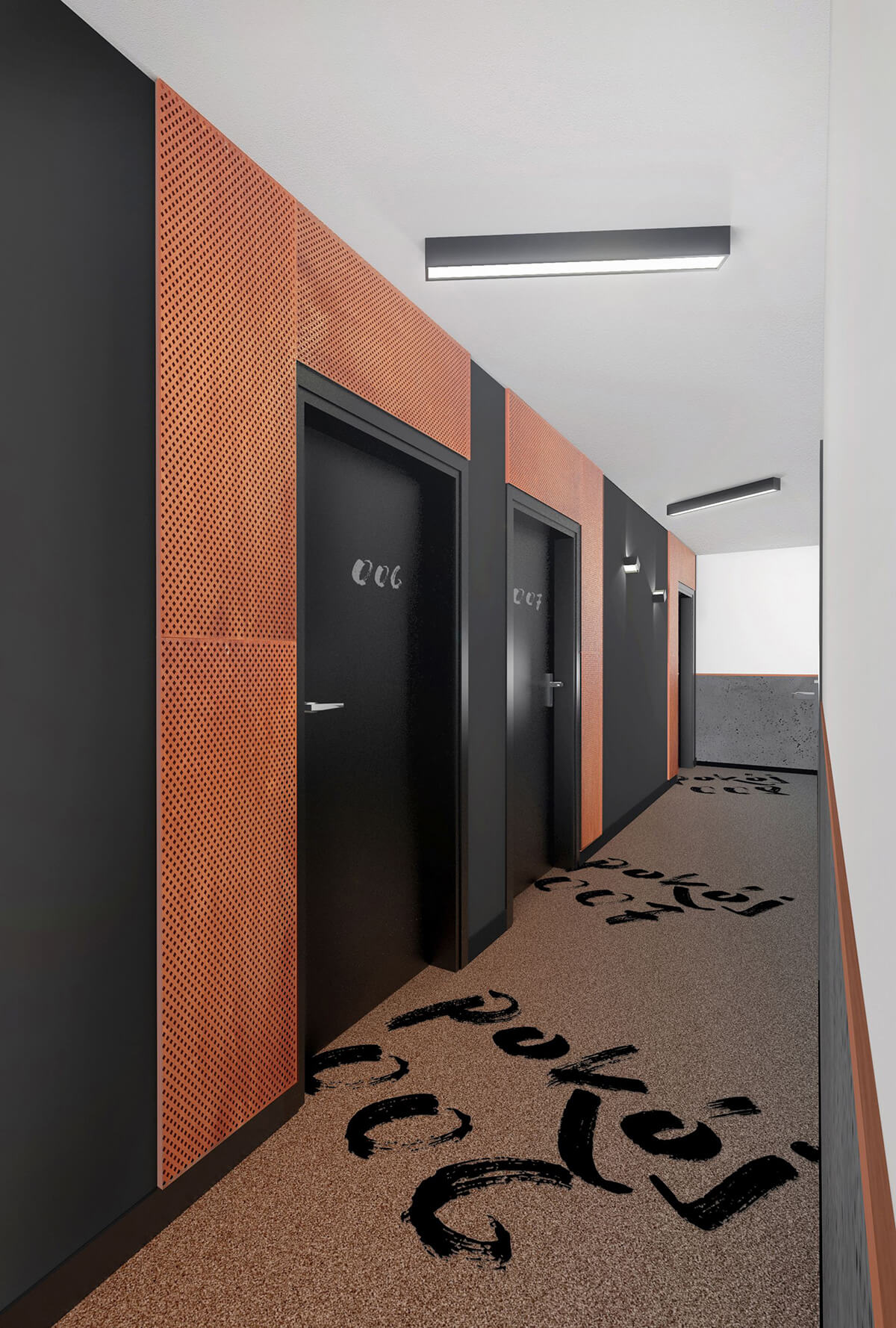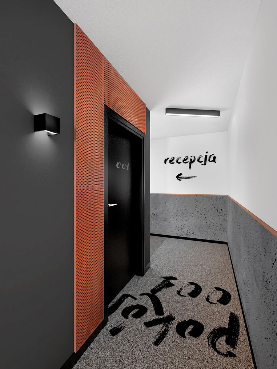 Każdy pokój posiada łatwą w utrzymaniu dywanową wykładzinę w płytkach w kolorze szarym i z pomarańczowymi akcentami. Każdy pokój posiada funkcjonalne wyposażenie w postaci mebli ruchomych oraz trwale zamocowanych, tj. szafa na ubrania. Stanowią wariant alternatywny do standardowych rozwiązań, wprowadzając do wnętrza nieco oryginalności. Brak tu bowiem tradycyjnej, zamykanej szafy, czy klasycznych szafek nocnych. Odpornym na zużycie materiałem jest zastosowany na ścianie za łóżkiem beton architektoniczny w formie płyt. Ocieplone zostały grafitowym, tapicerowanym zmywalną tkanina zagłówkiem o delikatnym pikowaniu.