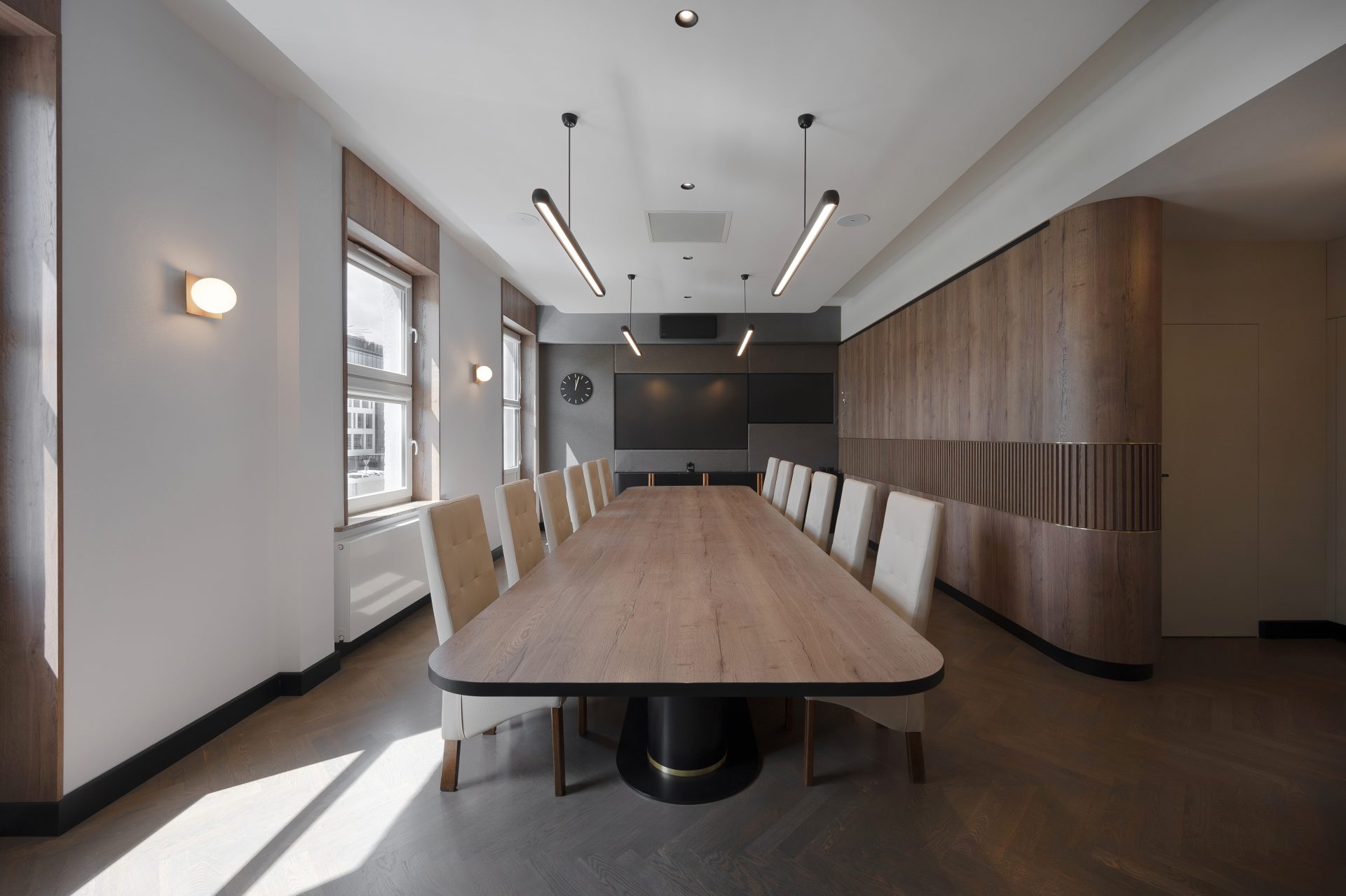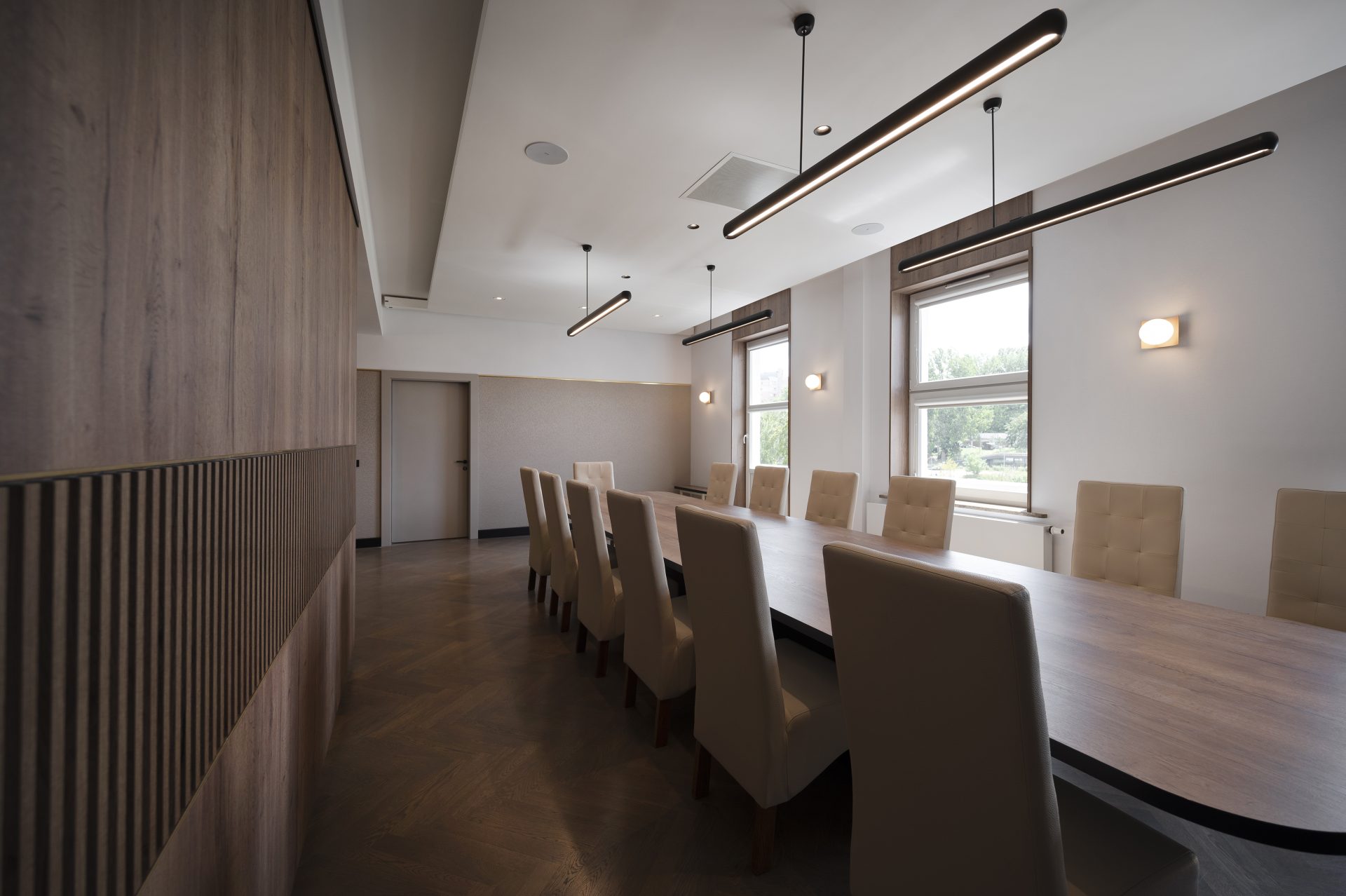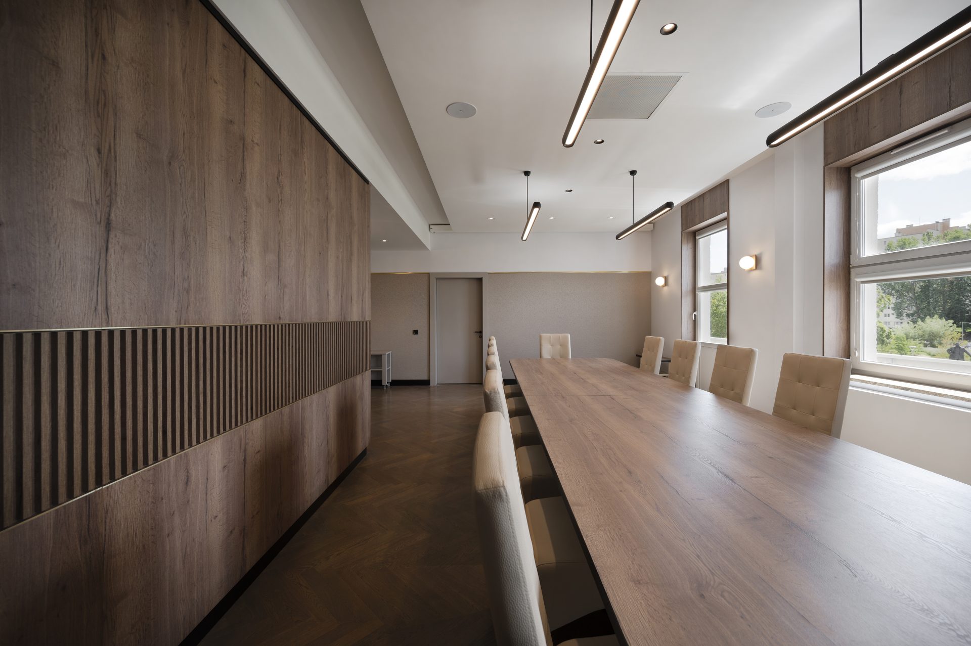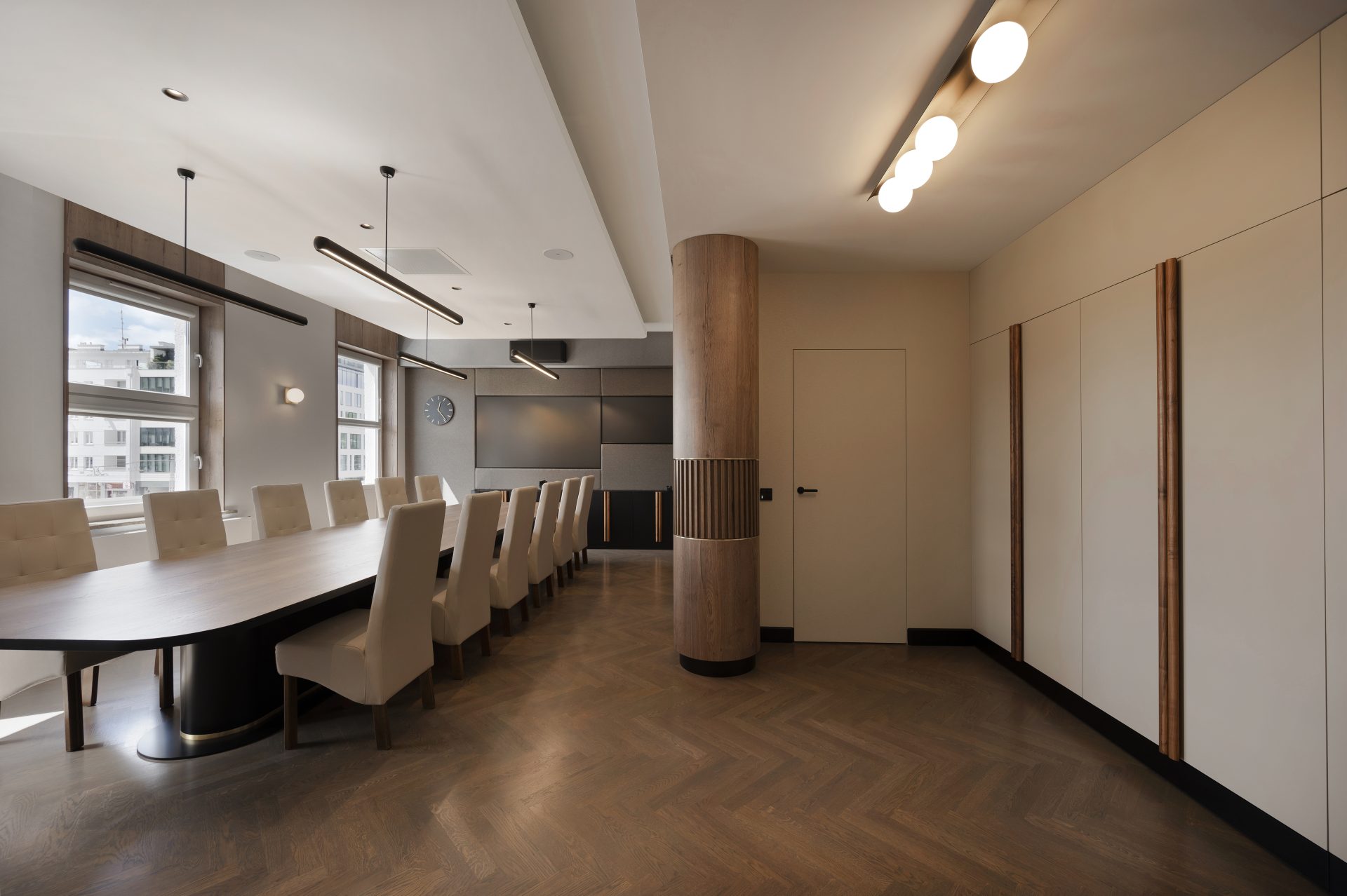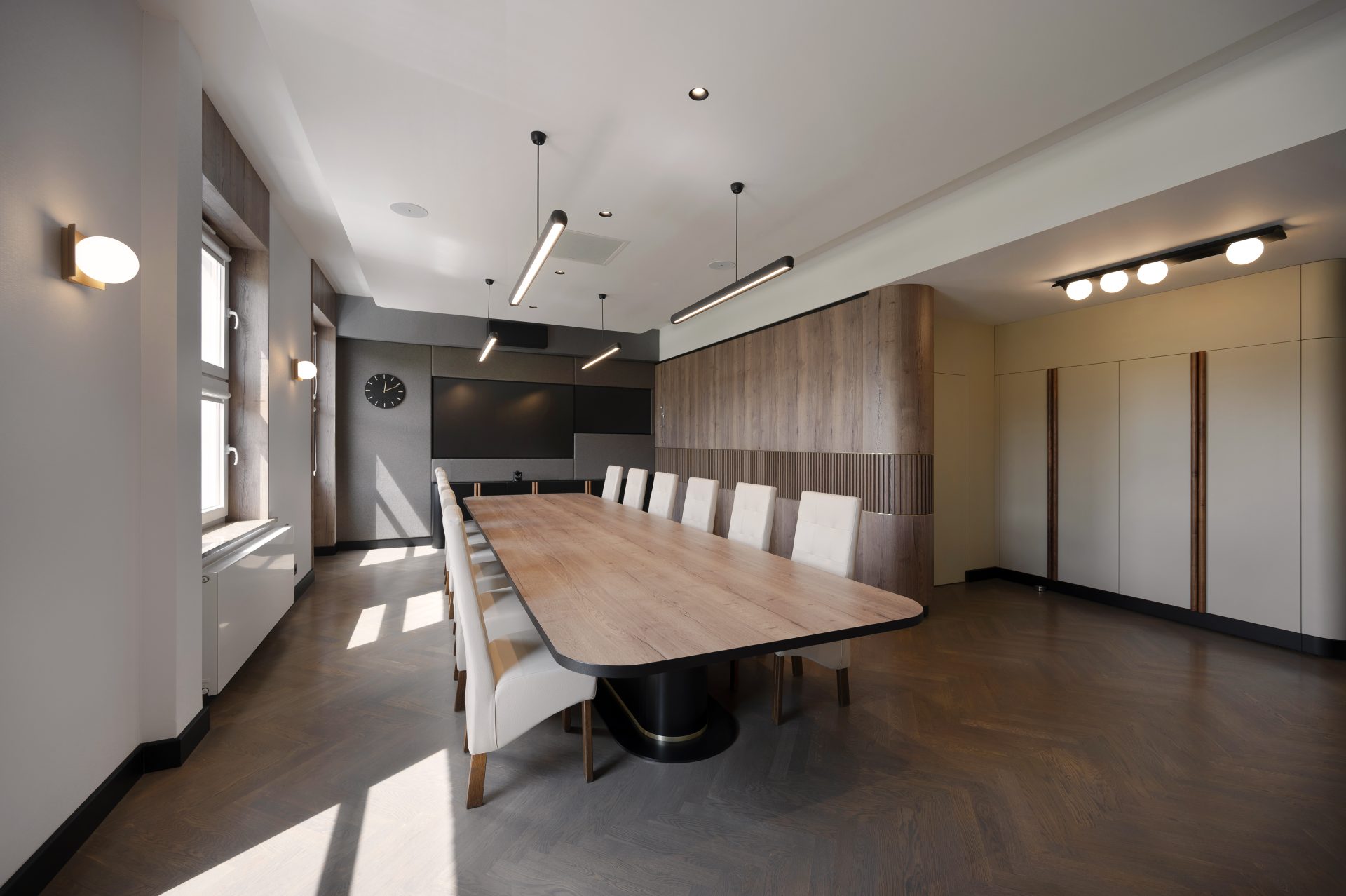 Podobnie jak w przypadku wielu przedwojennych realizacjach, tutaj również upatrywaliśmy wysokich walorów estetycznych w surowym rysunku usłojenia naturalnych fornirów drewnianych. Duży nacisk położony został także na detale mebli o miękkich elementach, tak bliskich gdyńskiej modernistycznej naturze. Całość utrzymana jest w ciepłej gamie kolorystycznej i skontrastowana czernią. Wnętrze wyposażone zostało w kompletny zestaw multimedialnych udogodnień, zapewnionych przez najwyższej klasy osprzęt do pracy konferencyjnej, tak istotnej przy powszechnej dziś zdalnej komunikacji.