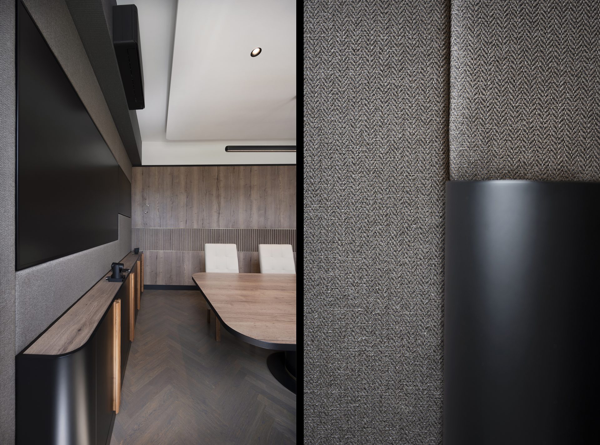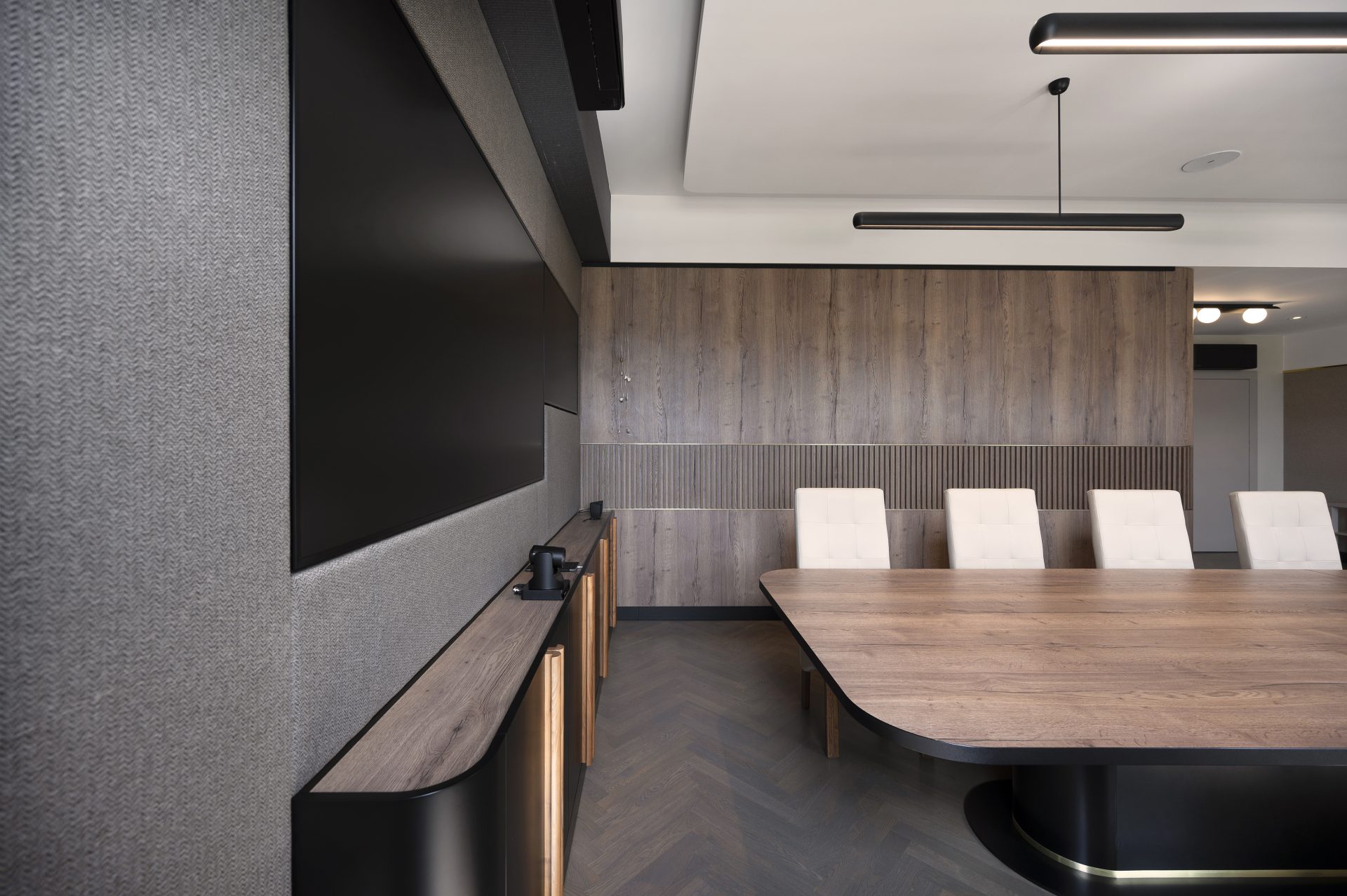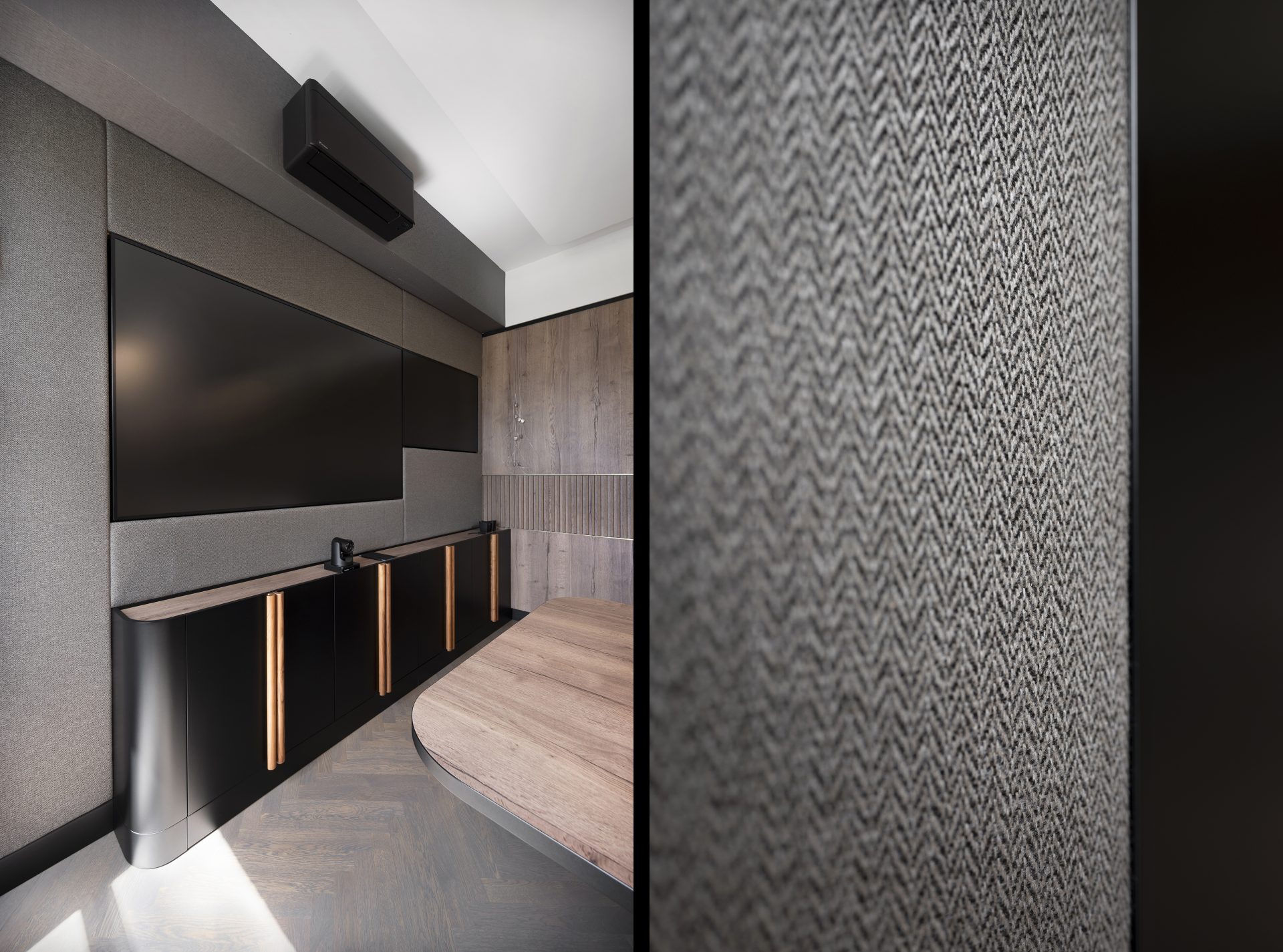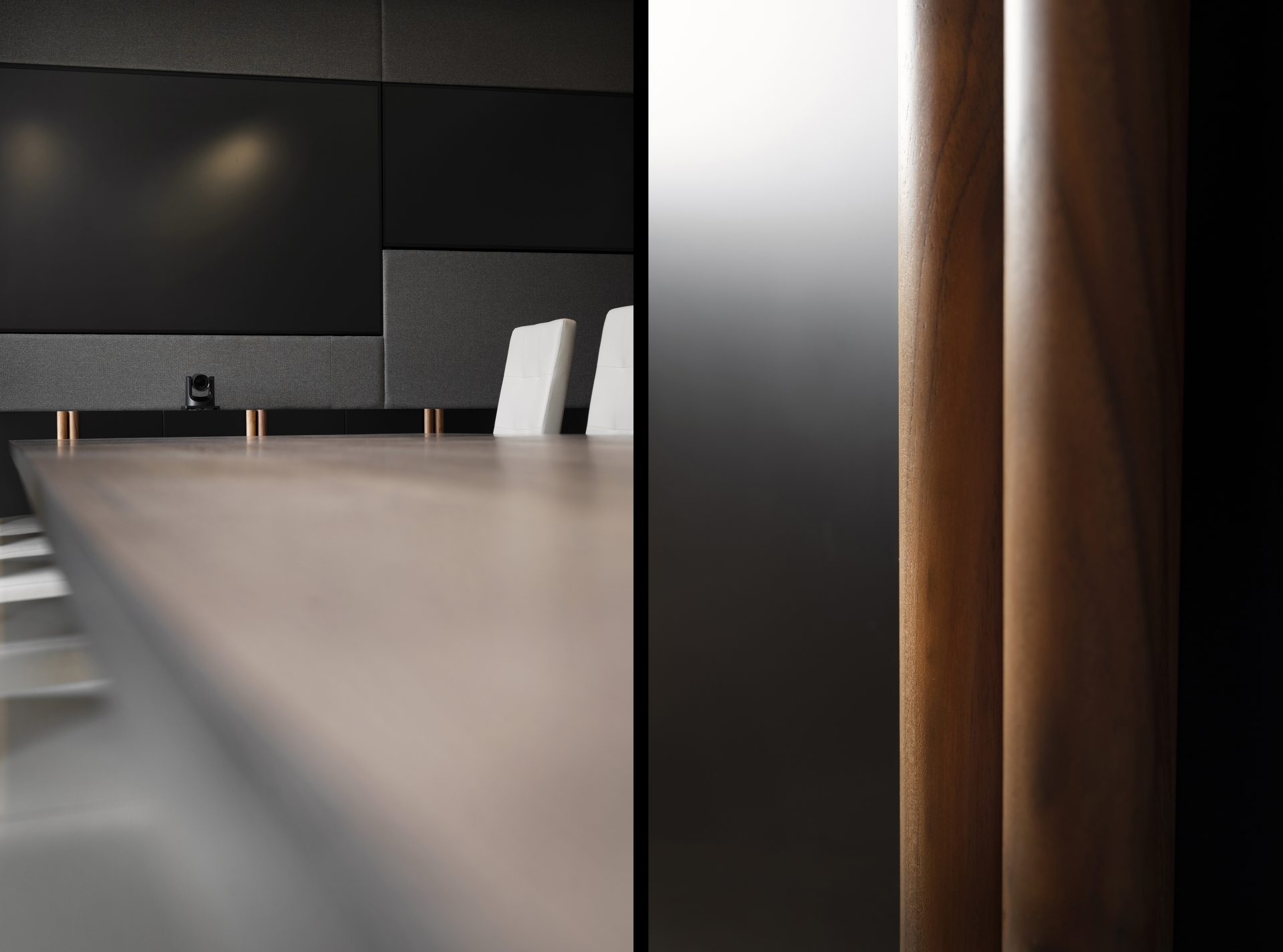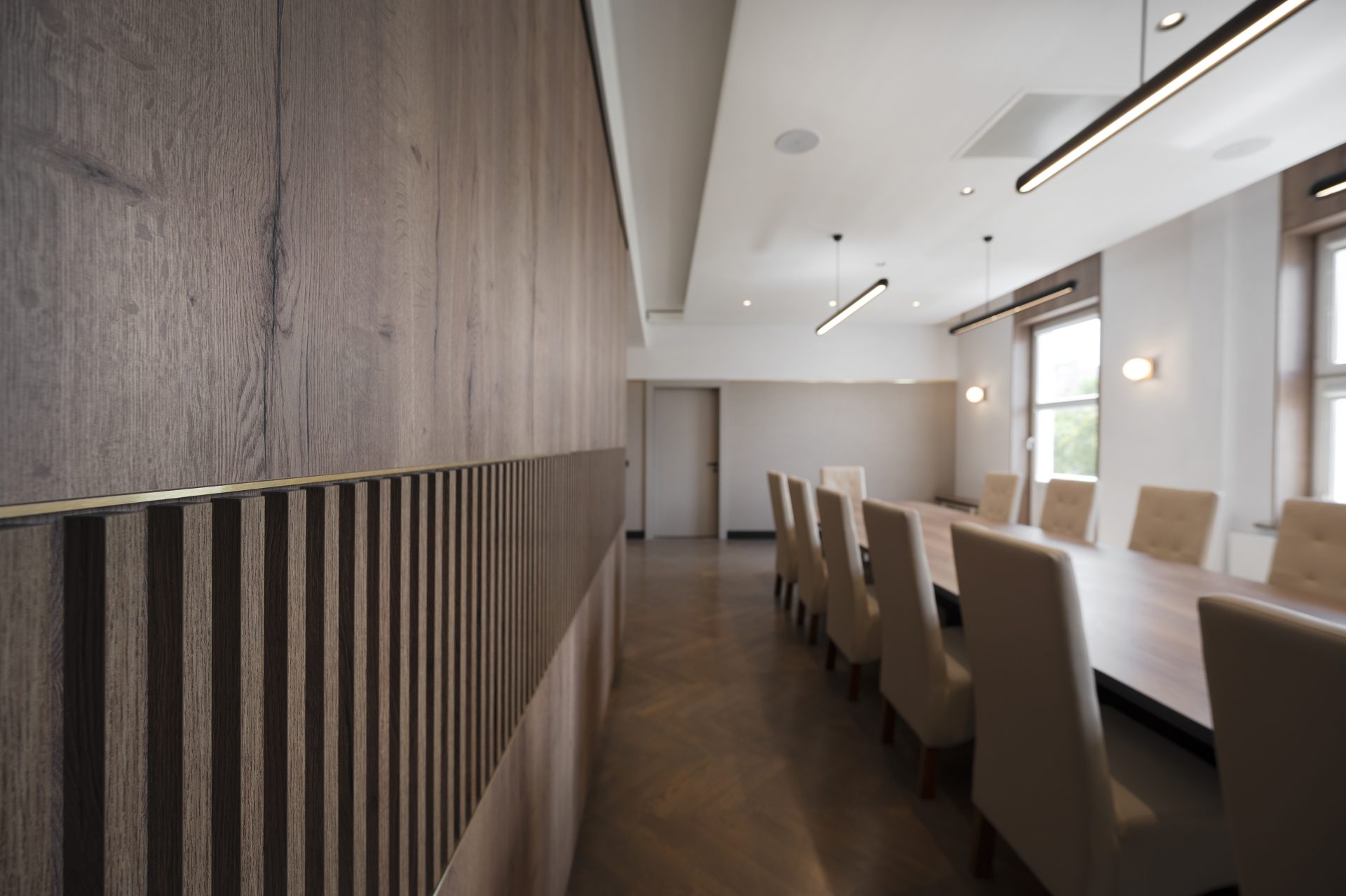 Podobnie jak w przypadku wielu przedwojennych realizacjach, tutaj również upatrywaliśmy wysokich walorów estetycznych w surowym rysunku usłojenia naturalnych fornirów drewnianych. Duży nacisk położony został także na detale mebli o miękkich elementach, tak bliskich gdyńskiej modernistycznej naturze. Całość utrzymana jest w ciepłej gamie kolorystycznej i skontrastowana czernią. Wnętrze wyposażone zostało w kompletny zestaw multimedialnych udogodnień, zapewnionych przez najwyższej klasy osprzęt do pracy konferencyjnej, tak istotnej przy powszechnej dziś zdalnej komunikacji.