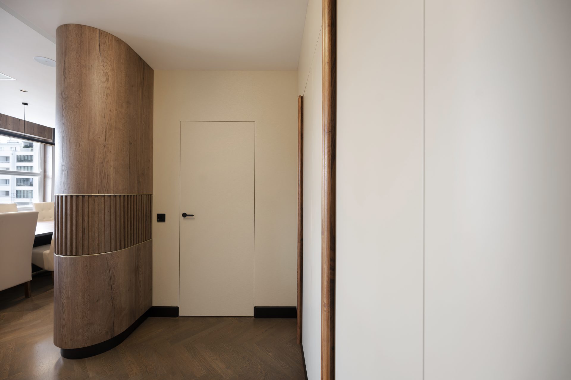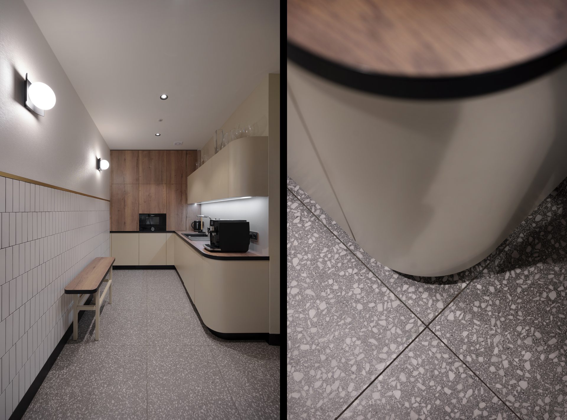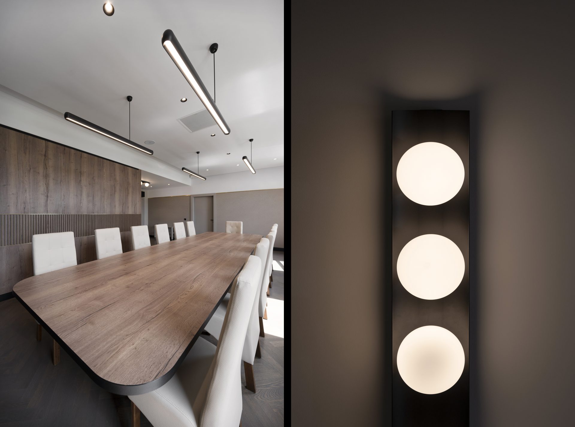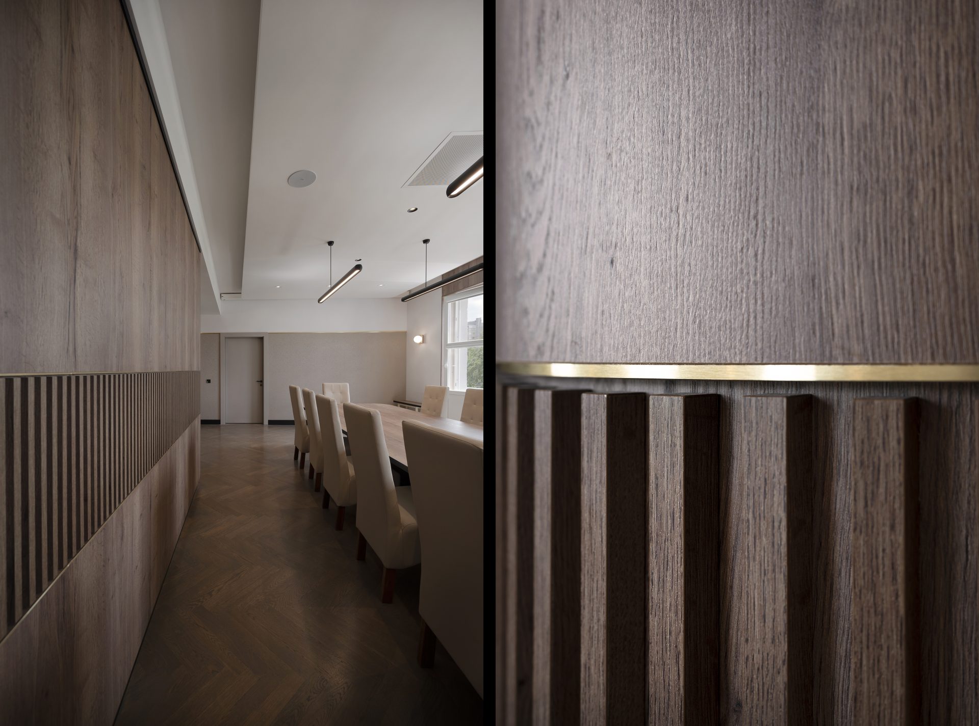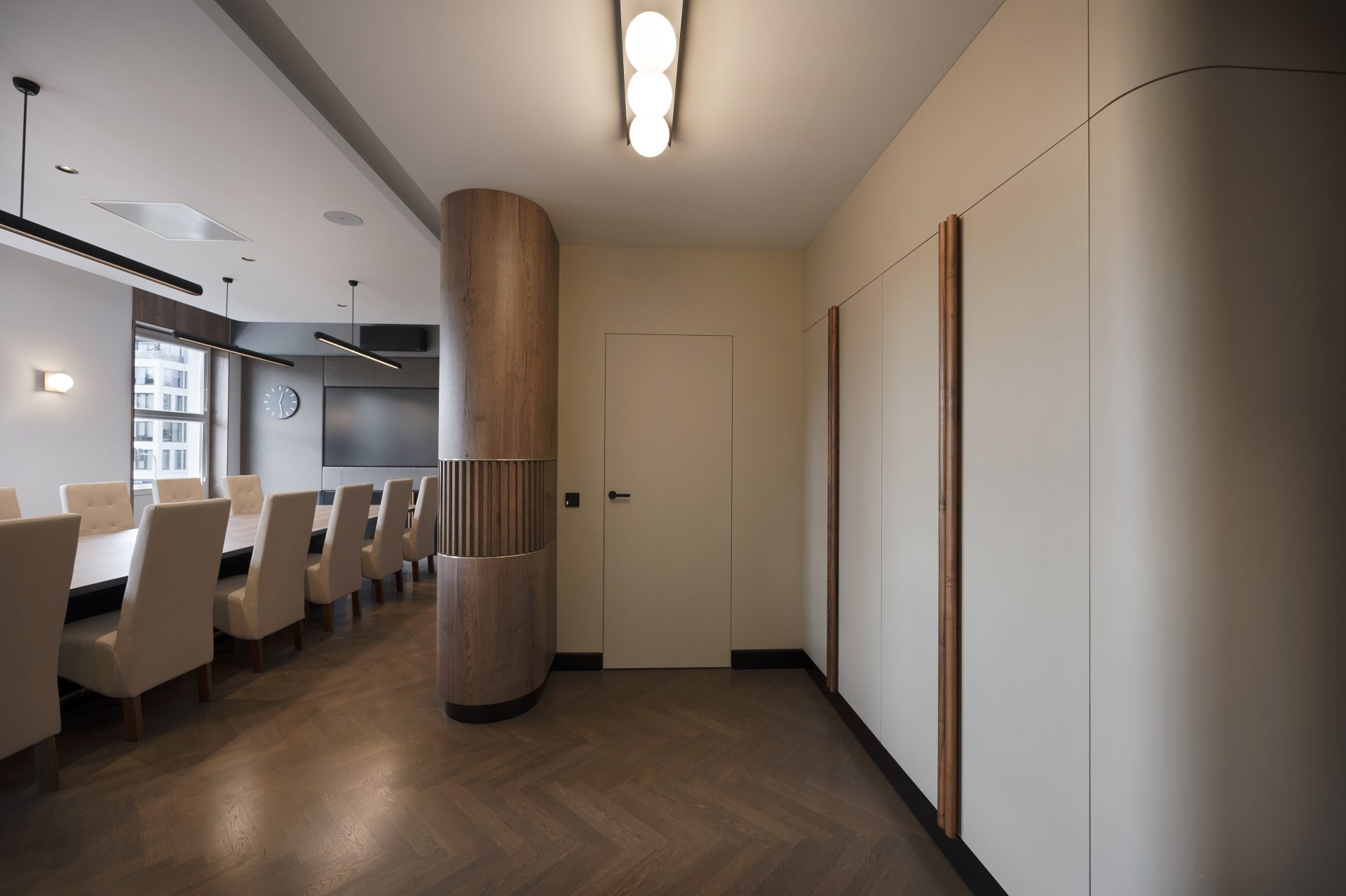 Podobnie jak w przypadku wielu przedwojennych realizacjach, tutaj również upatrywaliśmy wysokich walorów estetycznych w surowym rysunku usłojenia naturalnych fornirów drewnianych. Duży nacisk położony został także na detale mebli o miękkich elementach, tak bliskich gdyńskiej modernistycznej naturze. Całość utrzymana jest w ciepłej gamie kolorystycznej i skontrastowana czernią. Wnętrze wyposażone zostało w kompletny zestaw multimedialnych udogodnień, zapewnionych przez najwyższej klasy osprzęt do pracy konferencyjnej, tak istotnej przy powszechnej dziś zdalnej komunikacji.