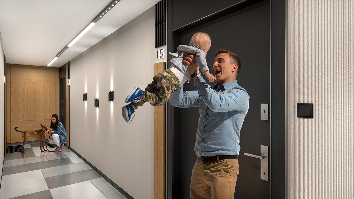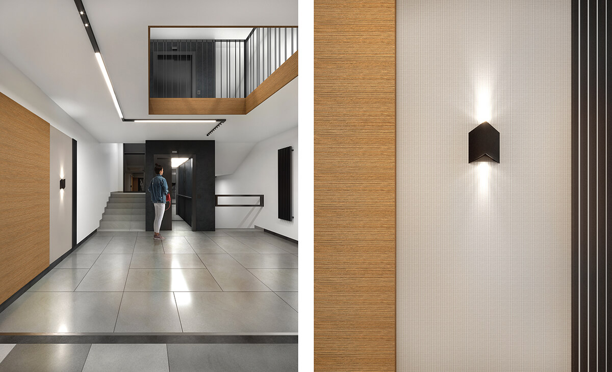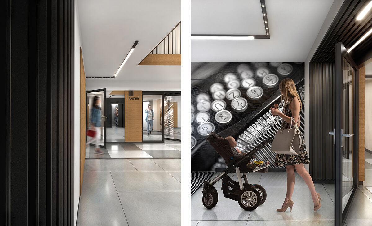 Motywem przewodnim stały się elementy linearne oraz duże kontrasty, tworzone przez odważne zestawienia materiałów w towarzystwie czerni. Plastyka wnętrza buduje nastrój elegancji i podkreśla nietuzinkowy charakter Inwestycji.