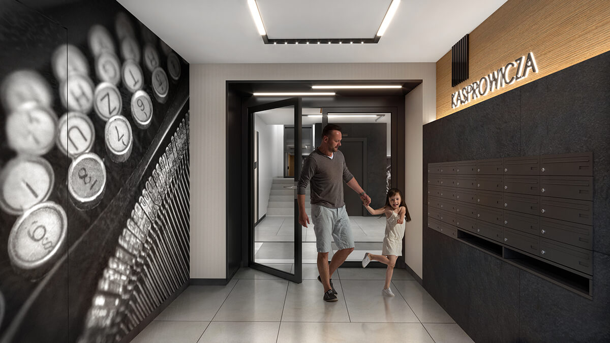 Projekt wnętrz wspólnych na osiedlu Kasprowicza w Pruszczu Gdańskim miał odpowiadać charakterowi nowoczesnej i wyrazistej w formie architekturze. Dynamika dachów i dość ostre kształty bryły znalazły odzwierciedlenie we wnętrzach, podobnie jak tonacja kolorystyczna elewacji.