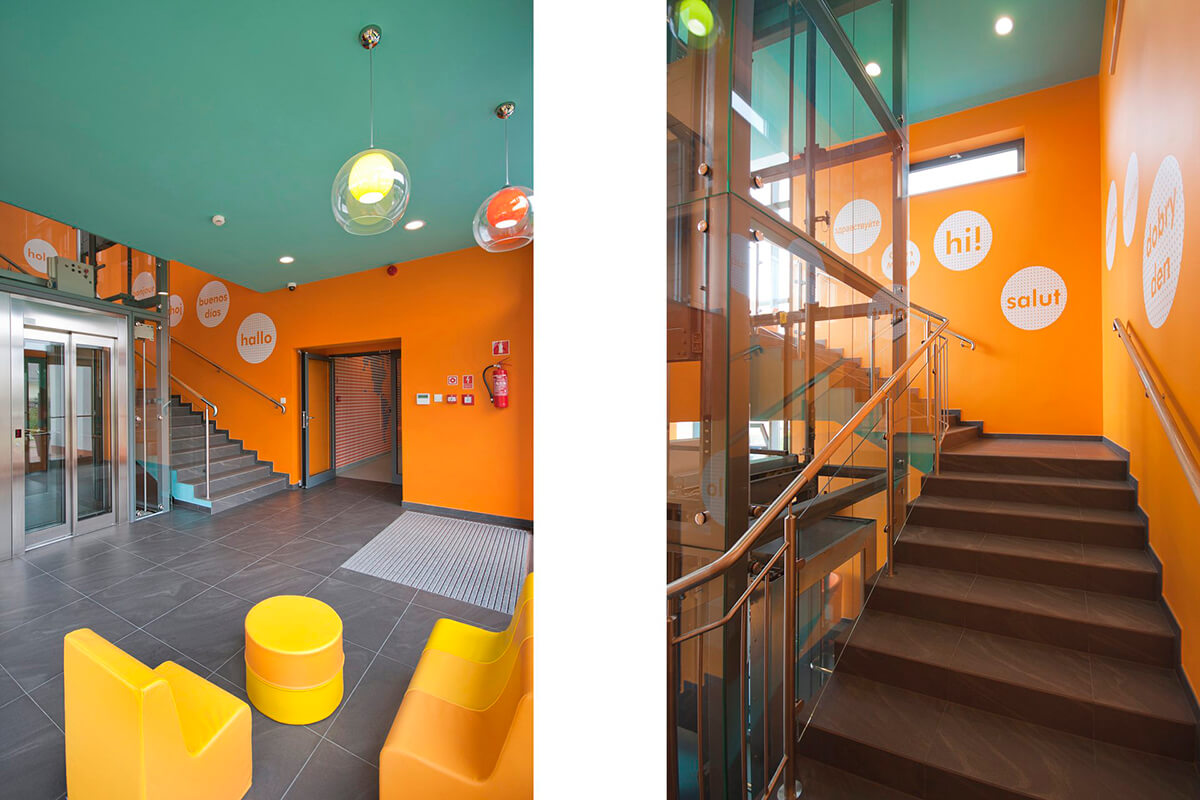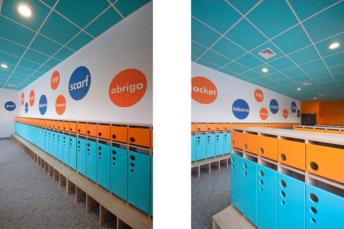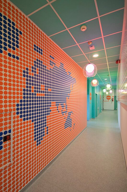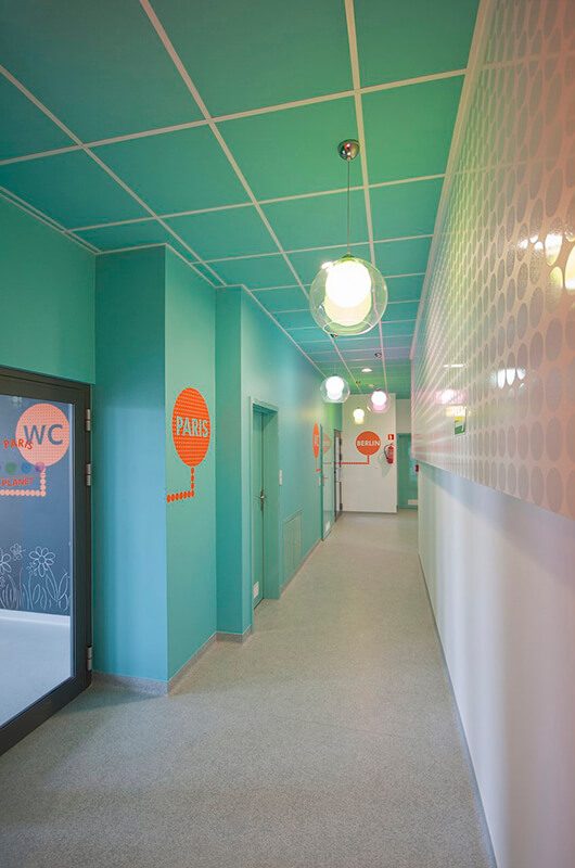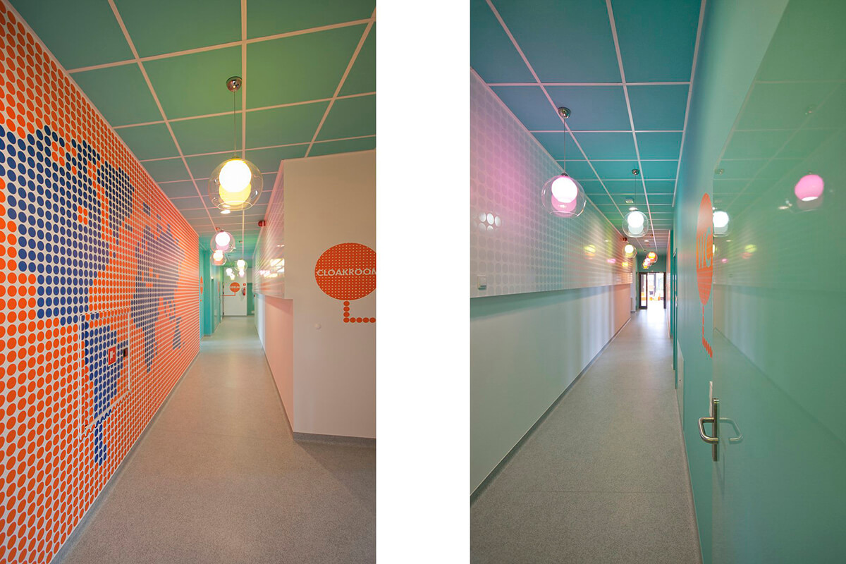 Wnętrza opatrzone są precyzyjnie opracowaną identyfikacją wizualną, kierującą odwiedzających do odpowiednich pomieszczeń oraz dodającą intensywnych akcentów kolorystycznych w wybranych miejscach. Liczne punktowe desenie i wzory na ścianach, przekazują treści związane z podróżowaniem, różnorodnymi językami świata, pobudzając wyobraźnię dzieci i stanowiąc interesujący motyw do rozmów inicjowanych przez nauczycieli.