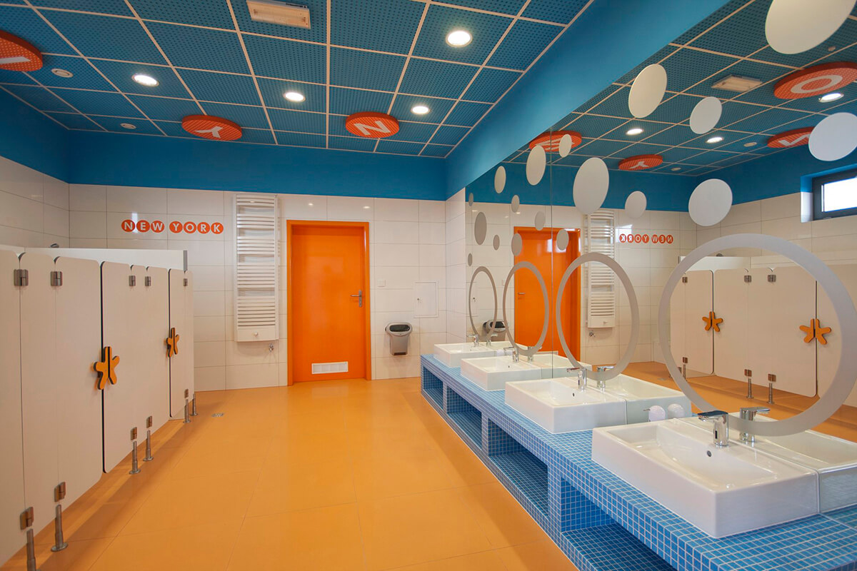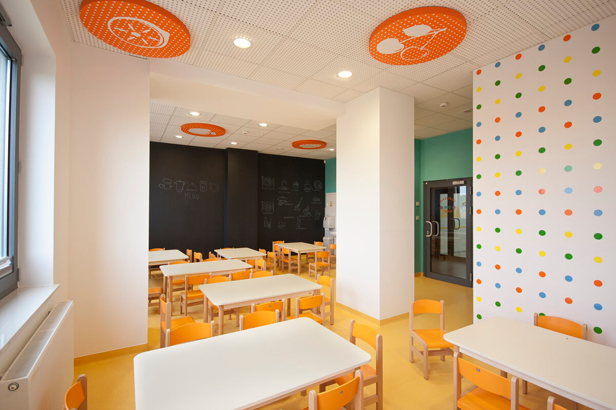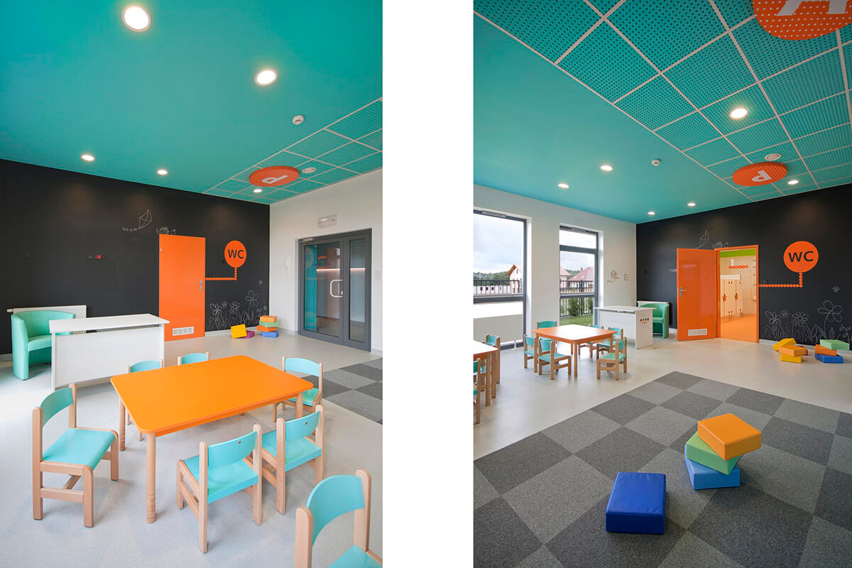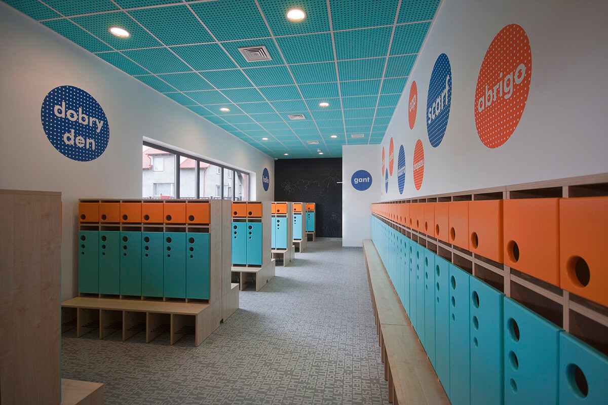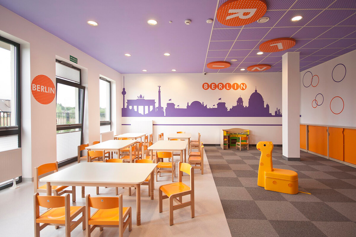 Przedszkole o językowym profilu i międzynarodowym charakterze otrzymało funkcjonalne i przytulne wnętrza o zdecydowanej kolorystyce przeplatanej motywami kropkowanych deseni i wzorów. Zastosowane w projekcie kolory przeciwstawne między innymi w postaci błękitów i pomarańczy dodają energii i dynamiki wnętrzu.