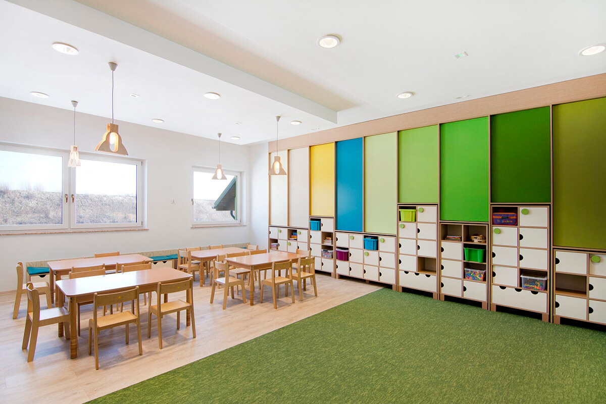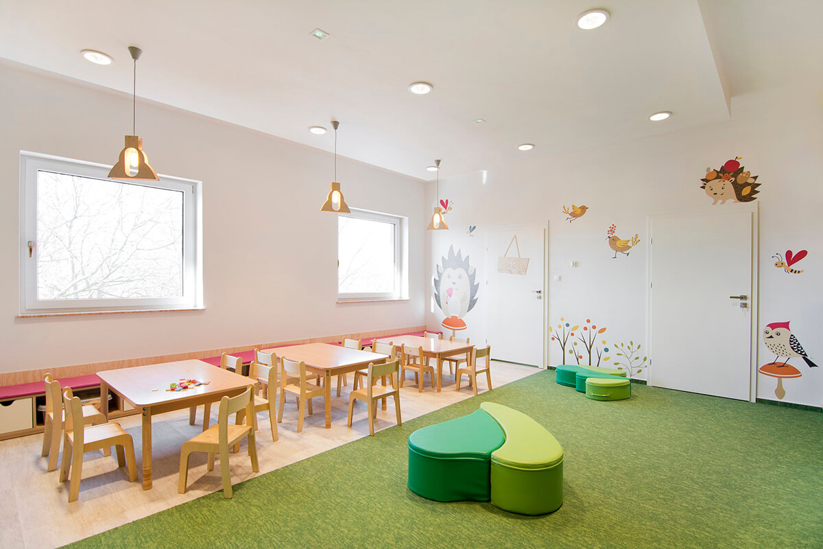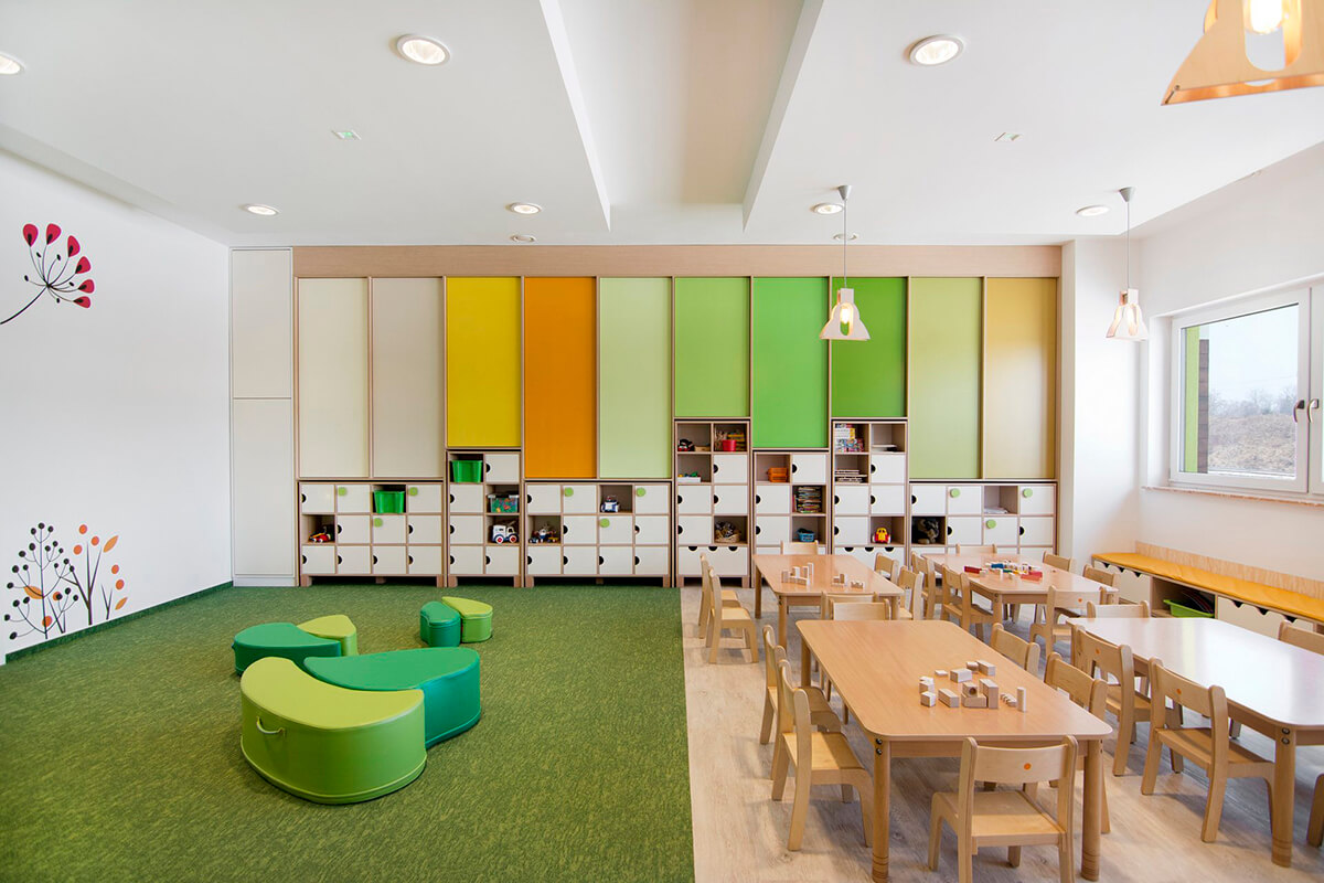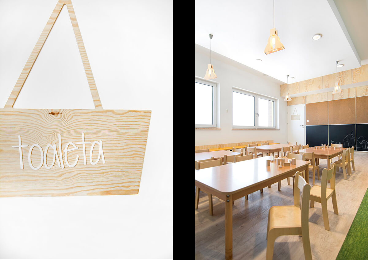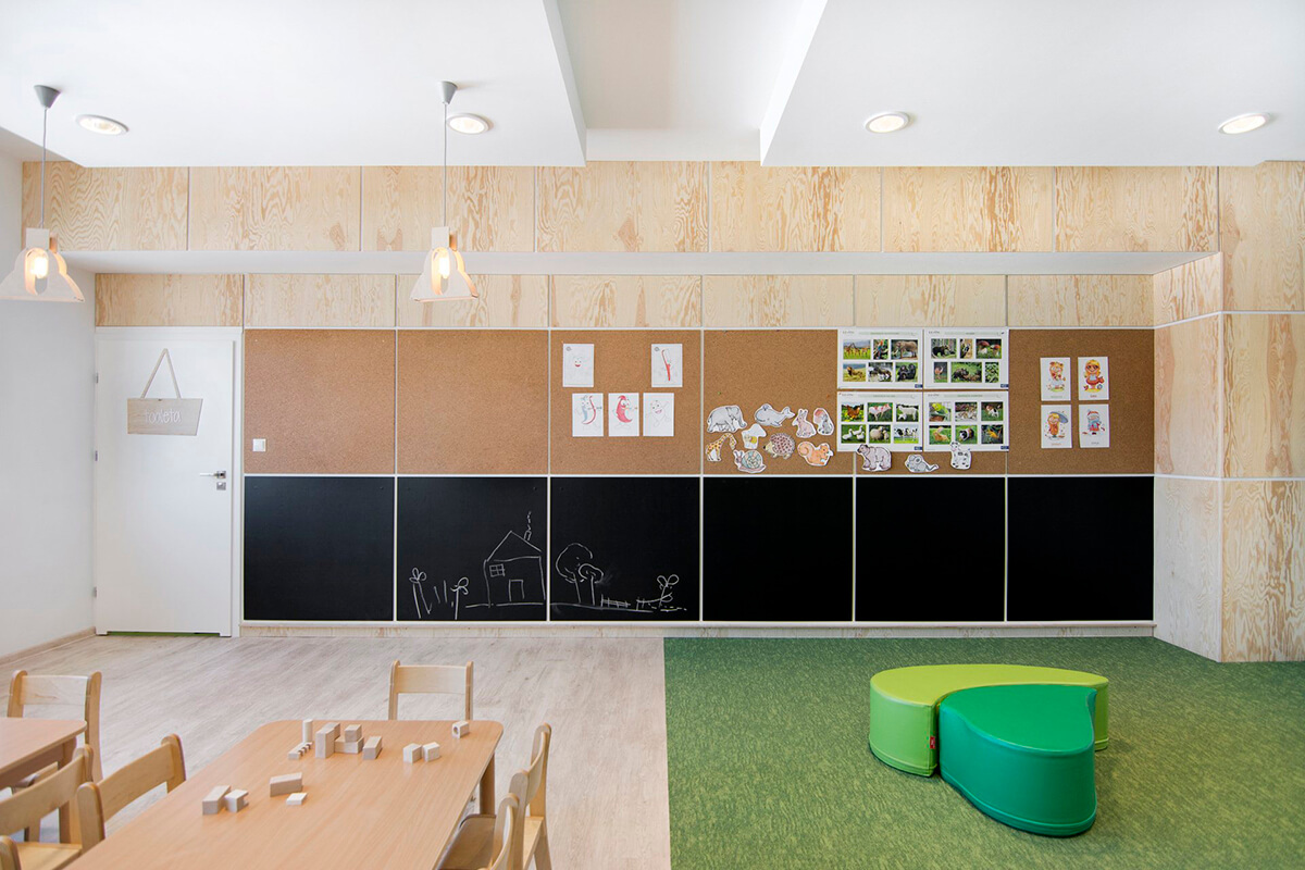 W przedszkolu znaleźć można liczne wnęki i skrytki dla dzieci. Ich formy przywodzą na myśl charakterystyczne motywy leśne, czy wiejskie. Gama kolorystyczna złożona z odcieni żółci, pomarańczy i zieleni skontrastowana została z mocną magentą oraz czarnymi powierzchniami farby tablicowej.
