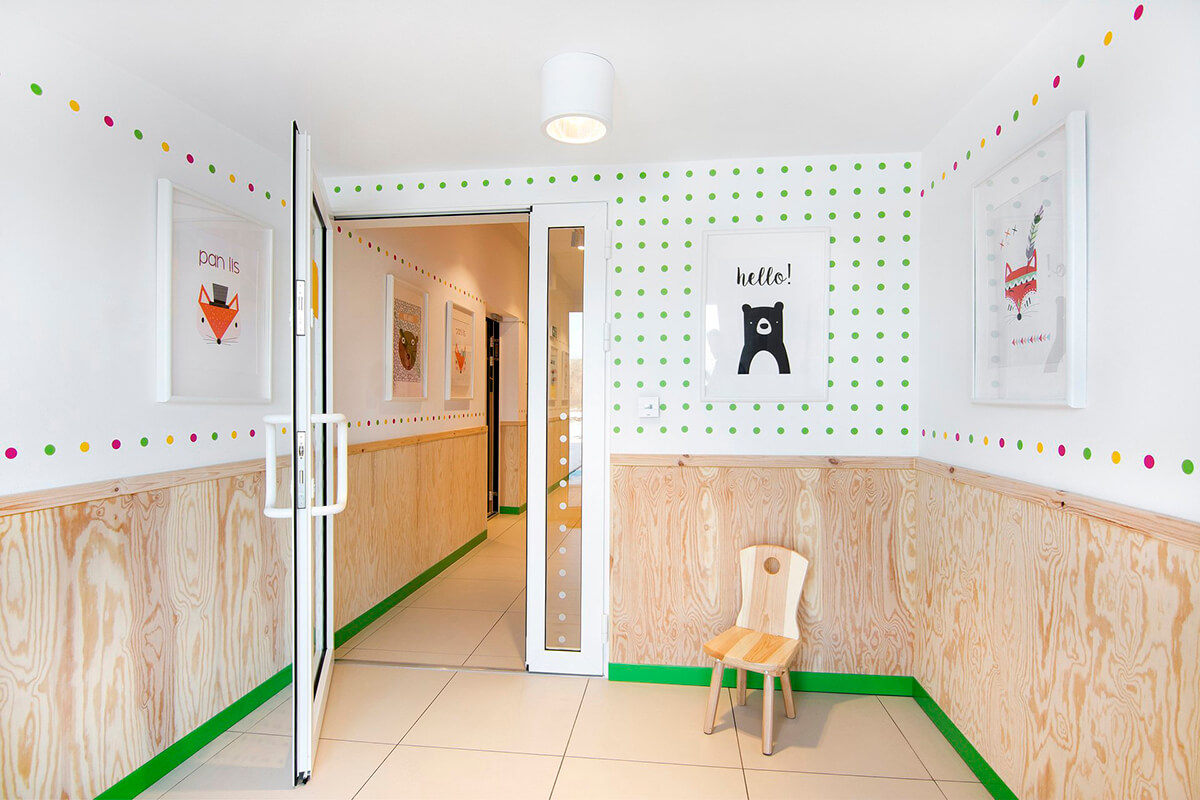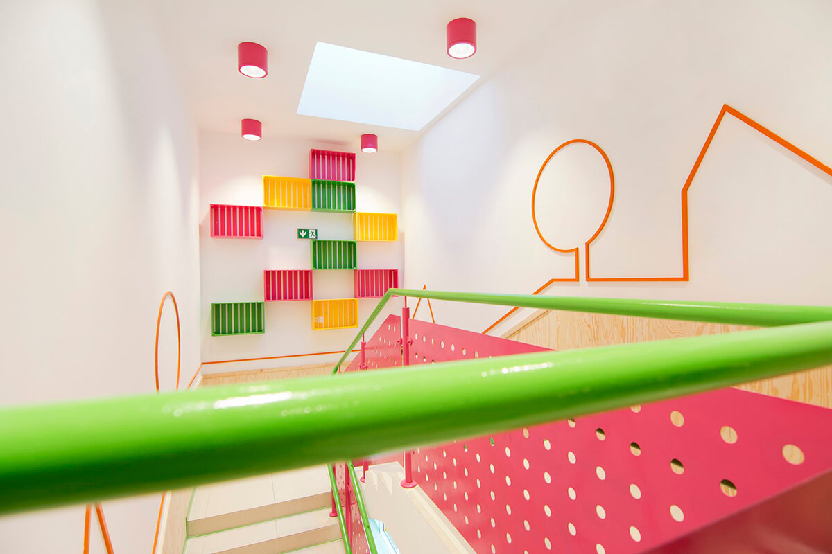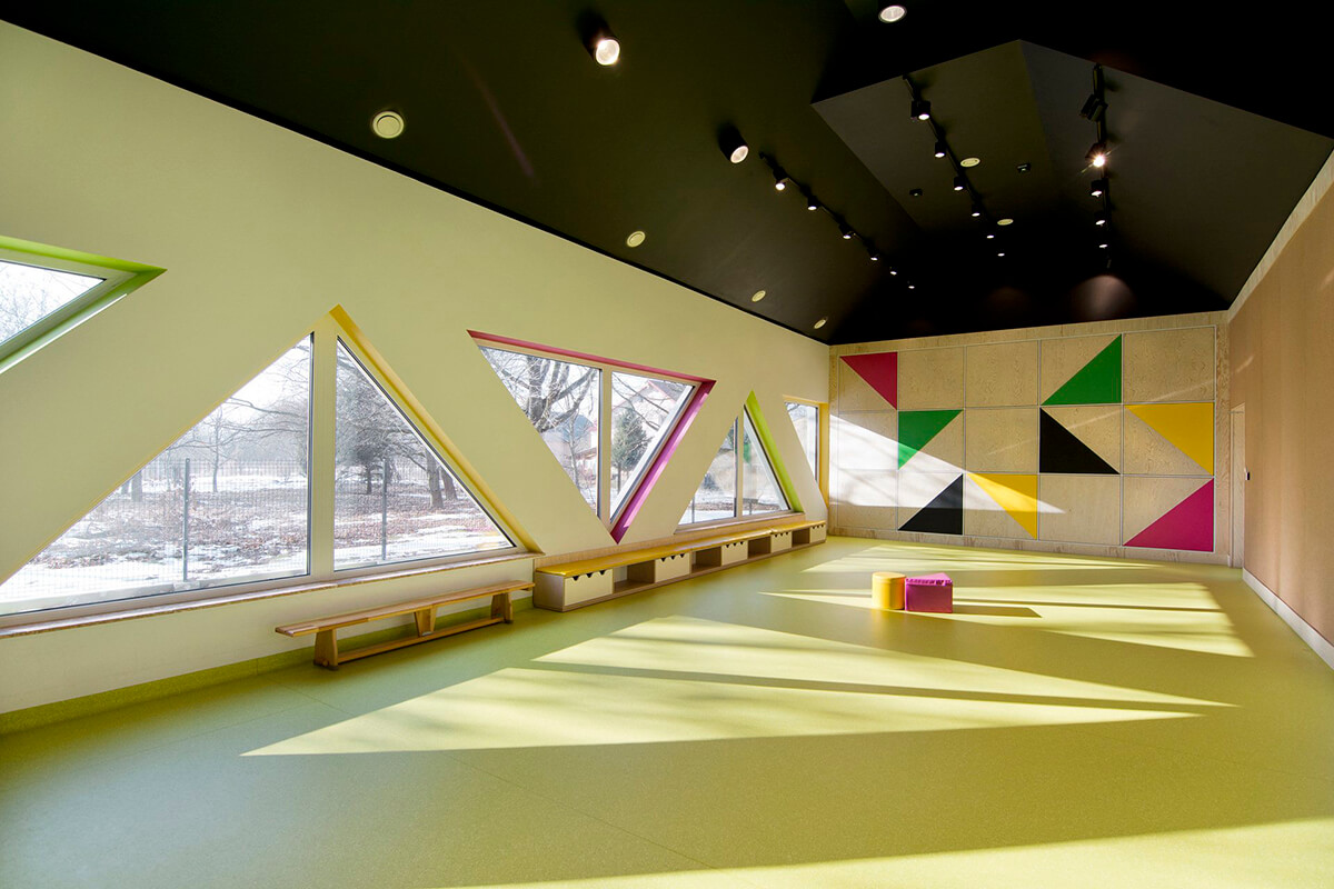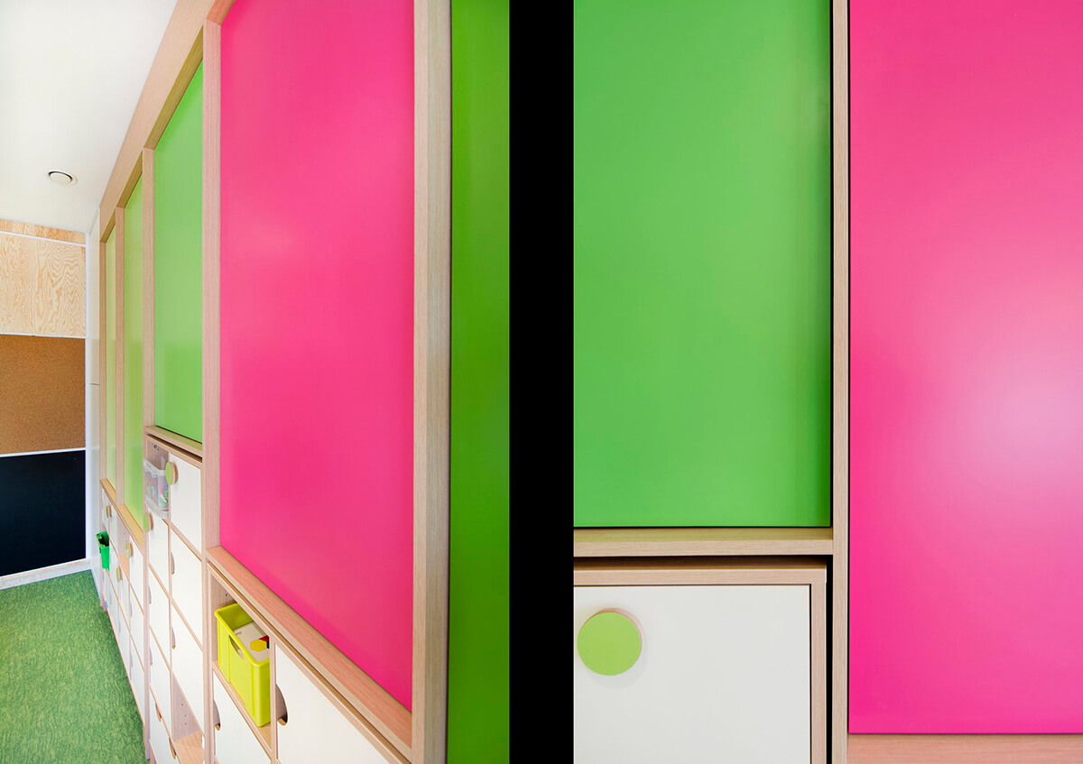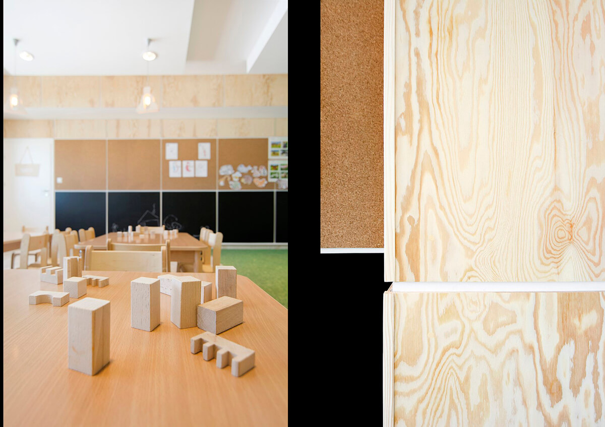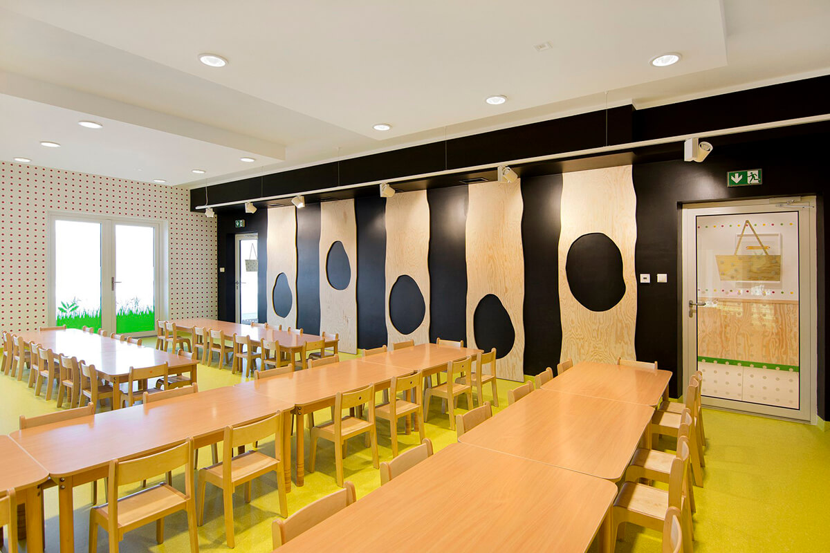W przedszkolu znaleźć można liczne wnęki i skrytki dla dzieci. Ich formy przywodzą na myśl charakterystyczne motywy leśne, czy wiejskie. Gama kolorystyczna złożona z odcieni żółci, pomarańczy i zieleni skontrastowana została z mocną magentą oraz czarnymi powierzchniami farby tablicowej.