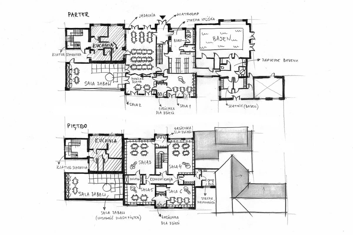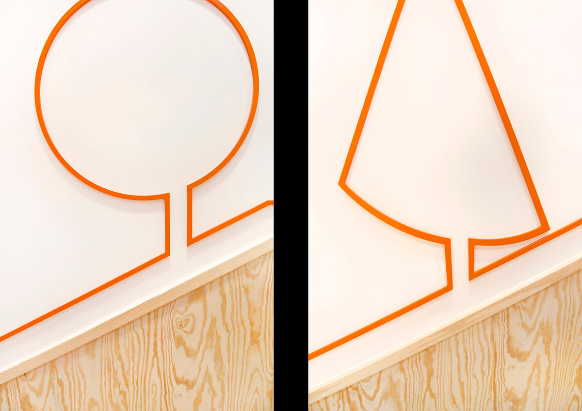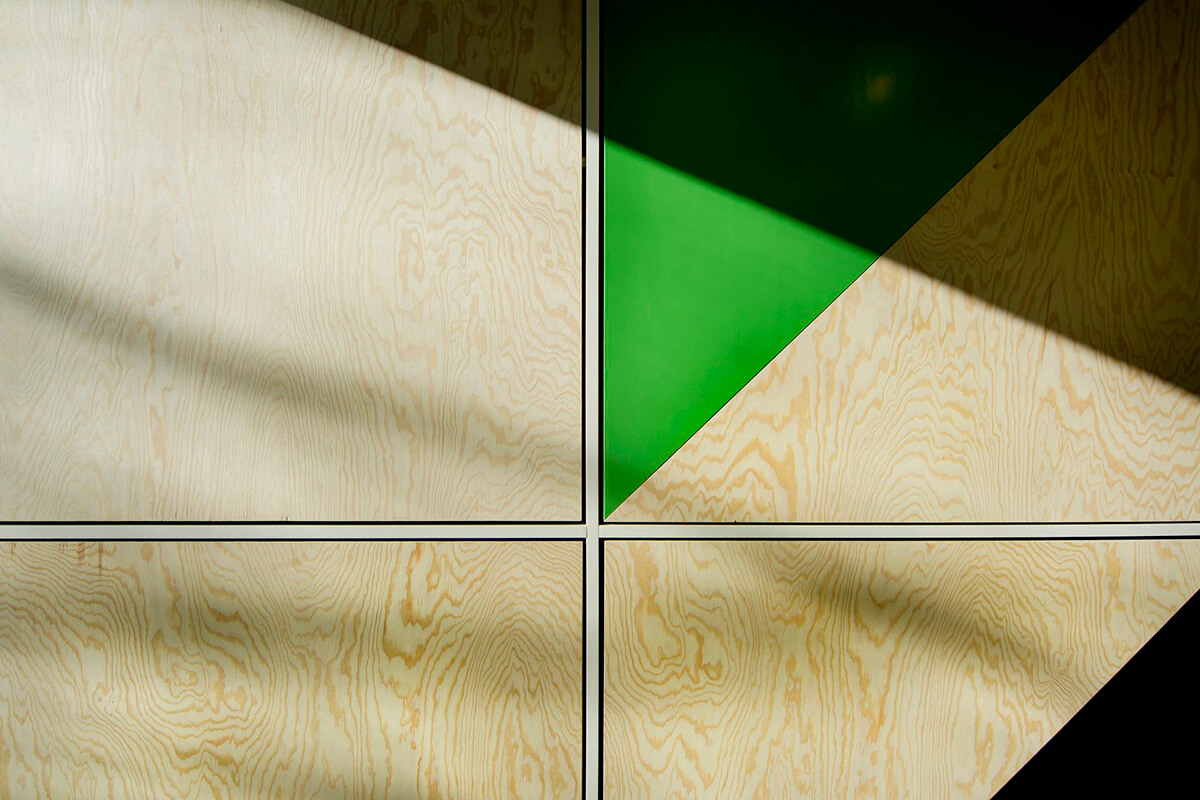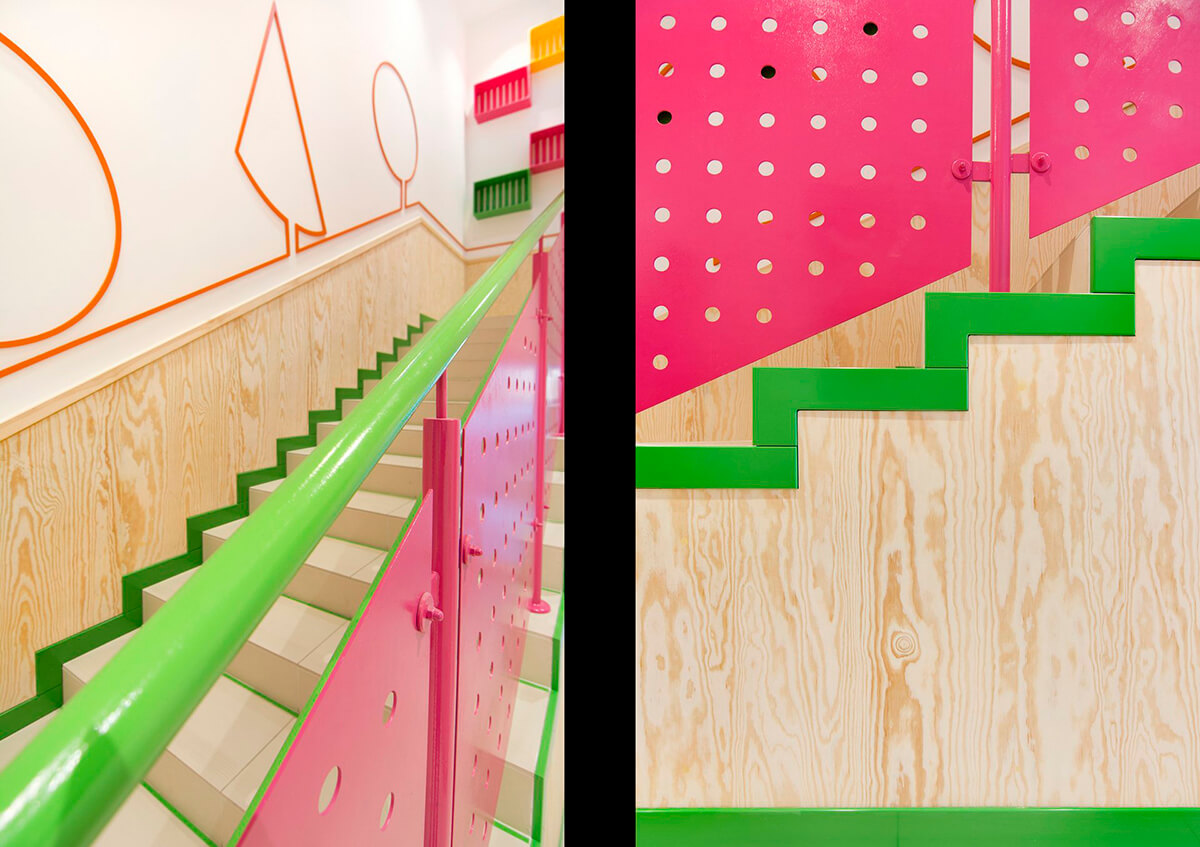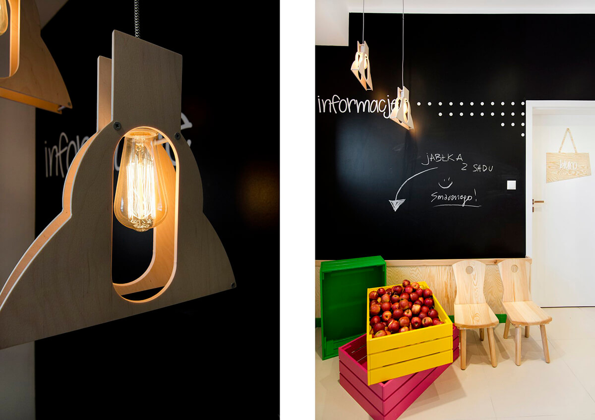 W przedszkolu znaleźć można liczne wnęki i skrytki dla dzieci. Ich formy przywodzą na myśl charakterystyczne motywy leśne, czy wiejskie. Gama kolorystyczna złożona z odcieni żółci, pomarańczy i zieleni skontrastowana została z mocną magentą oraz czarnymi powierzchniami farby tablicowej.
