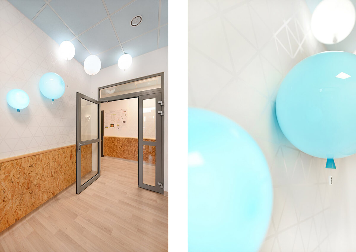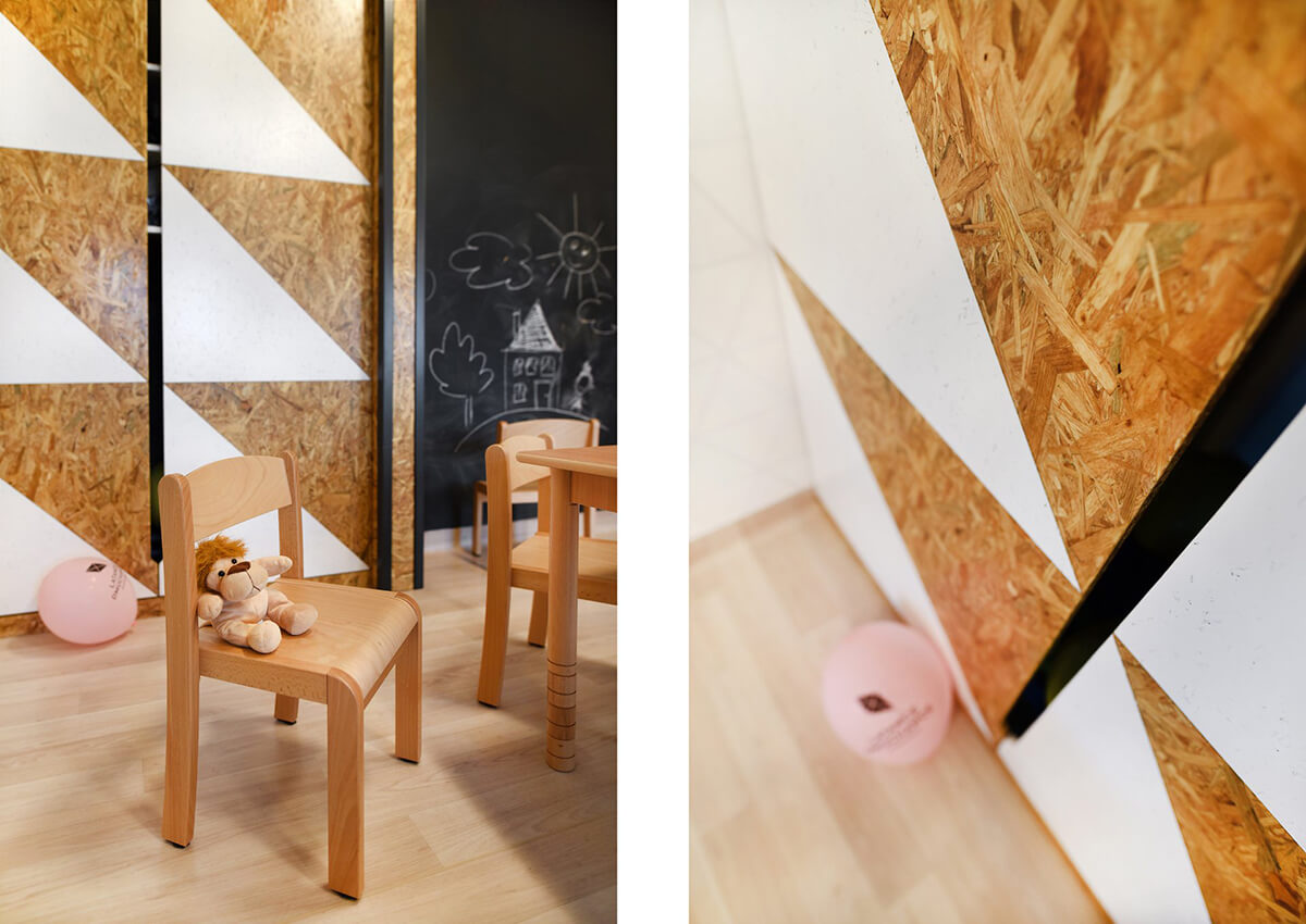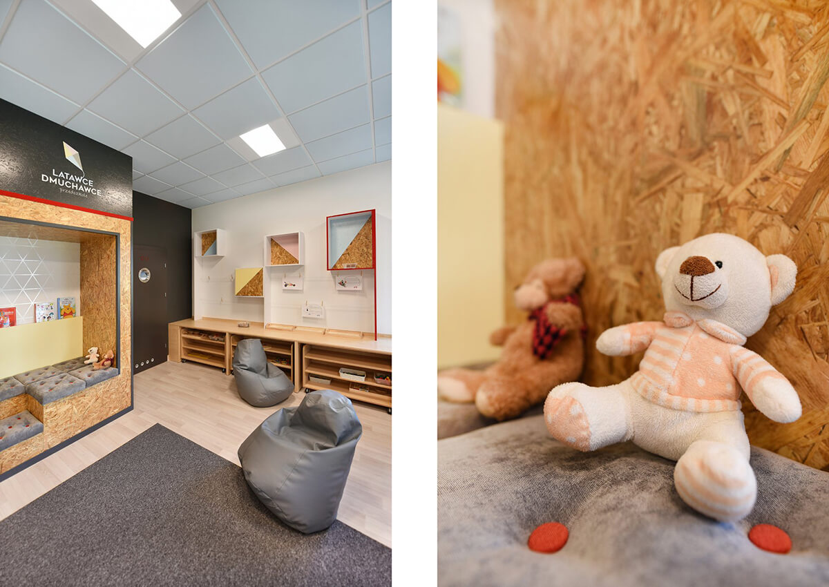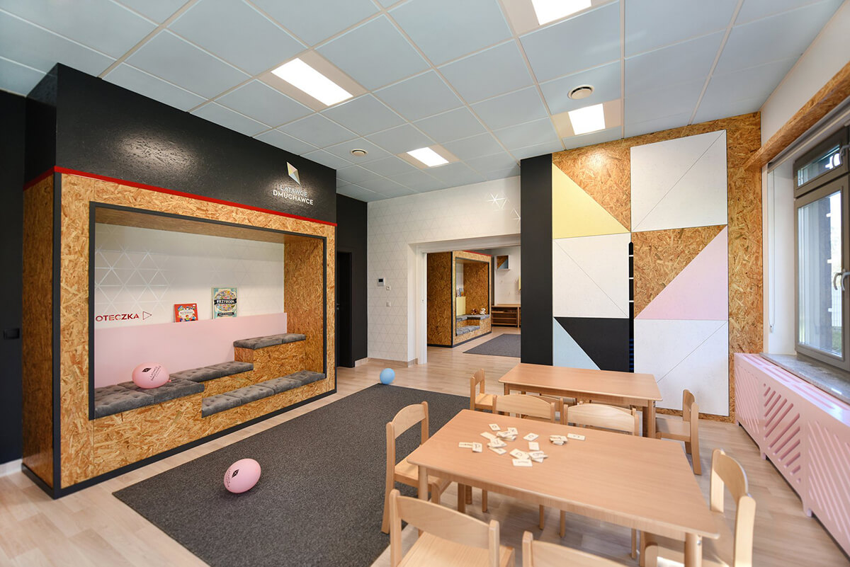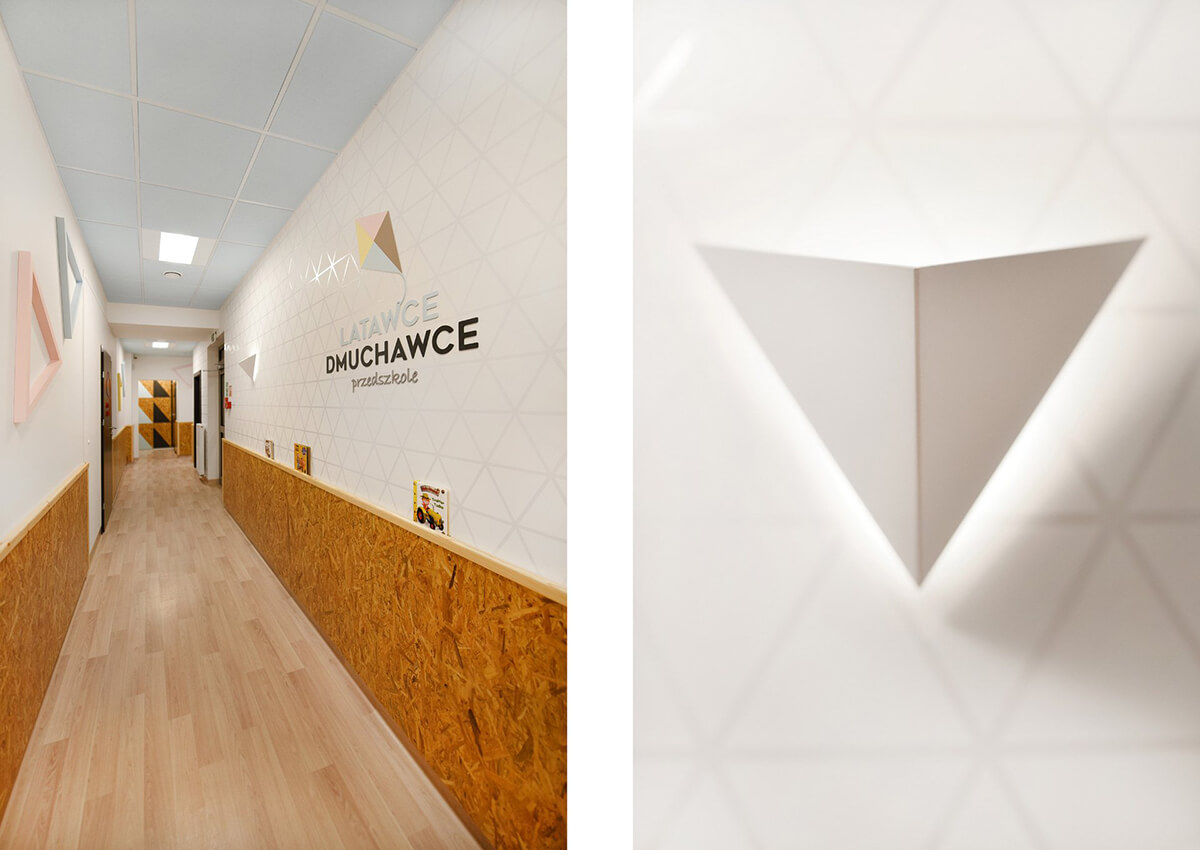 Dla estetyki wnętrza wiodącym motywem przewodnim stał się latawiec i jego trójkątny kształt. Występuje jako element tworzący podziały na frontach szaf, perforacjach w zabudowach grzejników, czy dyskretnych, połyskliwych foliach samoprzylepnych, wypełniających białe ściany sal dla dzieci.