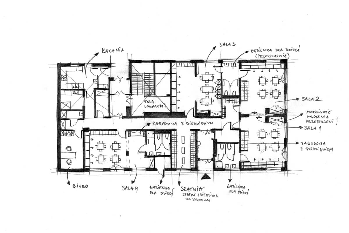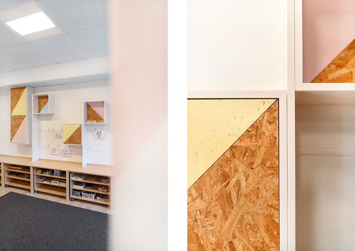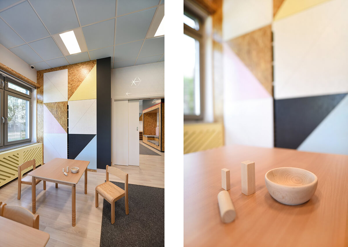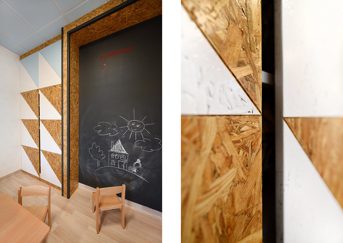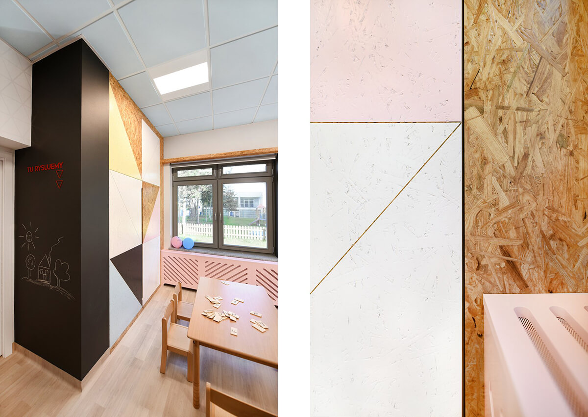 Dla estetyki wnętrza wiodącym motywem przewodnim stał się latawiec i jego trójkątny kształt. Występuje jako element tworzący podziały na frontach szaf, perforacjach w zabudowach grzejników, czy dyskretnych, połyskliwych foliach samoprzylepnych, wypełniających białe ściany sal dla dzieci.