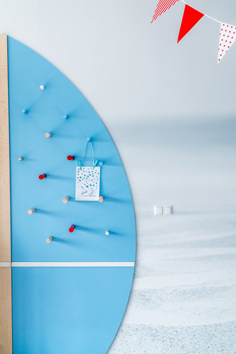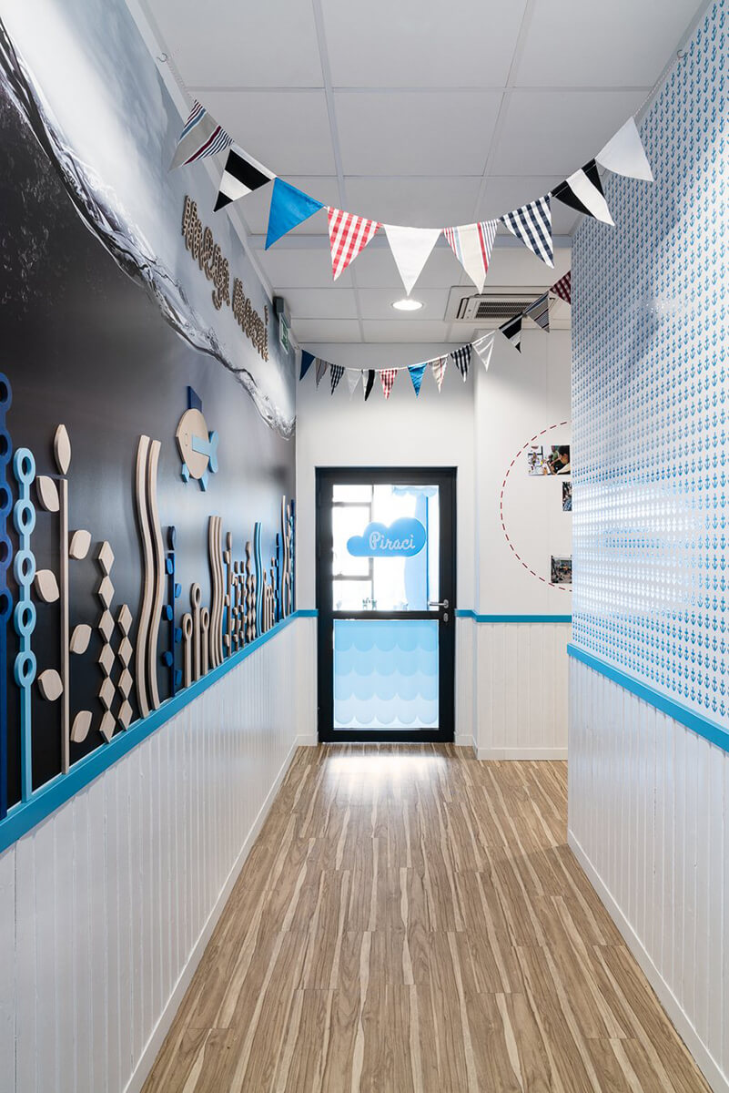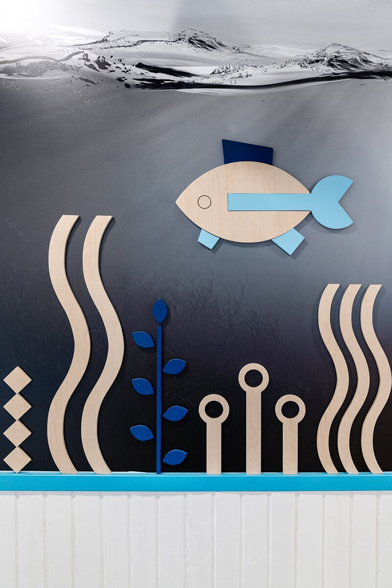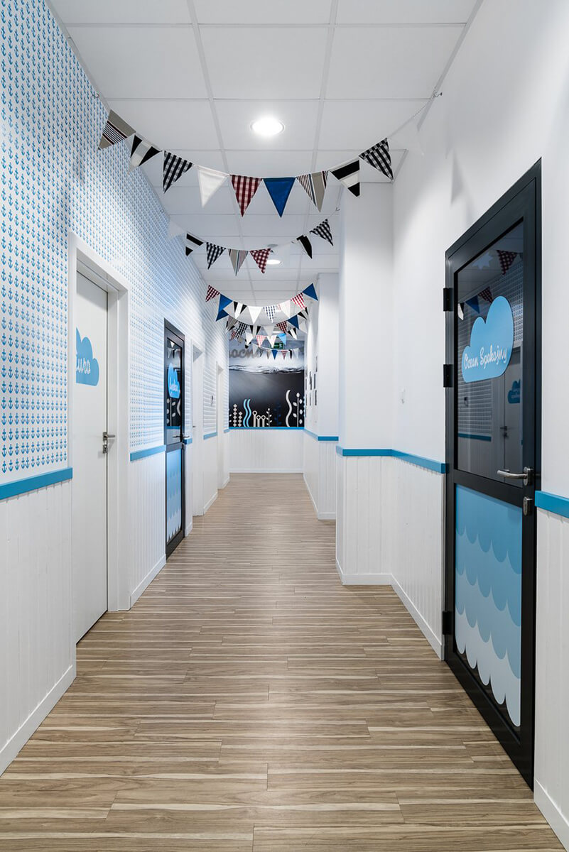 Wnętrza inspirowane są zatem charakterystycznymi motywami marynistycznymi, plażowymi, odnosząc się również do nastroju panującego w urokliwych cukierniach, czy lodziarniach. Pastelowa tonacja kolorów, łącząca biele, błękity i akcenty czerwone wraz z jasnym, naturalnym drewnem, skontrastowana została z wielkoformatowymi, czarno-białymi zdjęciami motywów nadmorskich, pokrytymi bajkowymi postaciami i dekoracjami. Aplikacje te zostały wykonane ze skejki oraz kolorowego plexi. Są syntetyczną interpretacją znanych dzieciom kształtów, pobudzając tym samym ich wyobraźnię.