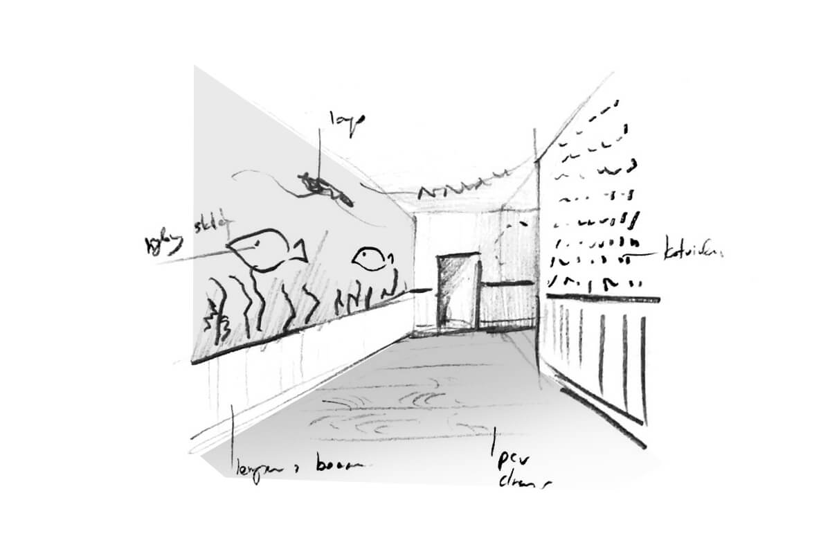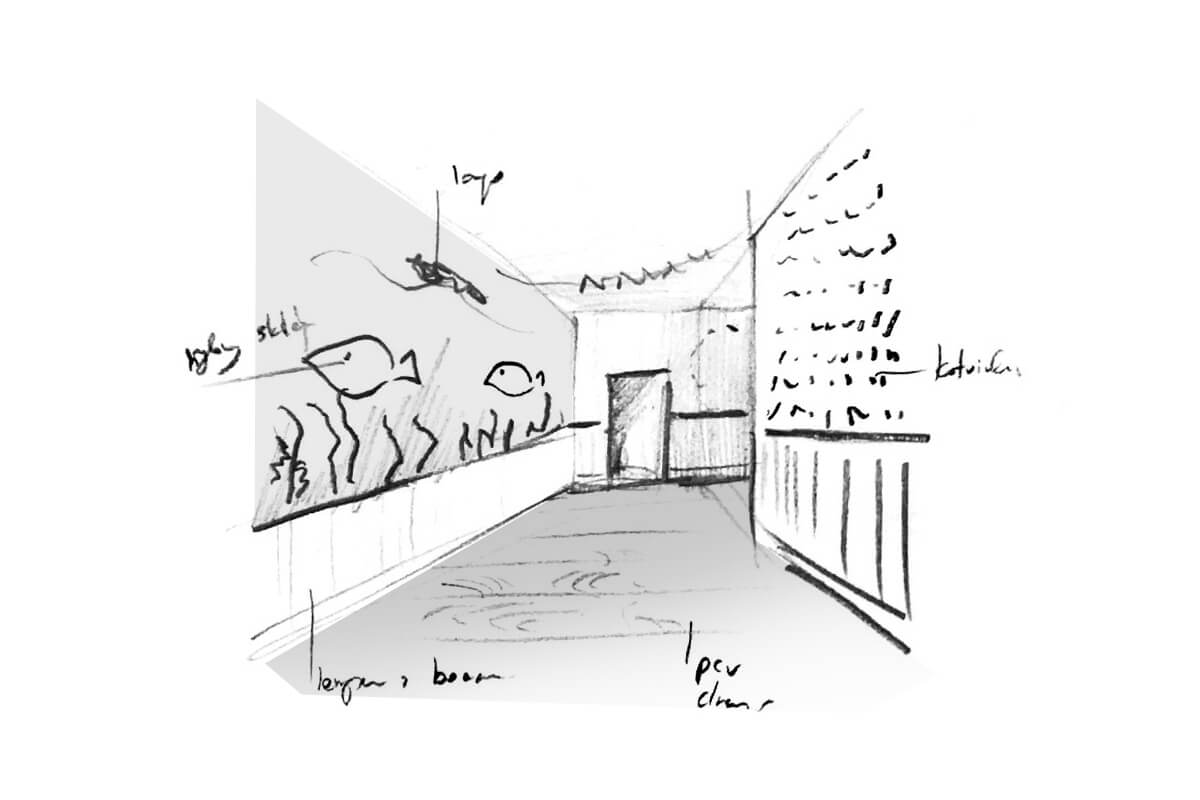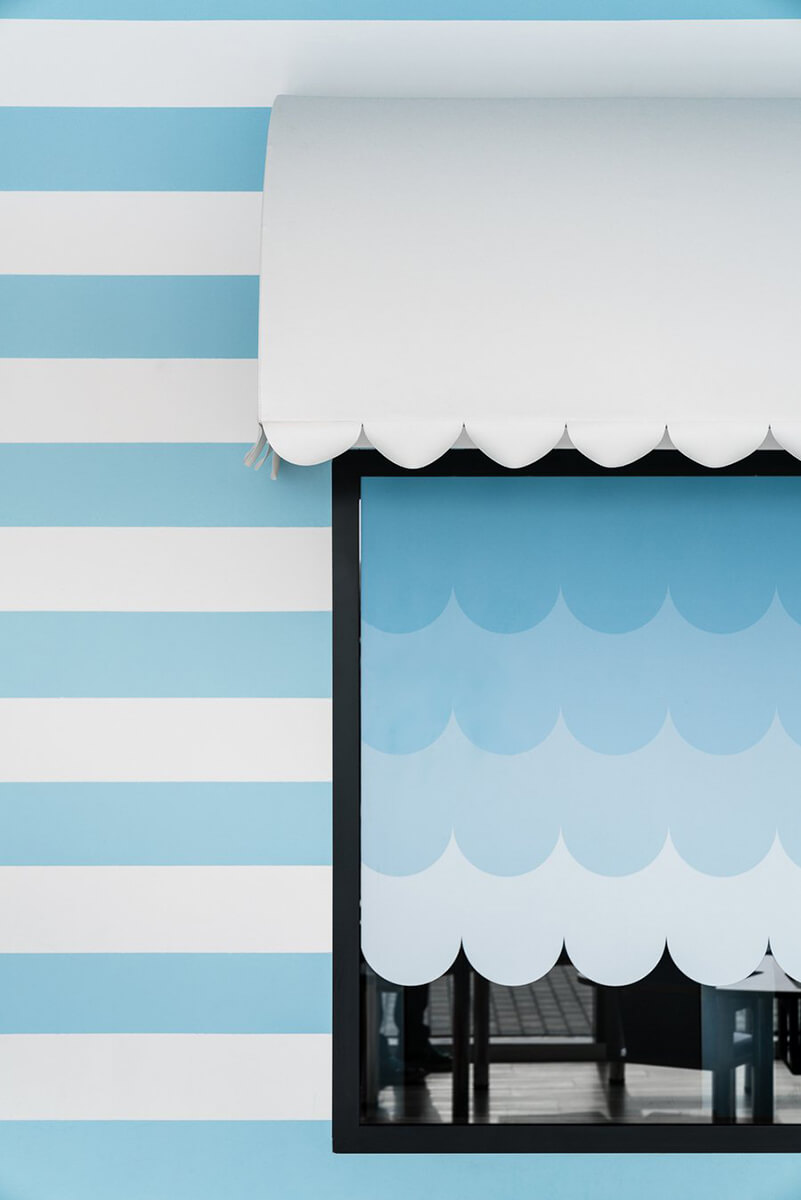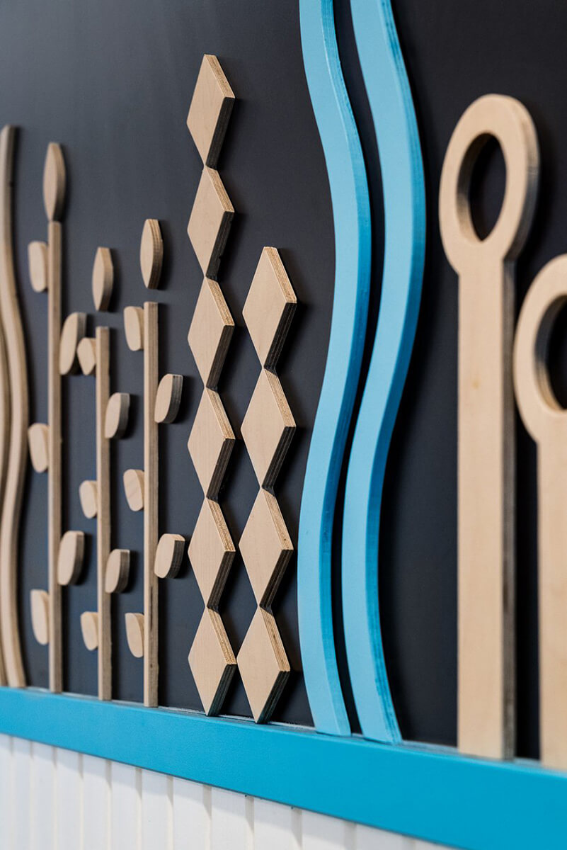 Wnętrza inspirowane są zatem charakterystycznymi motywami marynistycznymi, plażowymi, odnosząc się również do nastroju panującego w urokliwych cukierniach, czy lodziarniach. Pastelowa tonacja kolorów, łącząca biele, błękity i akcenty czerwone wraz z jasnym, naturalnym drewnem, skontrastowana została z wielkoformatowymi, czarno-białymi zdjęciami motywów nadmorskich, pokrytymi bajkowymi postaciami i dekoracjami. Aplikacje te zostały wykonane ze skejki oraz kolorowego plexi. Są syntetyczną interpretacją znanych dzieciom kształtów, pobudzając tym samym ich wyobraźnię.