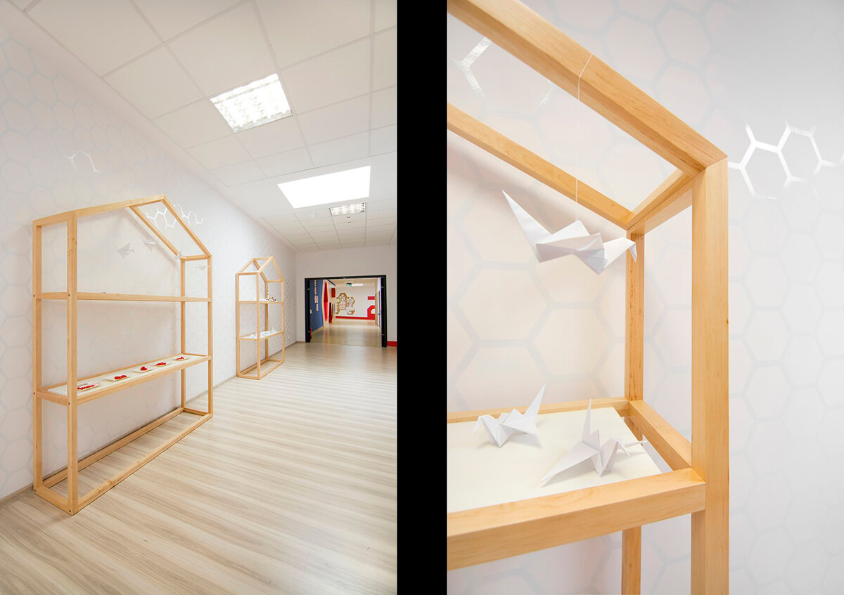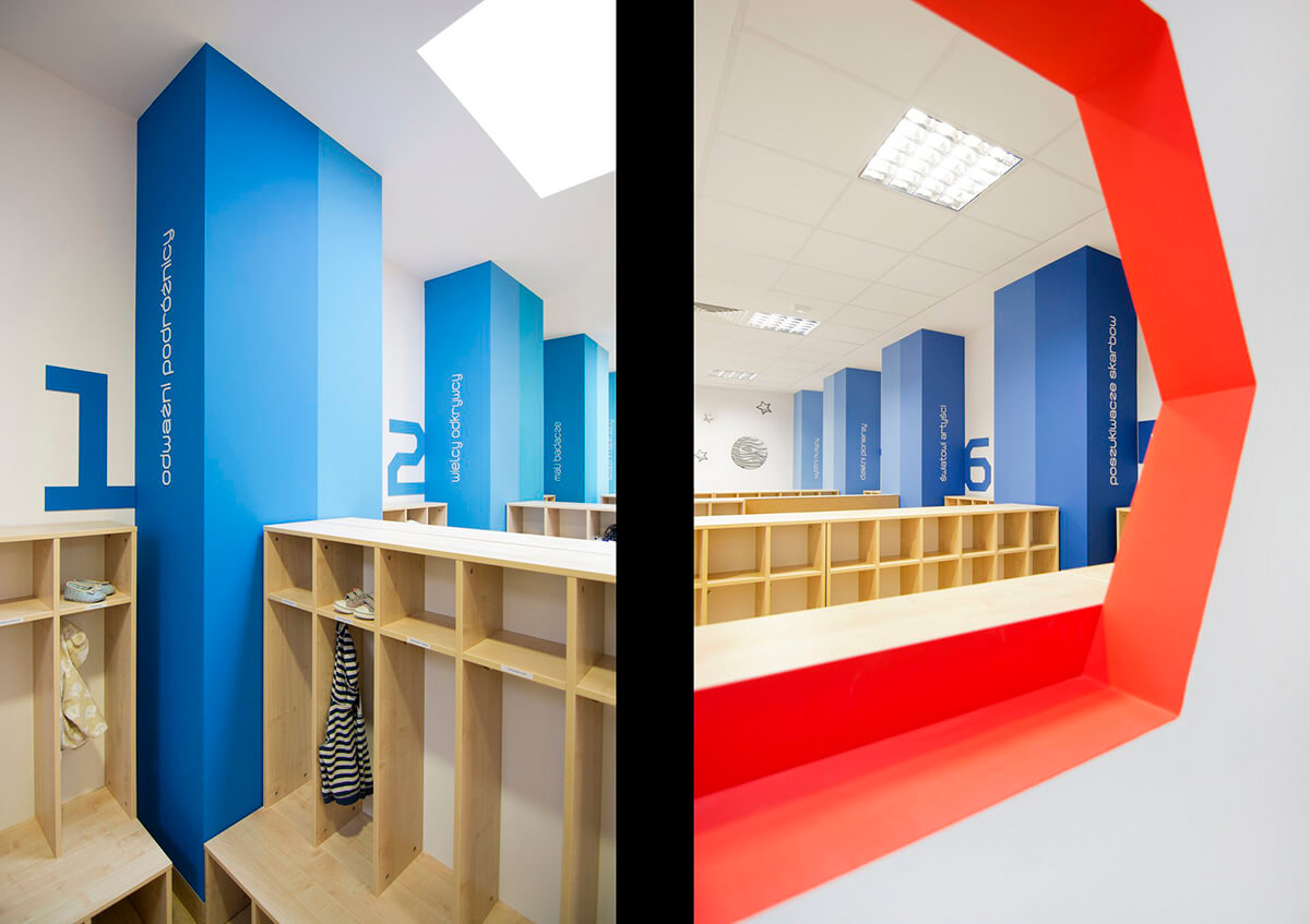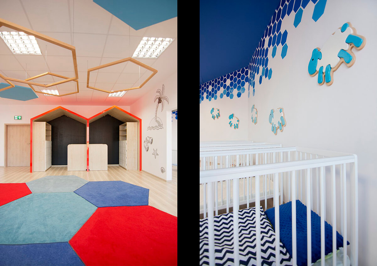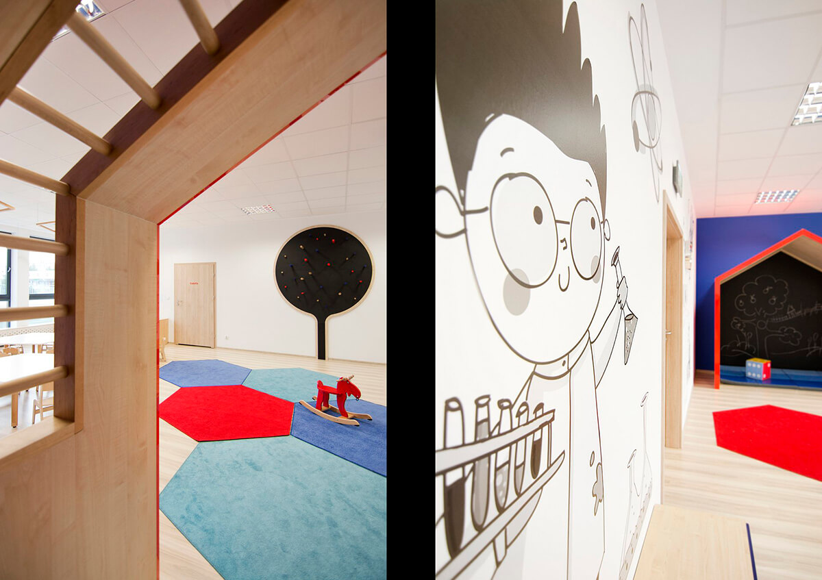 Charakterystycznymi miejscami w salach dla dzieci są czerwone domki do zabawy, wyposażone w materace, ścianę tablicową oraz drabinki. W projekcie przedszkola kluczowa była identyfikacja wizualna wnętrza, która tworzy interesujący efekt graficzny, ale przede wszystkim ułatwia poruszanie się po przedszkolu.