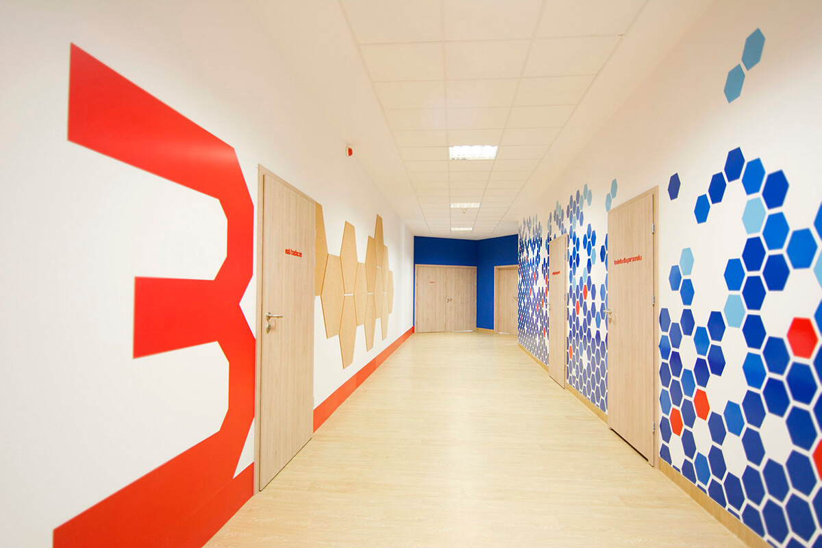 Projekt wnętrza zakładał stworzenie inspirującej przestrzeni, odnoszącej się w abstrakcyjny sposób do naukowego profilu placówki, wykorzystując w tym celu charakterystyczne motywy graficzne i ilustracje.