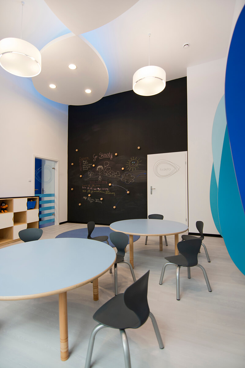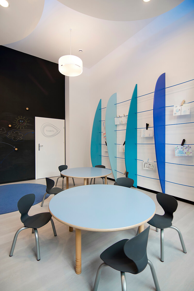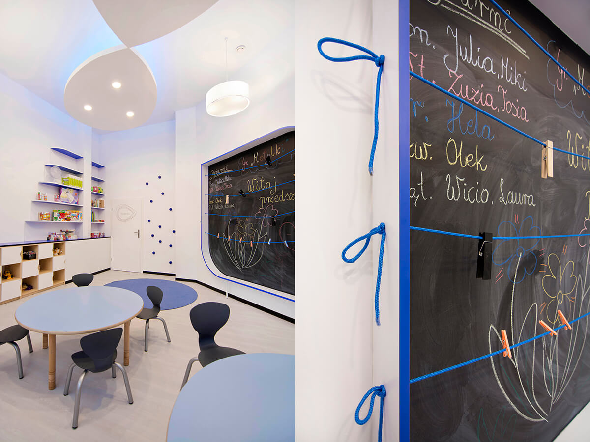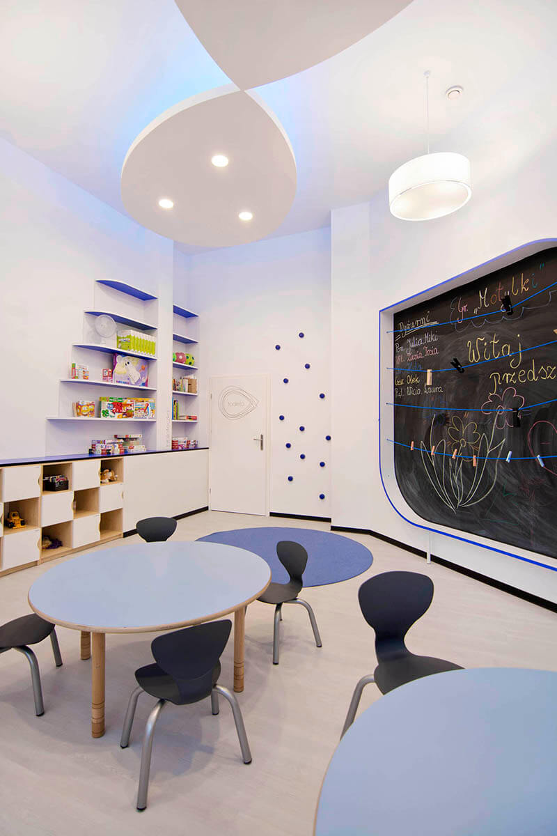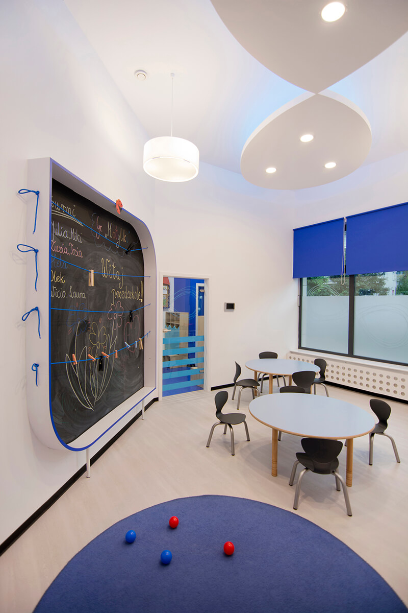 Projekt kameralnego przedszkola zakładał stworzenie jasnego i możliwie przestronnego wnętrza dla dzieci, mimo stosunkowo ograniczonej przestrzeni. Koncepcja plastyczna opiera się na prostocie i funkcjonalności, wykorzystując wyłącznie urozmaiconą gamę kolorów niebieskich, wystepujących na śnieżnobiałym tle ścian, malowanych zmywalną farbą.