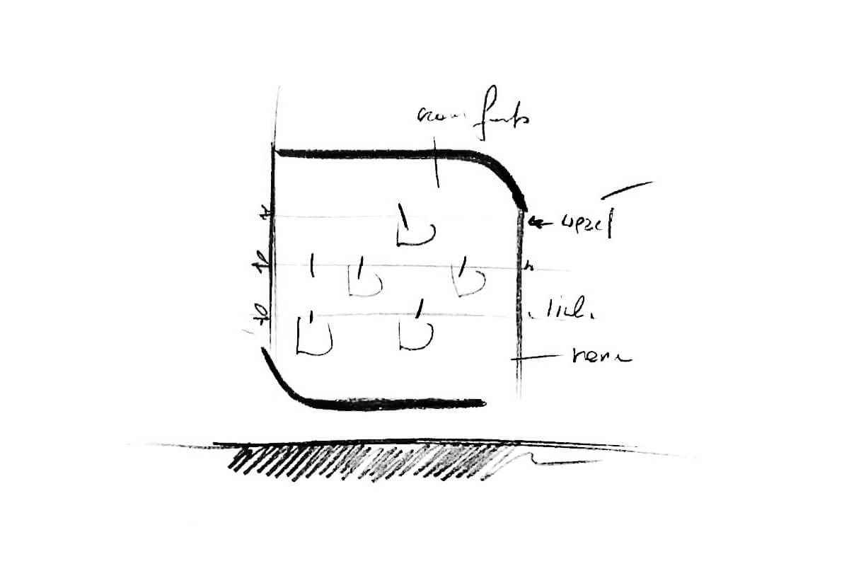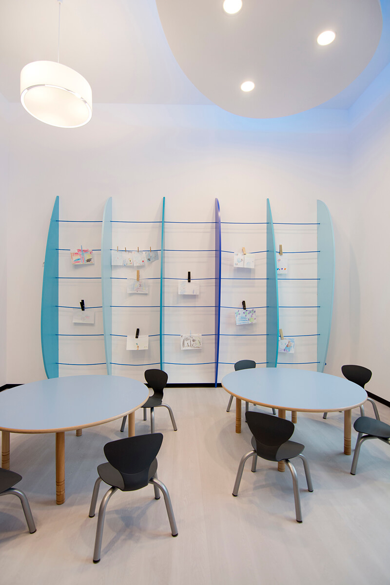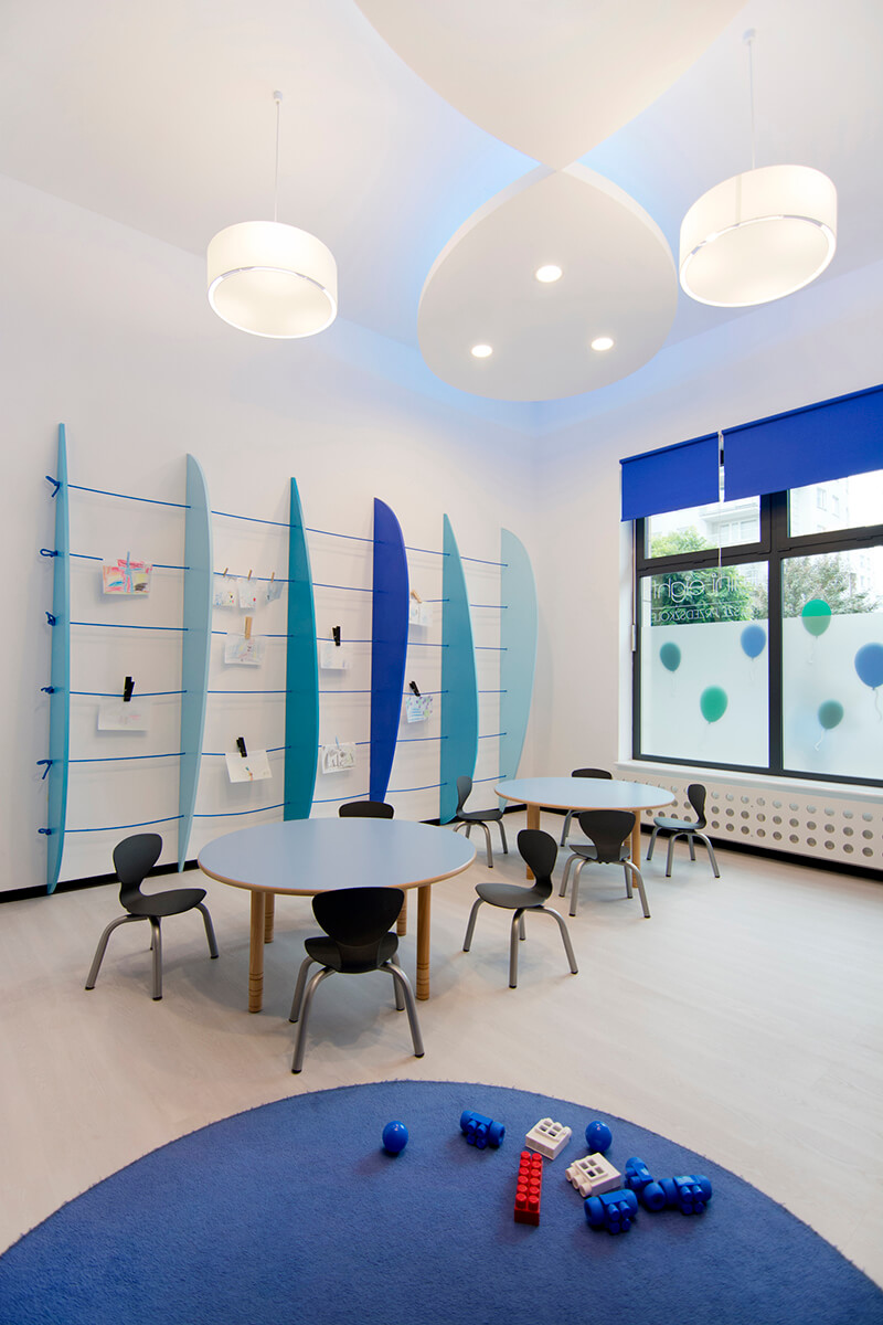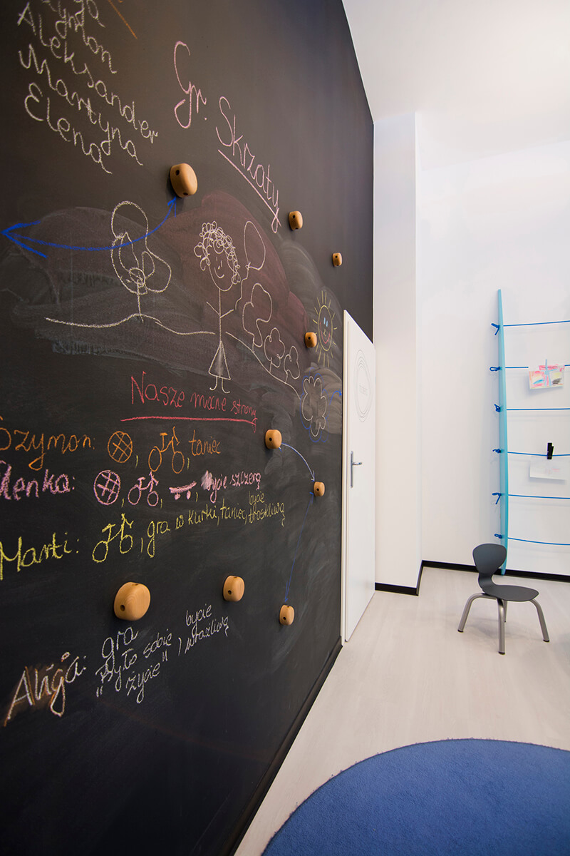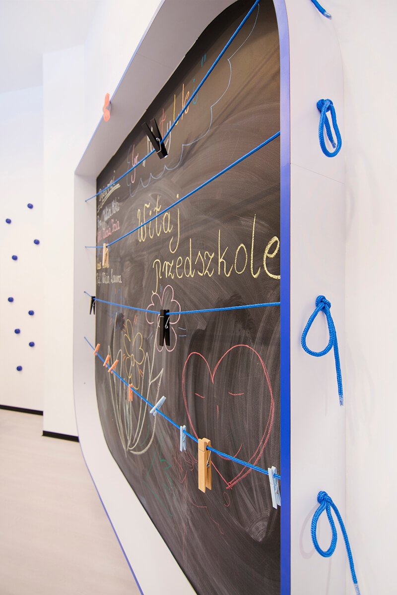 Projekt kameralnego przedszkola zakładał stworzenie jasnego i możliwie przestronnego wnętrza dla dzieci, mimo stosunkowo ograniczonej przestrzeni. Koncepcja plastyczna opiera się na prostocie i funkcjonalności, wykorzystując wyłącznie urozmaiconą gamę kolorów niebieskich, wystepujących na śnieżnobiałym tle ścian, malowanych zmywalną farbą.