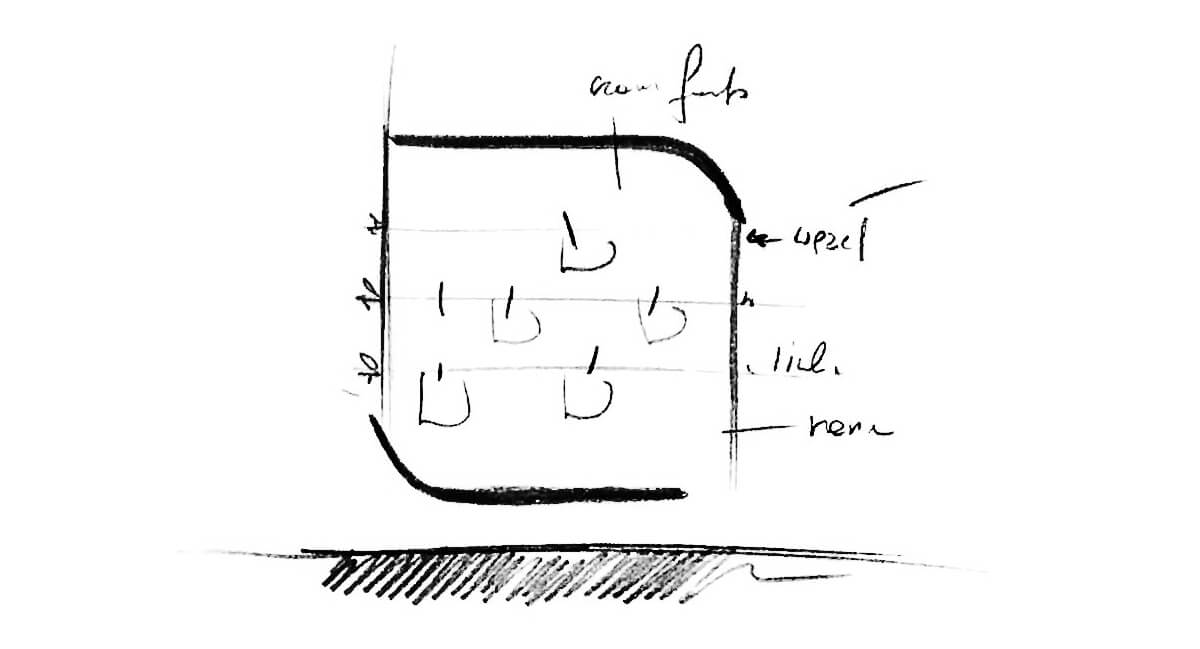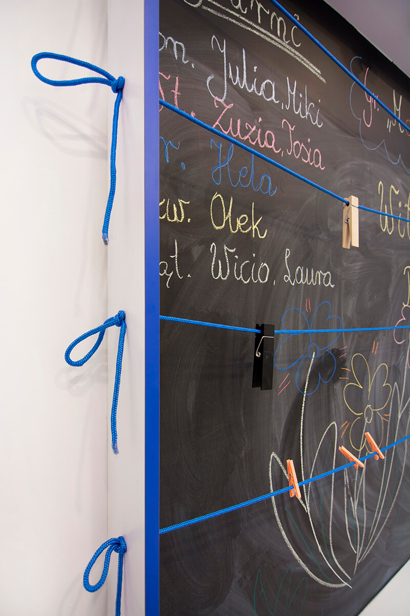 Zwracającym na siebie uwagę obiektem w sali jest także obudowana głęboką ramą czarna tablica kredowa, wyposażona dodatkowo także w linki z dużymi klamerkami. Wyjątkowa wysokość wnętrz została wykorzystana jako atut dzięki zastosowaniu dekoracyjnych sufitów podwieszanych wraz ze zintegrowanym oświetleniem LED RGB, dającym subtelne efekty kolorowej poświaty na stropie.