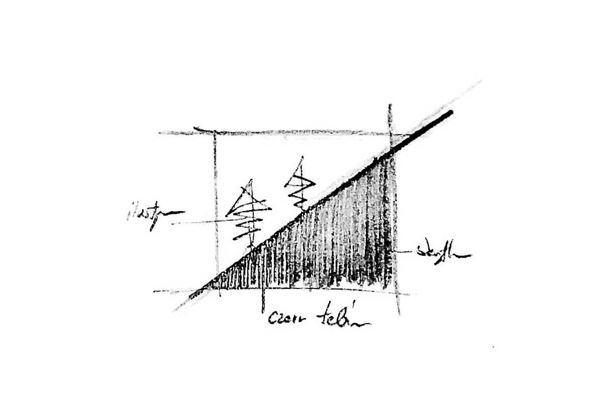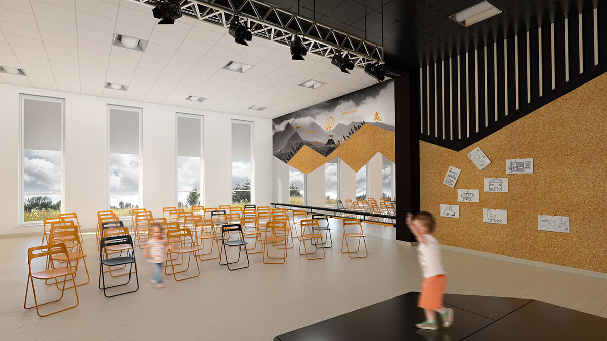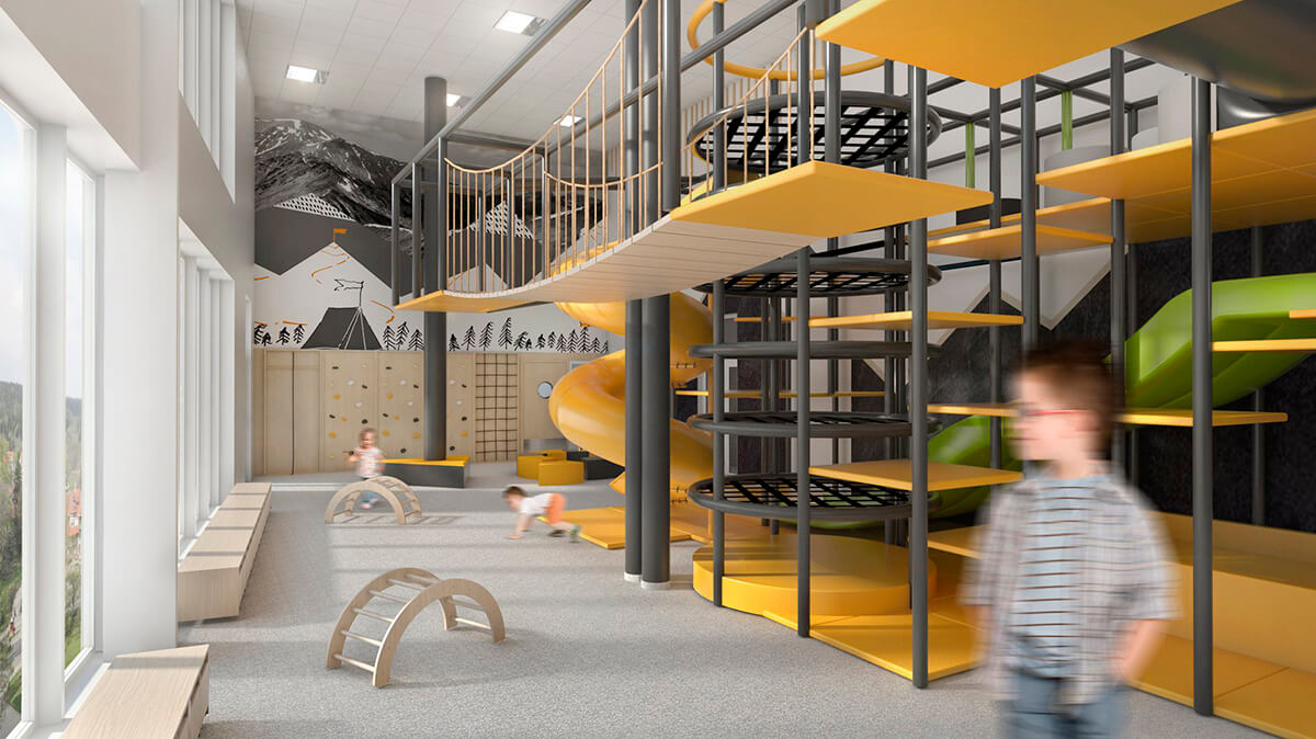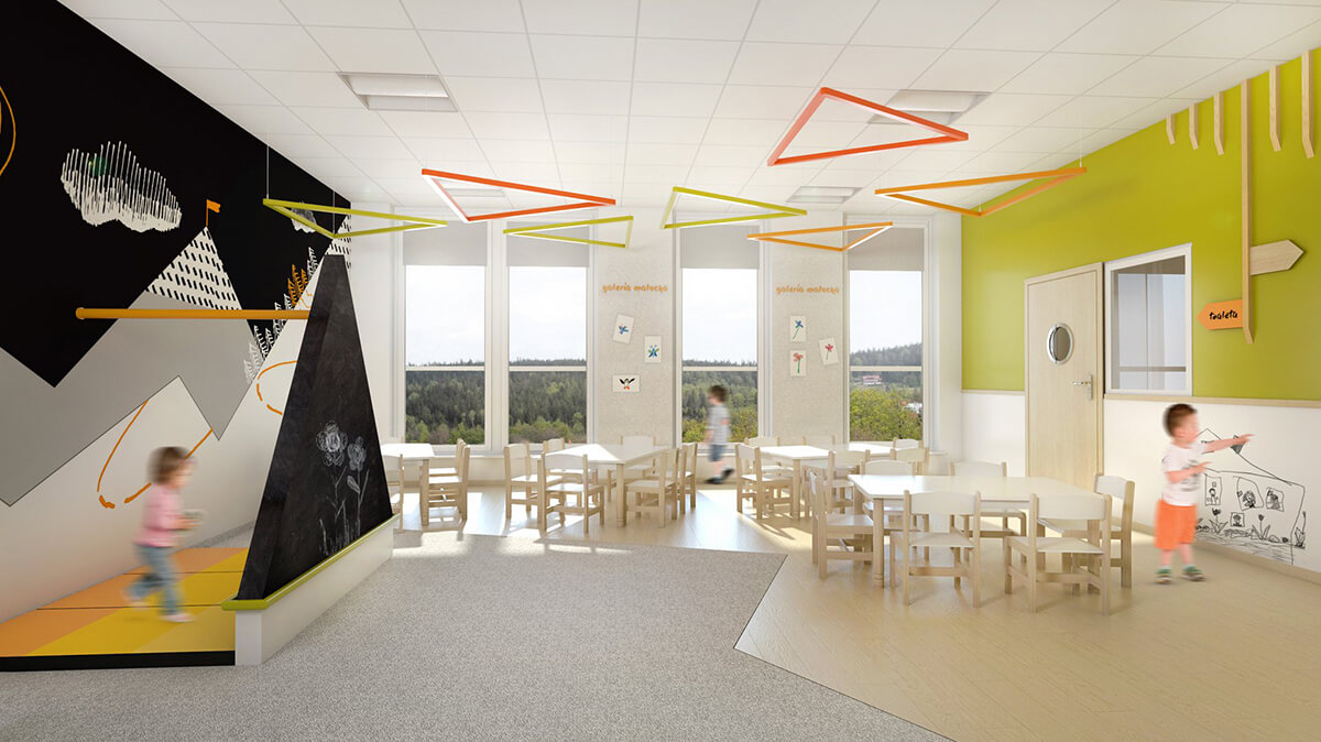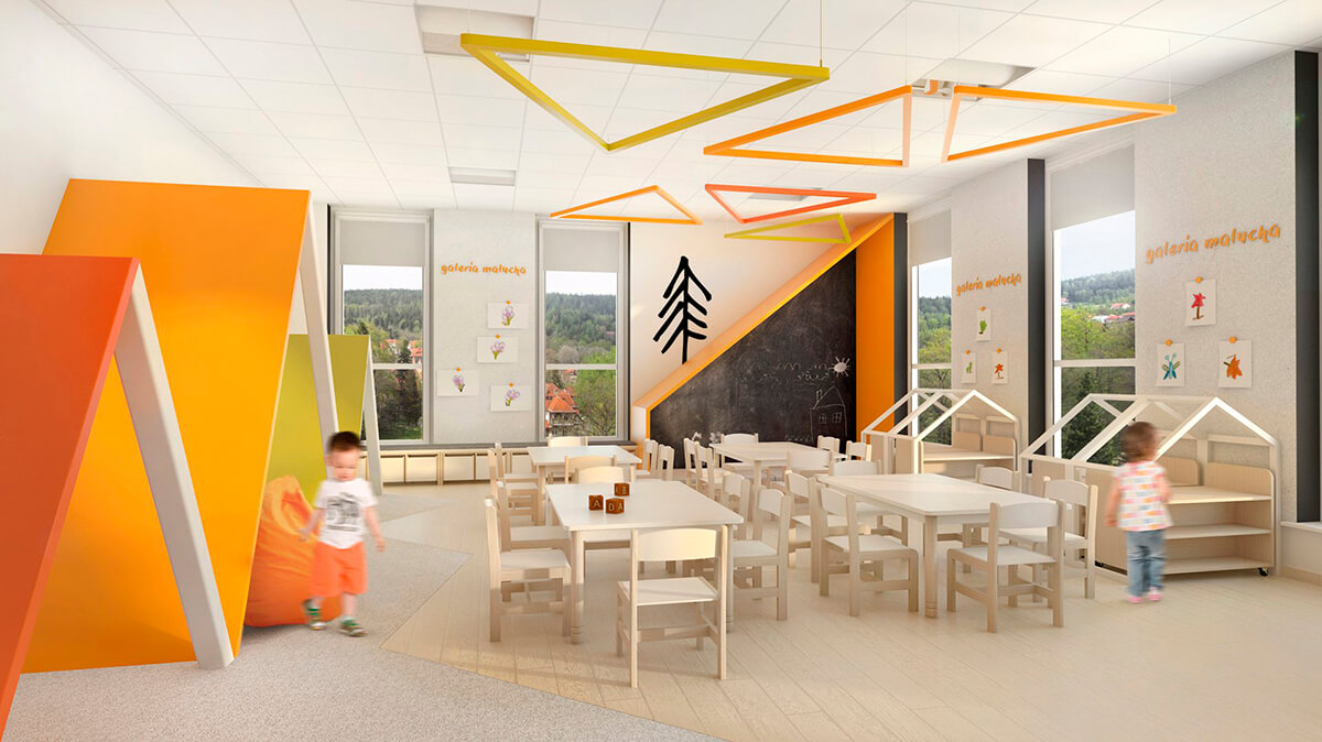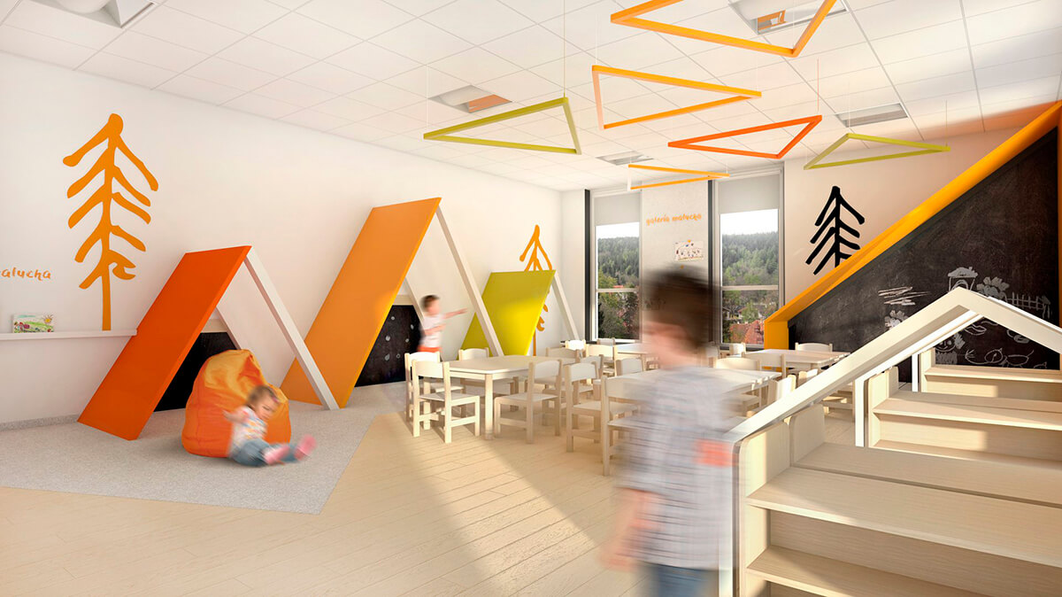 Architektura wnętrza placówki zdominowana została zatem przez skośne, trójkątne kształty, konotujące skojarzenia z uproszczonym rysunkiem gór, rysowanym zwykle przez dzieci.