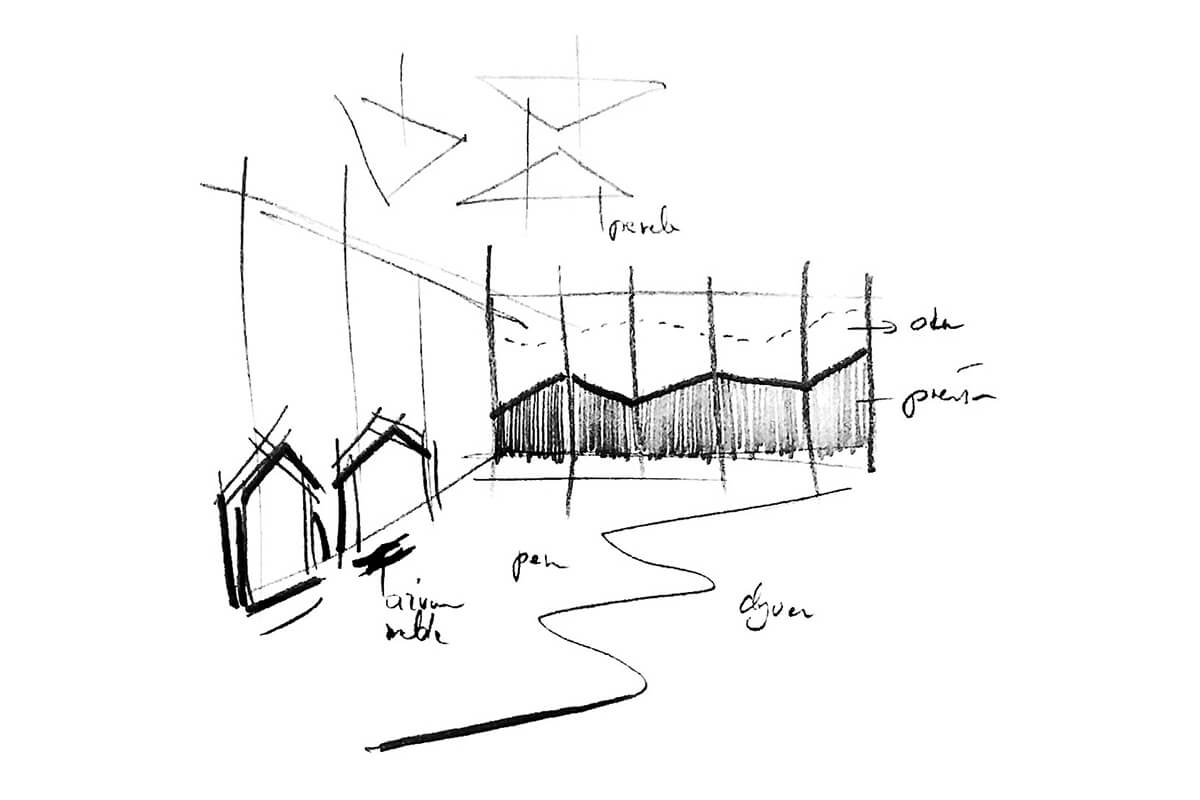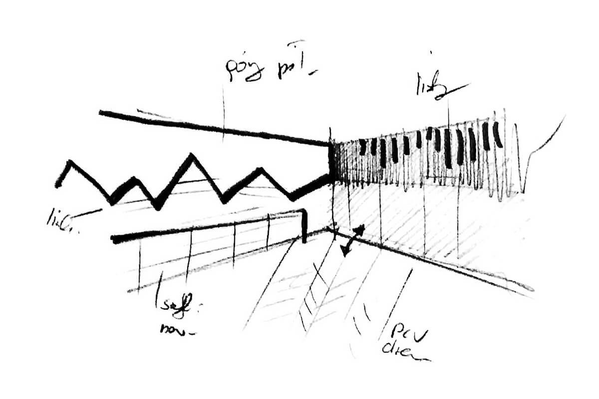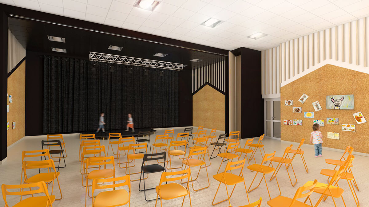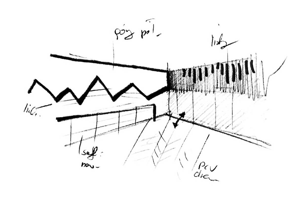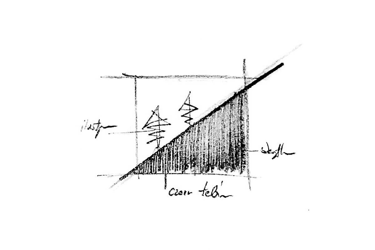 Architektura wnętrza placówki zdominowana została zatem przez skośne, trójkątne kształty, konotujące skojarzenia z uproszczonym rysunkiem gór, rysowanym zwykle przez dzieci.