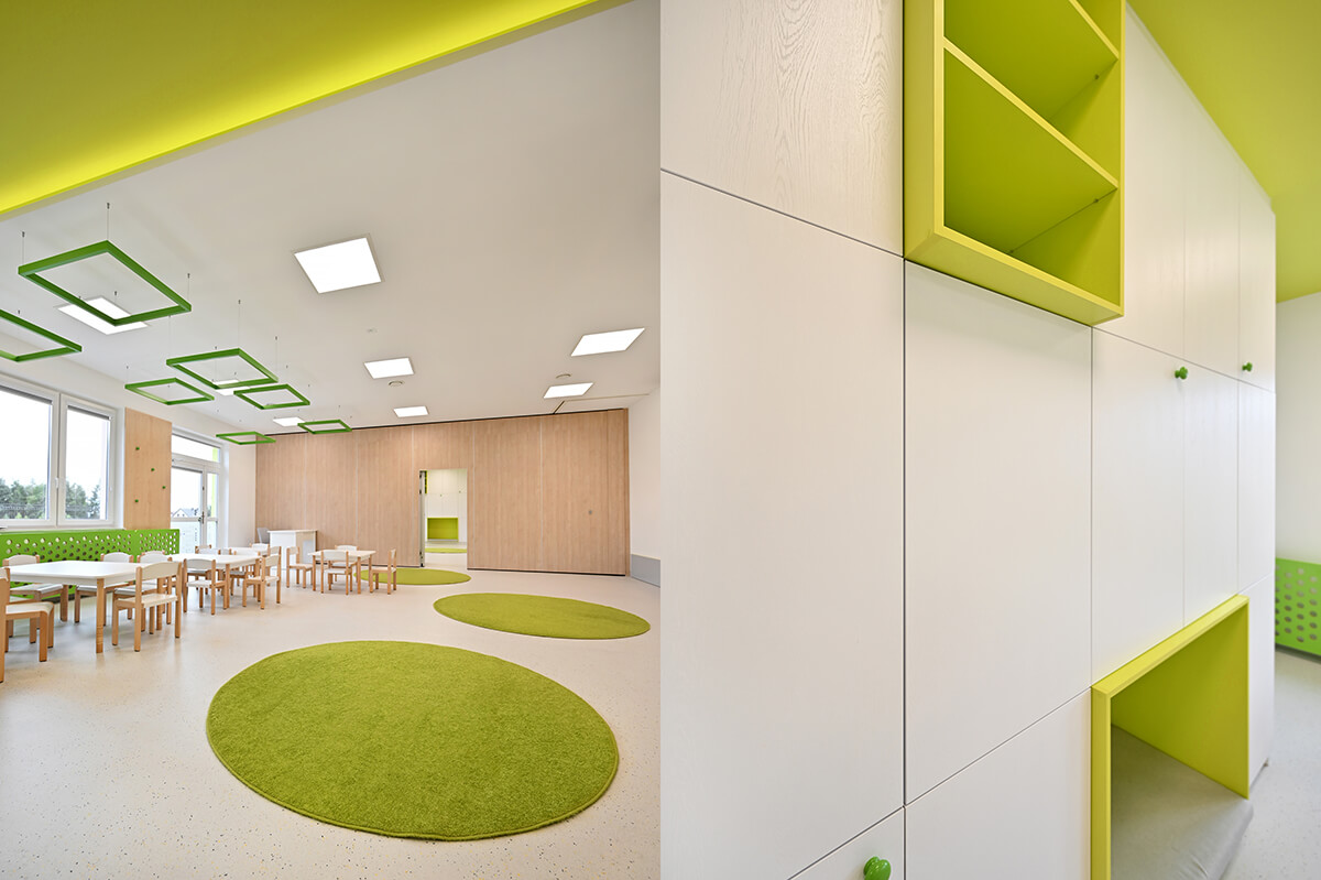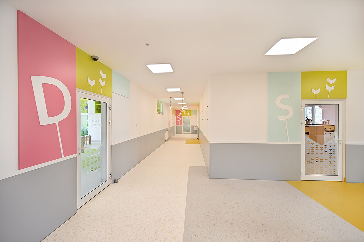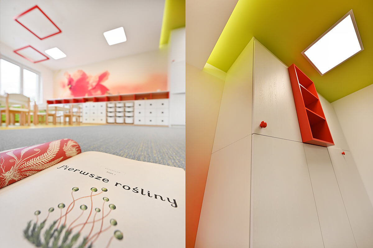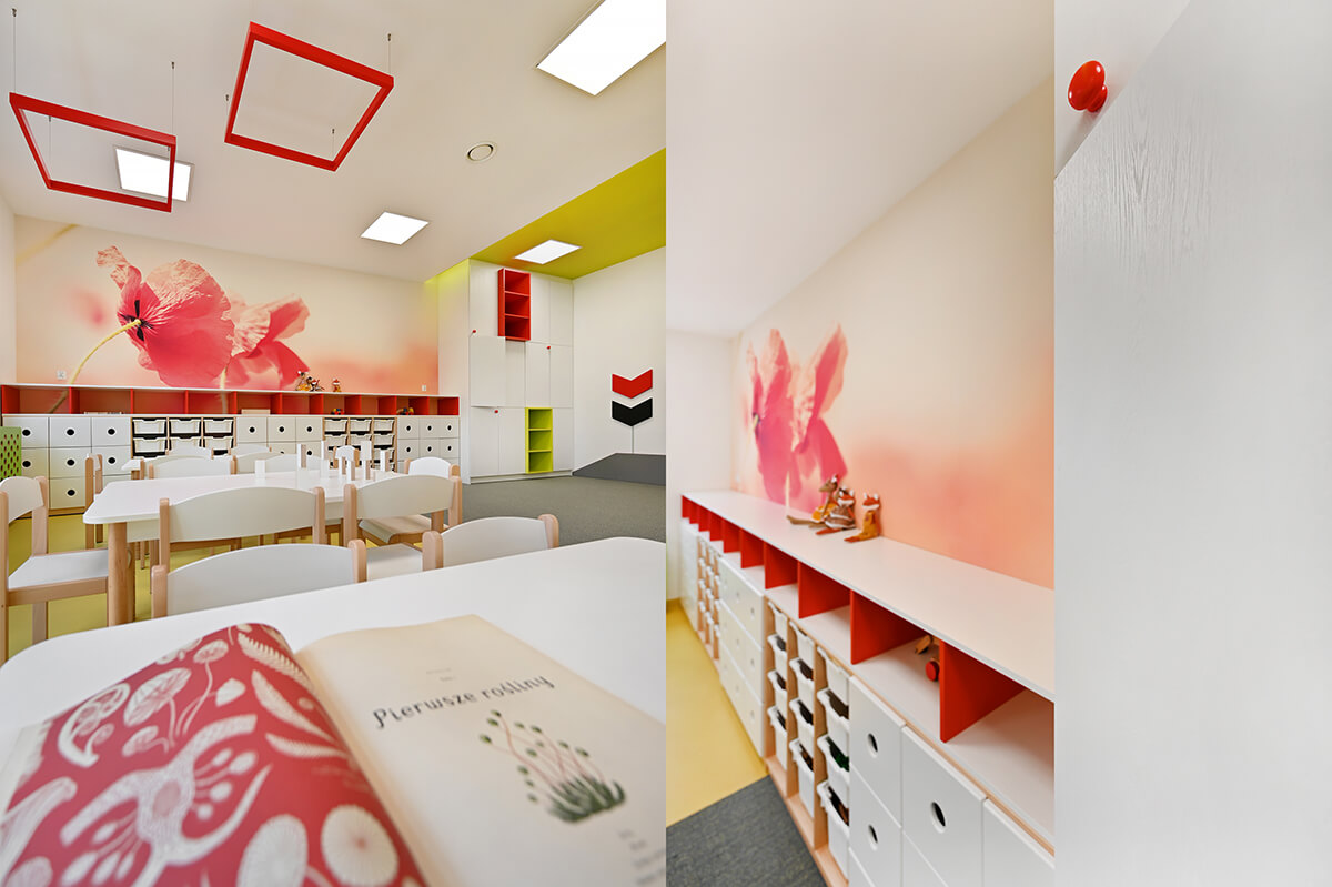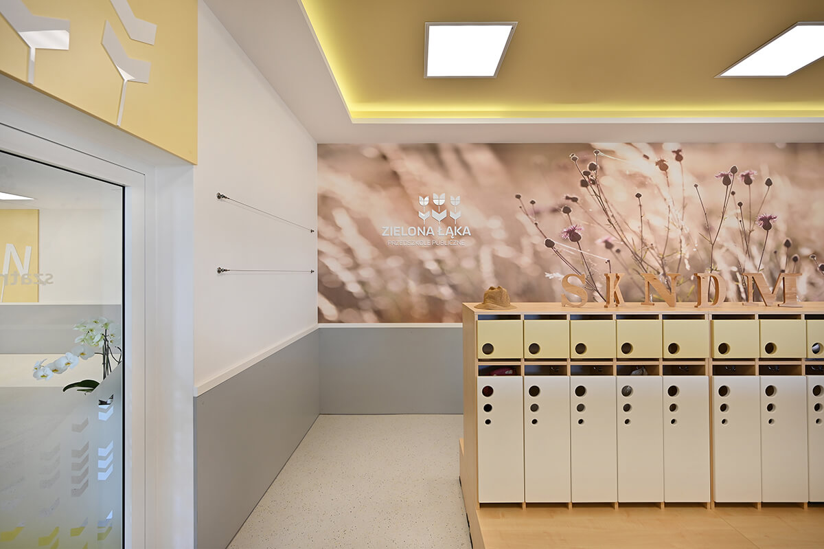 Projekt wnętrza przedszkola wraz z identyfikacją wizualną zakładał stworzenie przestrzeni mocno nasyconej inspiracjami z otaczających placówkę naturalnych krajobrazów. Zarówno gama kolorystyczna zdominowana przez biele, ale i obfitująca w oliwkowe zielenie skontrastowane z barwą czerwoną, czy malinową, jak i drewno w naturalnej barwie oraz proste, stonowane meble miały tworzyć harmonijną, przyjazną i pozytywną przestrzeń dla małych odkrywców.