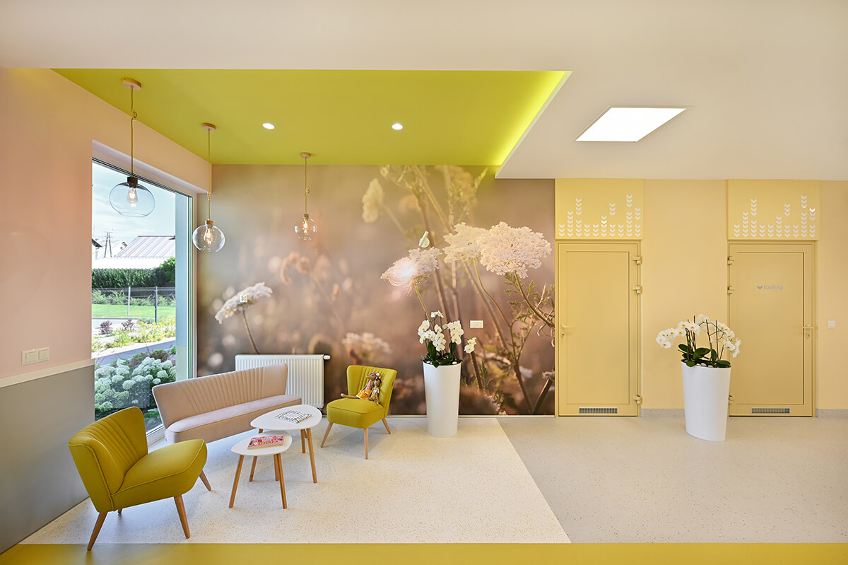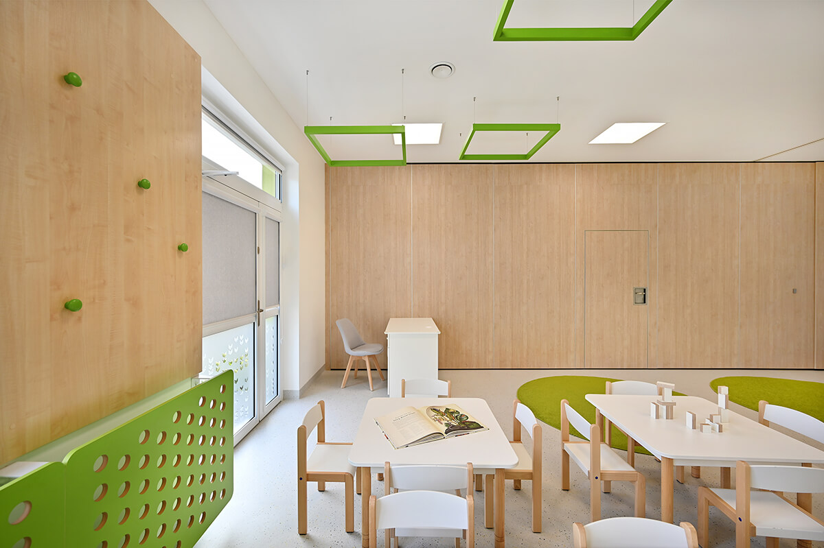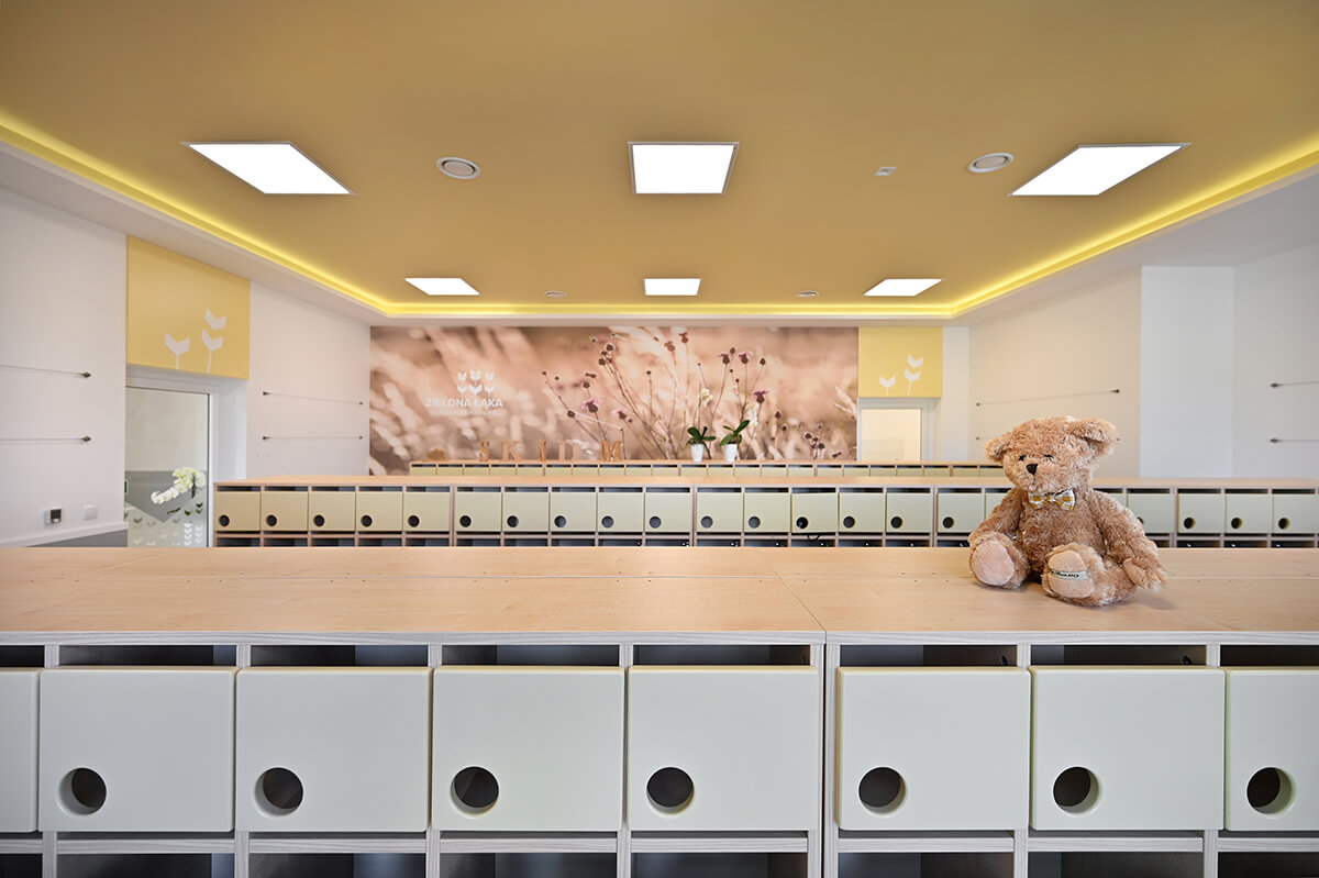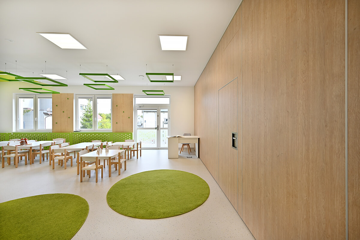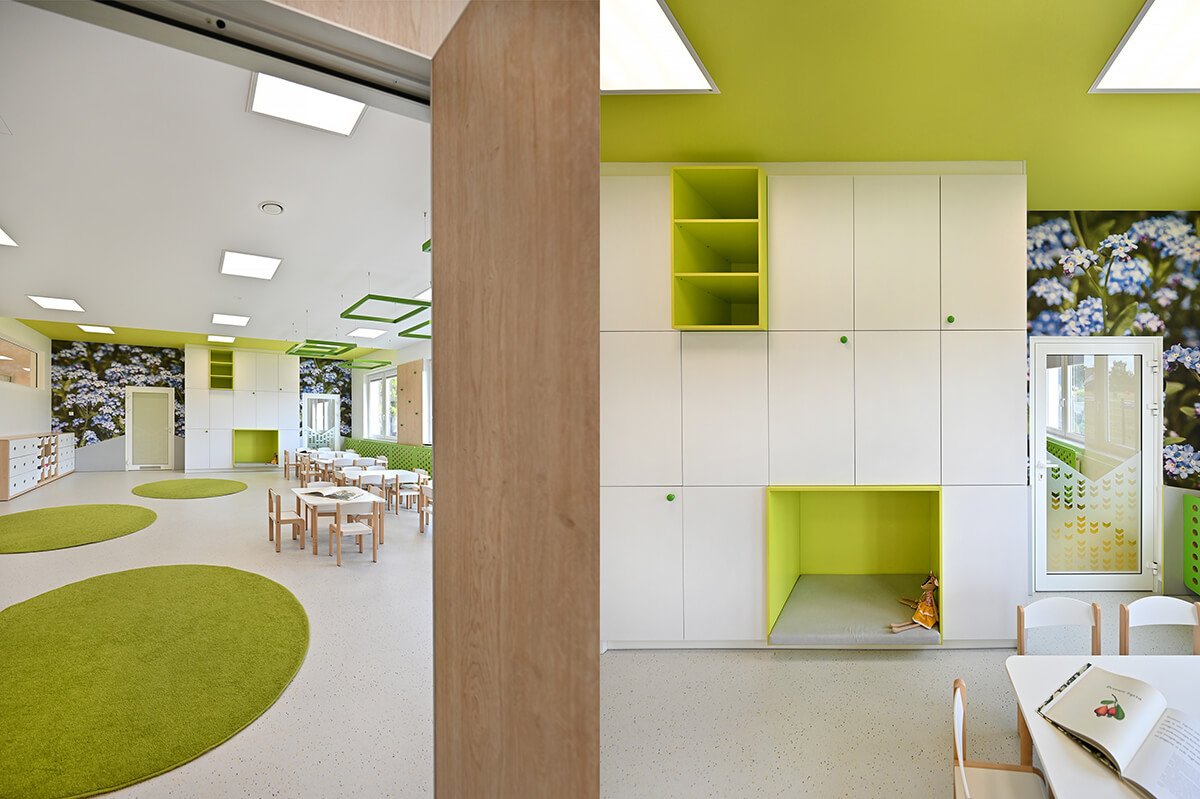 Projekt wnętrza przedszkola wraz z identyfikacją wizualną zakładał stworzenie przestrzeni mocno nasyconej inspiracjami z otaczających placówkę naturalnych krajobrazów. Zarówno gama kolorystyczna zdominowana przez biele, ale i obfitująca w oliwkowe zielenie skontrastowane z barwą czerwoną, czy malinową, jak i drewno w naturalnej barwie oraz proste, stonowane meble miały tworzyć harmonijną, przyjazną i pozytywną przestrzeń dla małych odkrywców.