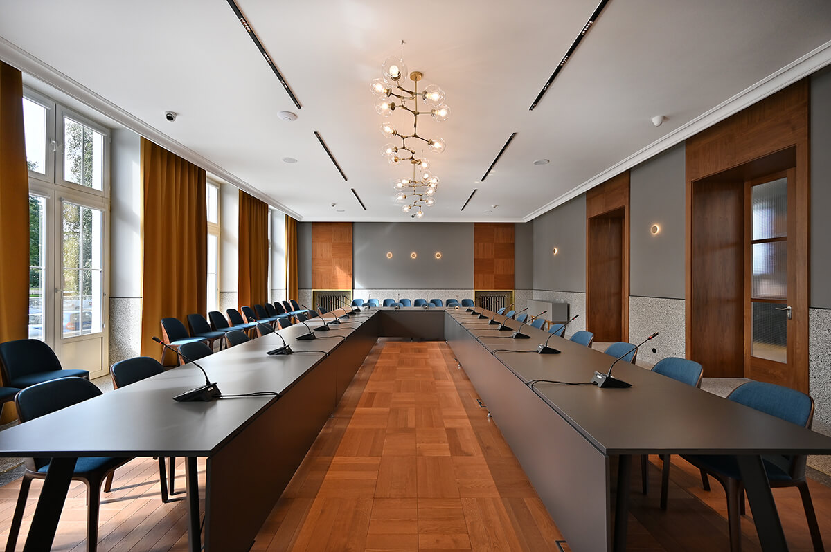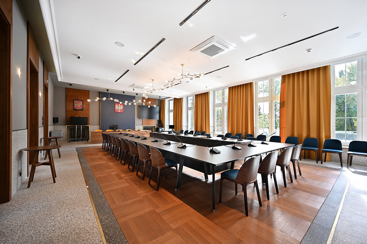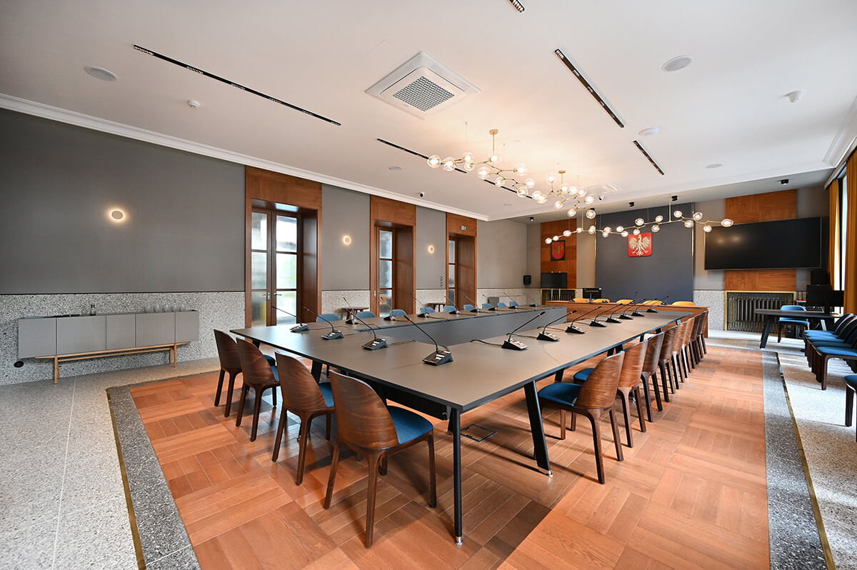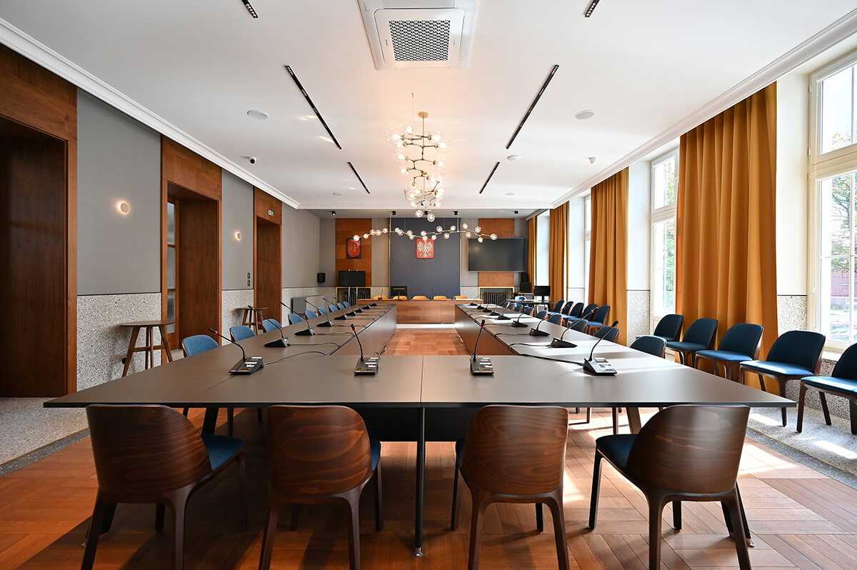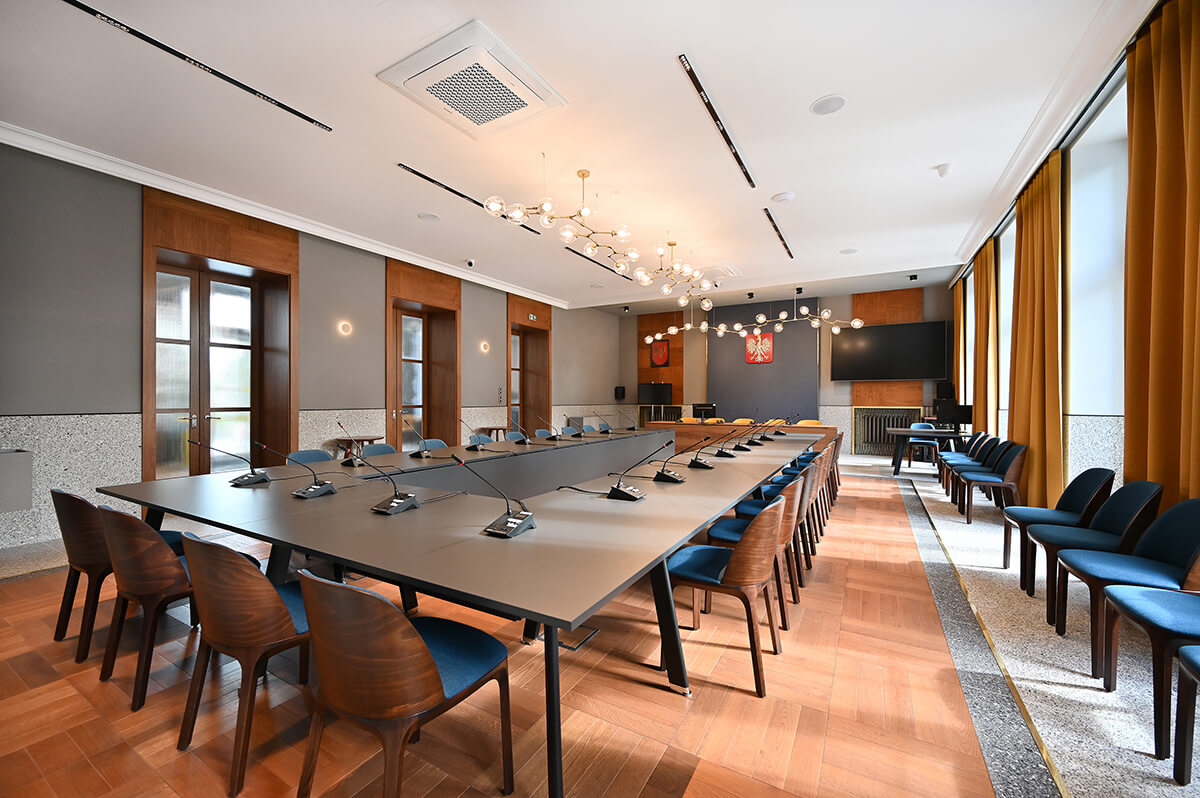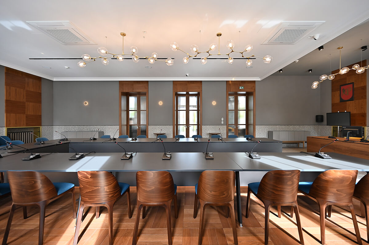 Projekt wnętrz sali obrad radnych wraz ze strefą wejścia do Urzędu Miasta w Pruszczu Gdańskim wymagał rzetelnego przestudiowania historycznego charakteru budynku magistratu. Oryginalne lastryko na posadzce hallu, czy sufitowe sztukaterie wyznaczyły czytelny kierunek do stworzenia nowoczesnego, ale i pełnego poszanowania dla ducha miejsca charakteru wnętrza.