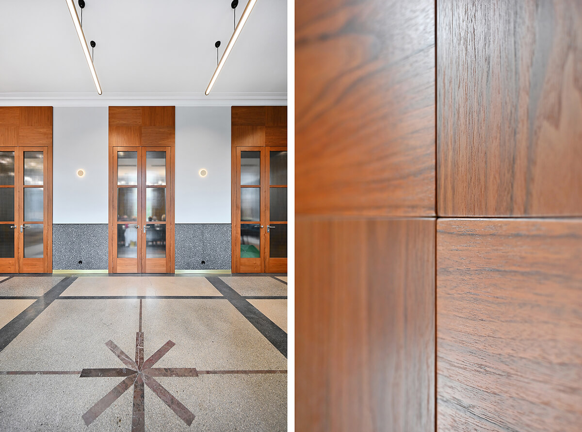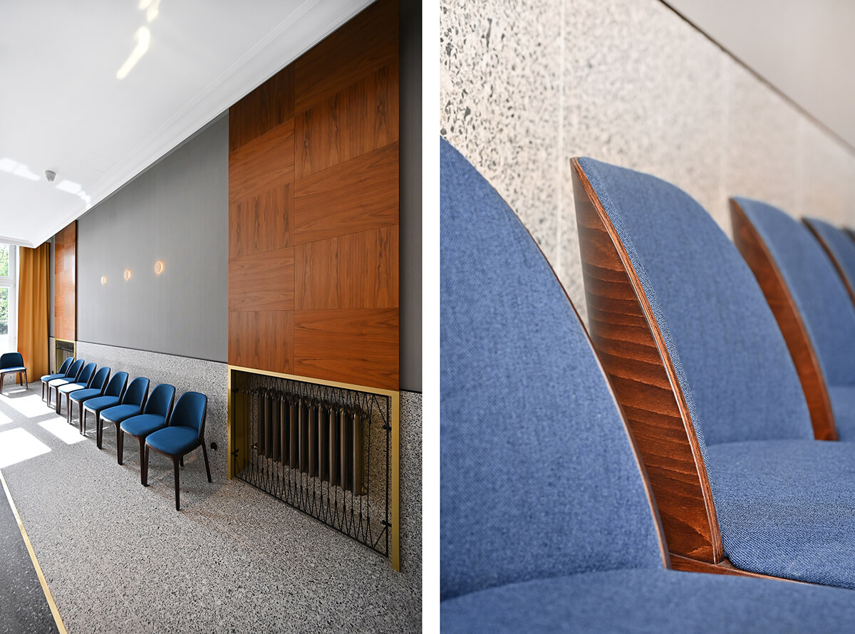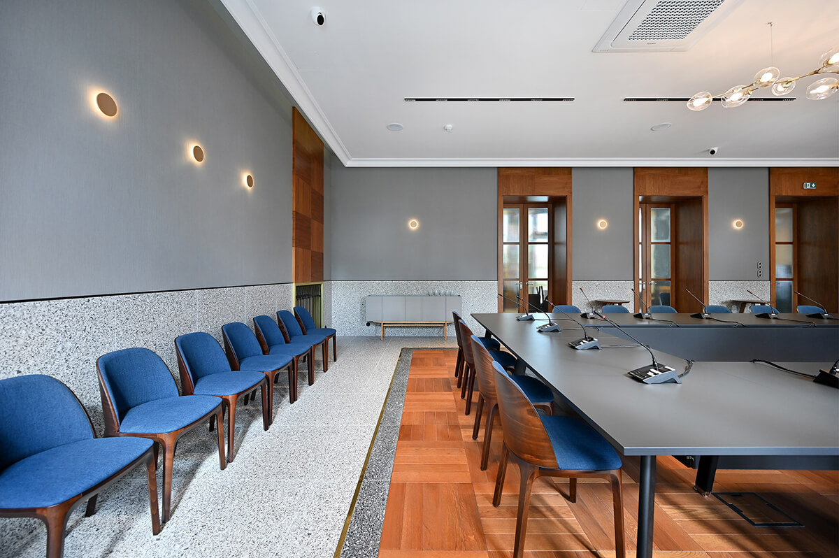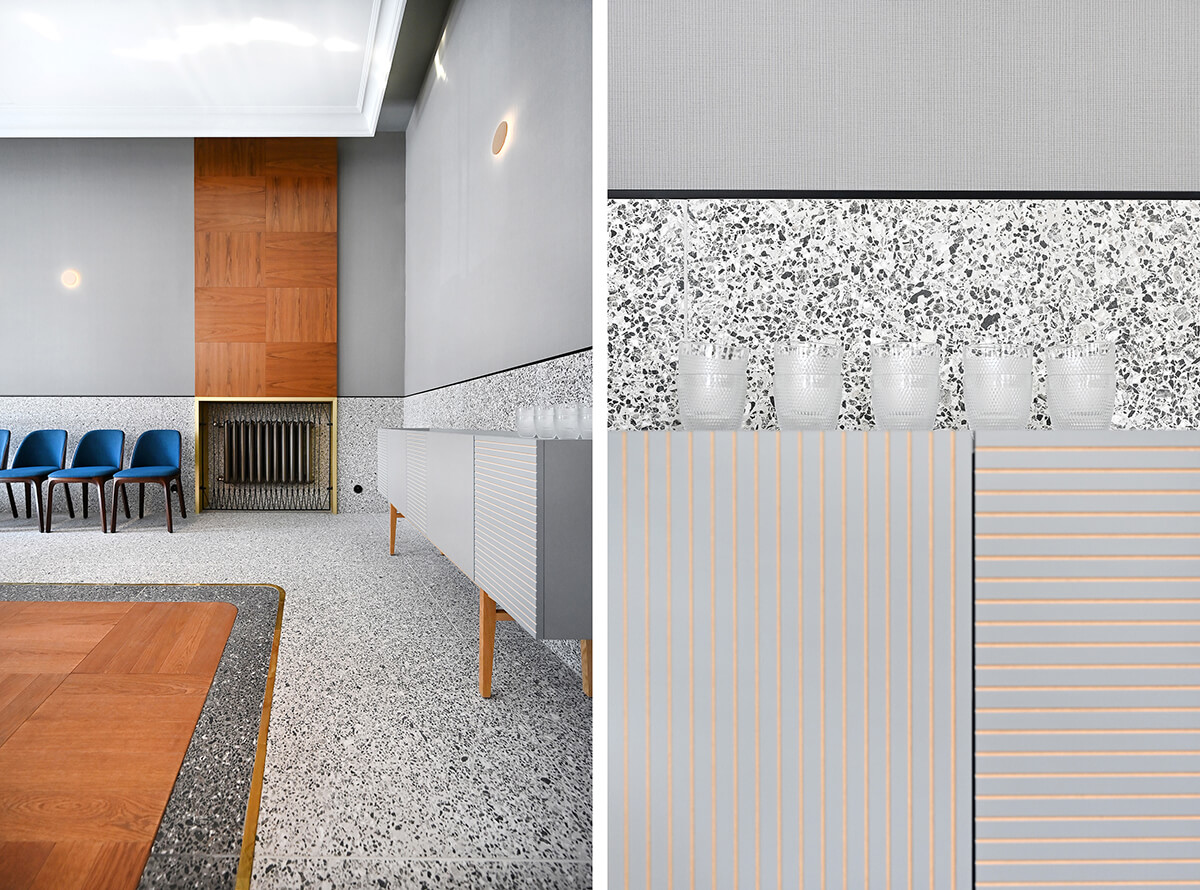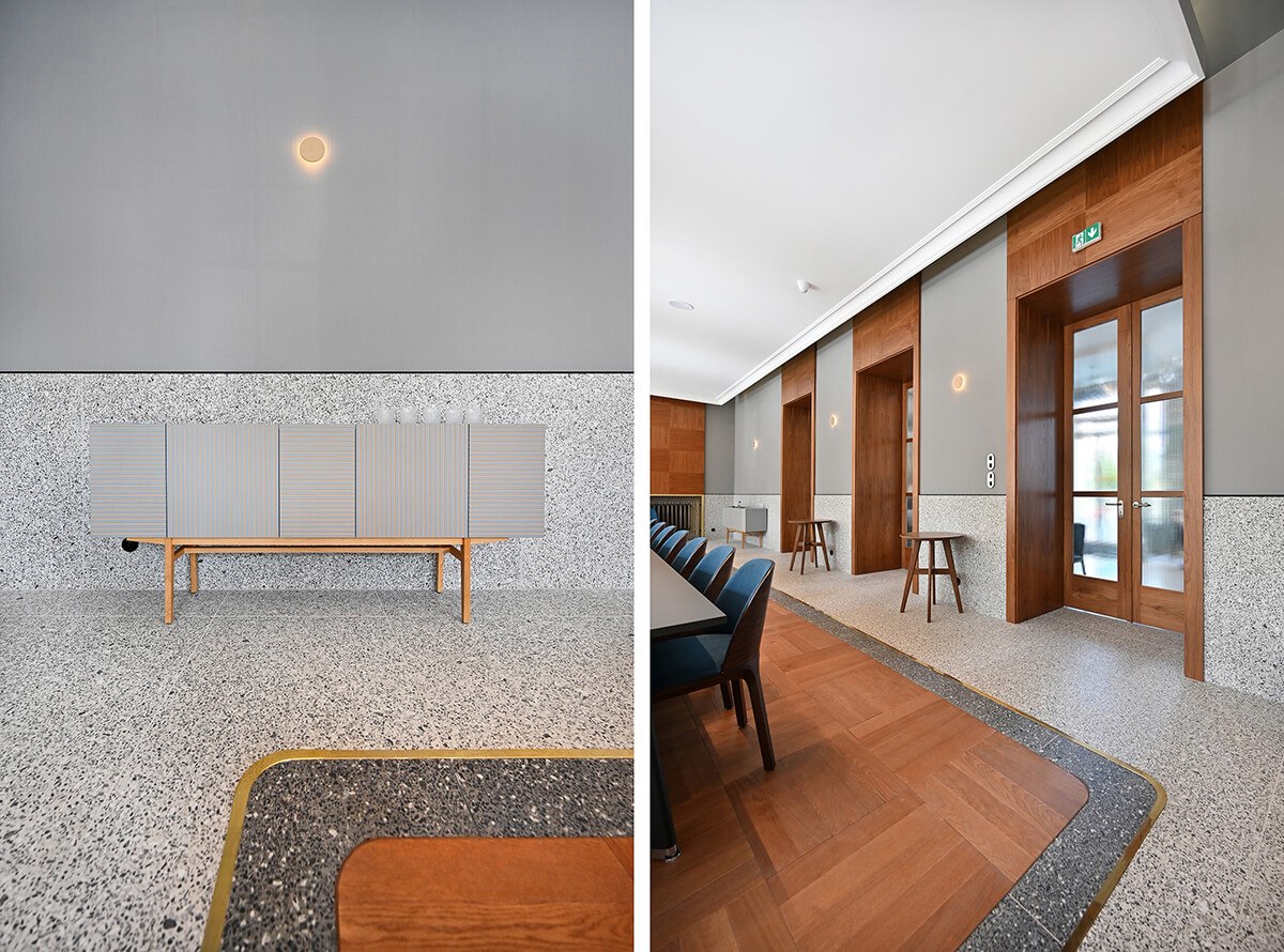 Zastosowane zostało ciepłe, orzechowe drewno, zarówno w meblach ruchomych, jak i zabudowach nadproży dwuskrzydłowych drzwi do sali obrad. Lamperie z gresu o fakturze bliskiej posadzce w połączeniu z owalnymi detalami i kolorem mosiądzu oraz miodowymi tapicerkami mebli są silnie zakorzenione w latach 50. i 60., ale w nowym wydaniu, skontrastowanym z dużymi powierzchniami minimalistycznych przeszkleń, czy prostym, czarnym oświetleniem funkcjonalnym.
