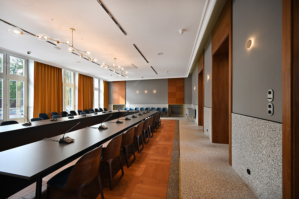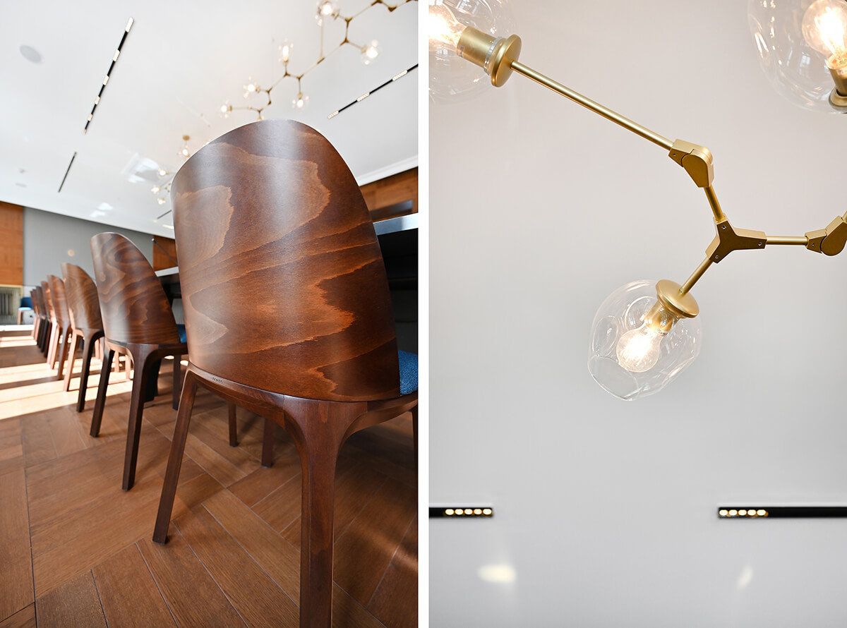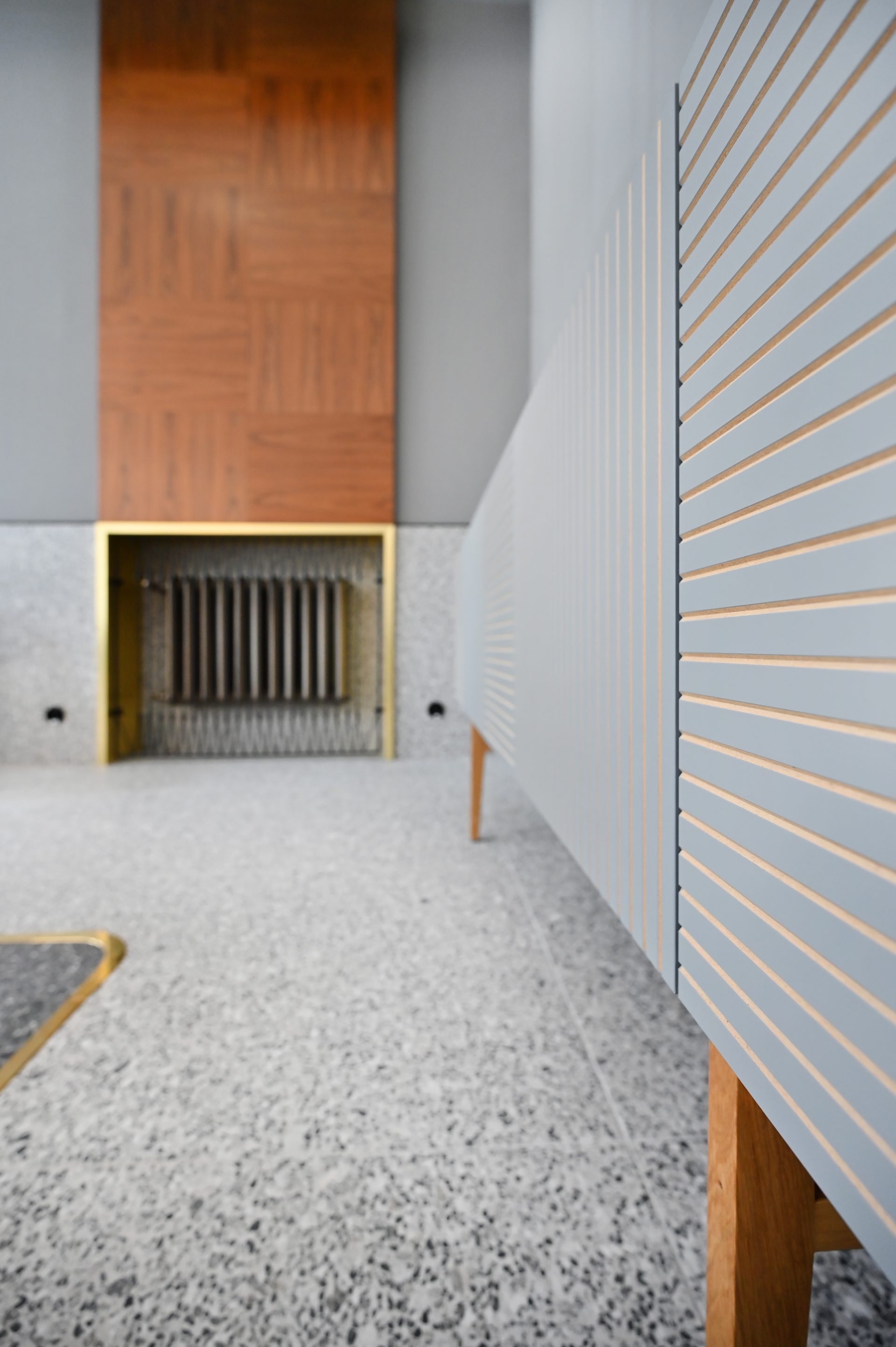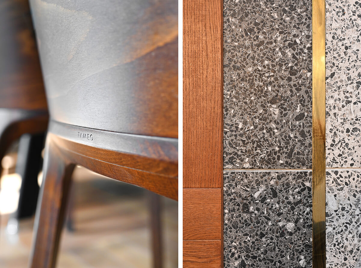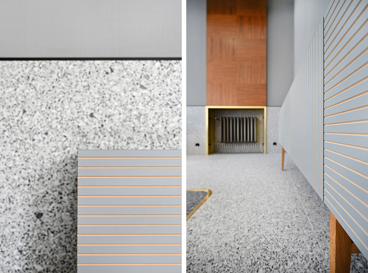 Zastosowane zostało ciepłe, orzechowe drewno, zarówno w meblach ruchomych, jak i zabudowach nadproży dwuskrzydłowych drzwi do sali obrad. Lamperie z gresu o fakturze bliskiej posadzce w połączeniu z owalnymi detalami i kolorem mosiądzu oraz miodowymi tapicerkami mebli są silnie zakorzenione w latach 50. i 60., ale w nowym wydaniu, skontrastowanym z dużymi powierzchniami minimalistycznych przeszkleń, czy prostym, czarnym oświetleniem funkcjonalnym.