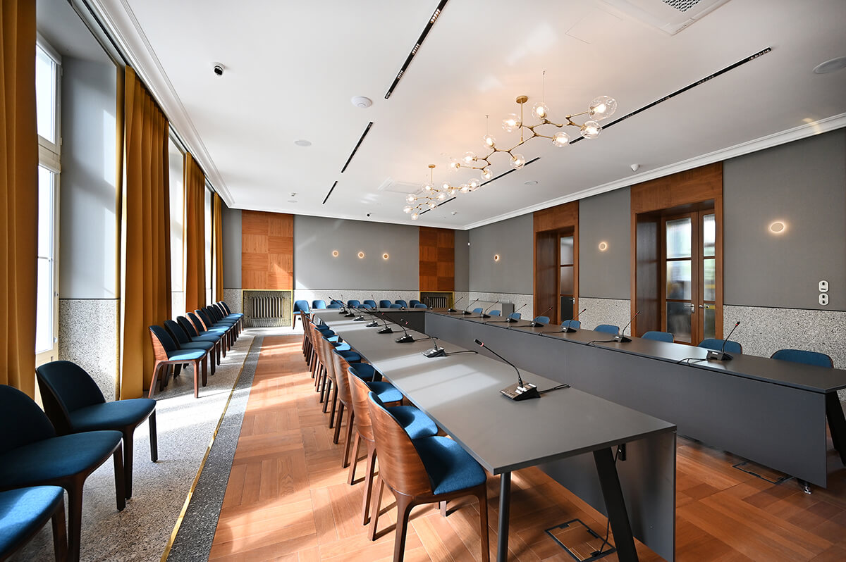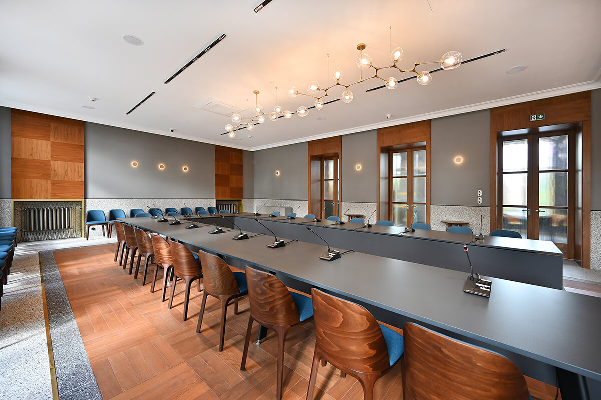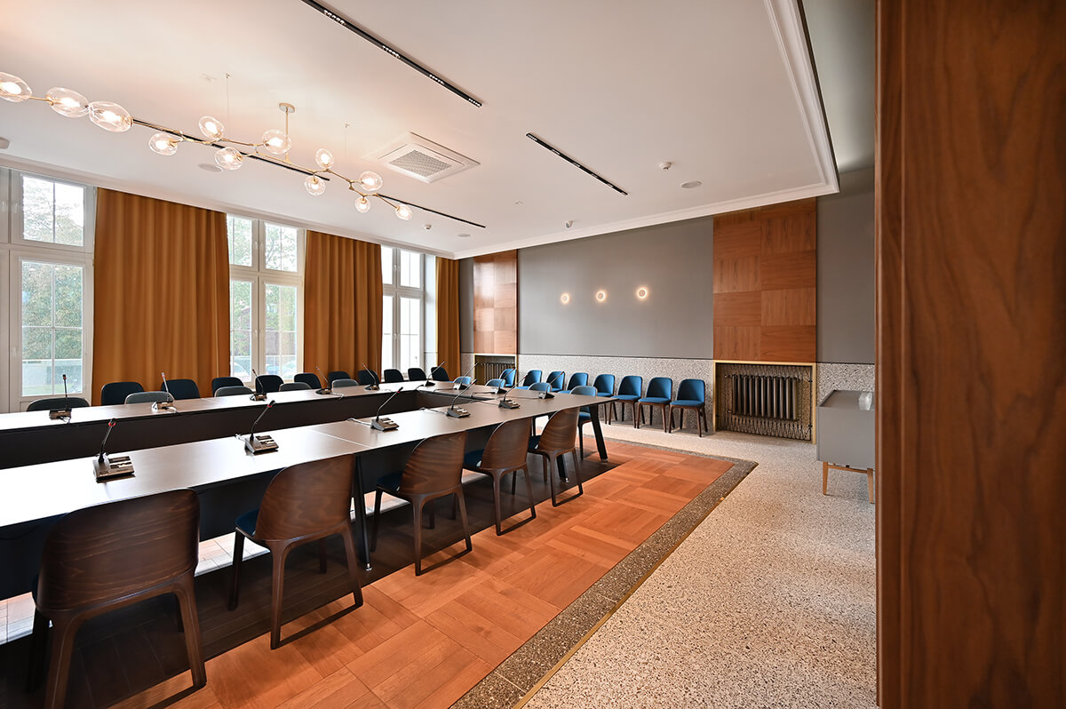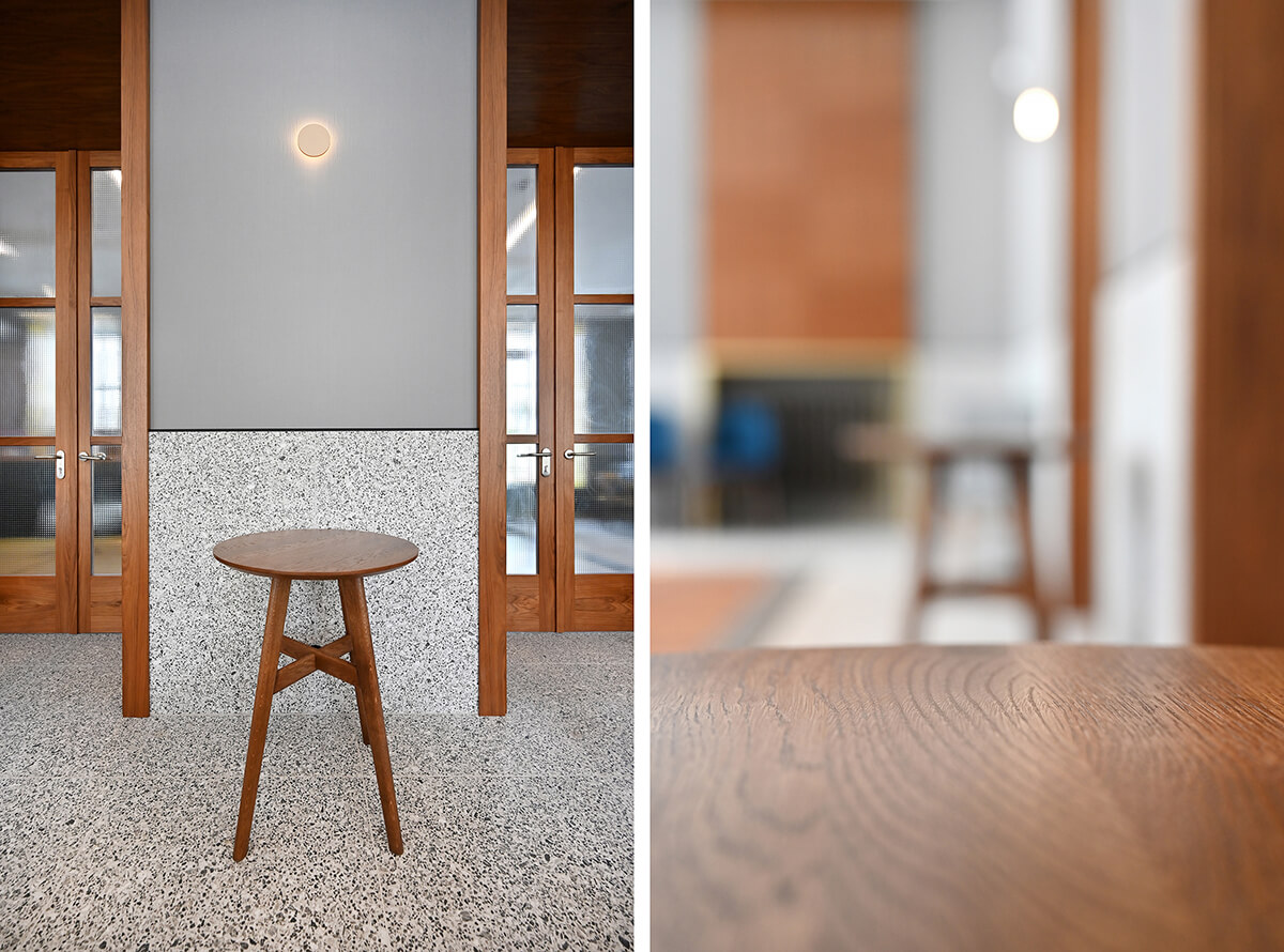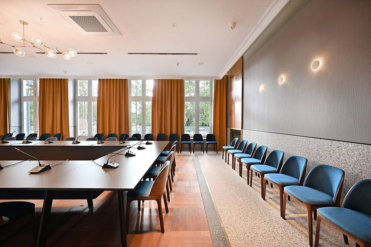 Zastosowane zostało ciepłe, orzechowe drewno, zarówno w meblach ruchomych, jak i zabudowach nadproży dwuskrzydłowych drzwi do sali obrad. Lamperie z gresu o fakturze bliskiej posadzce w połączeniu z owalnymi detalami i kolorem mosiądzu oraz miodowymi tapicerkami mebli są silnie zakorzenione w latach 50. i 60., ale w nowym wydaniu, skontrastowanym z dużymi powierzchniami minimalistycznych przeszkleń, czy prostym, czarnym oświetleniem funkcjonalnym.
