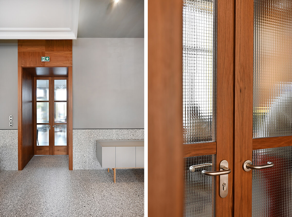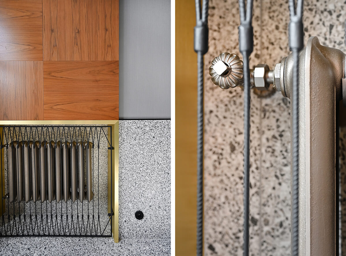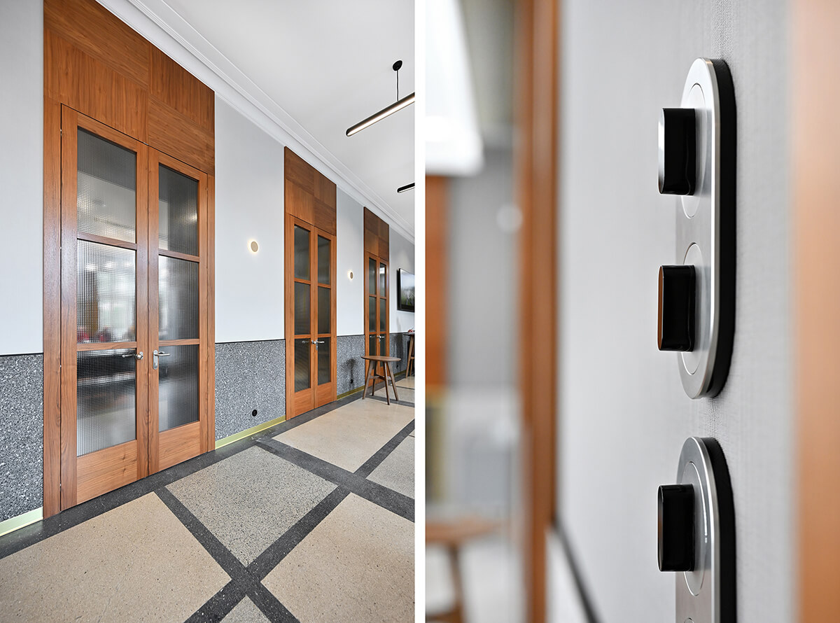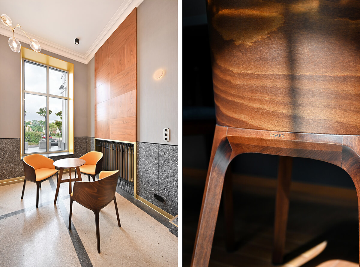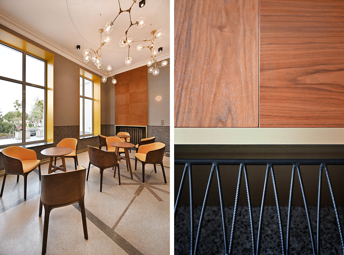 Zastosowane zostało ciepłe, orzechowe drewno, zarówno w meblach ruchomych, jak i zabudowach nadproży dwuskrzydłowych drzwi do sali obrad. Lamperie z gresu o fakturze bliskiej posadzce w połączeniu z owalnymi detalami i kolorem mosiądzu oraz miodowymi tapicerkami mebli są silnie zakorzenione w latach 50. i 60., ale w nowym wydaniu, skontrastowanym z dużymi powierzchniami minimalistycznych przeszkleń, czy prostym, czarnym oświetleniem funkcjonalnym.