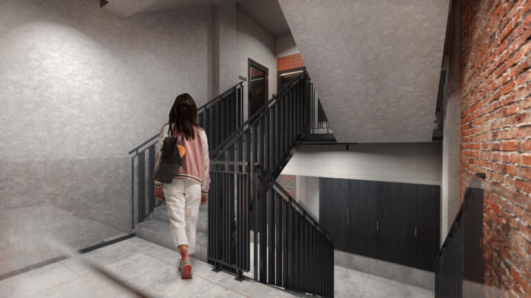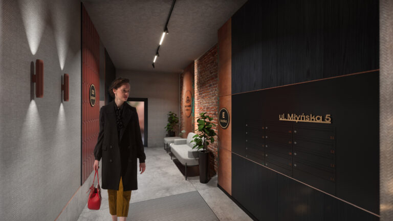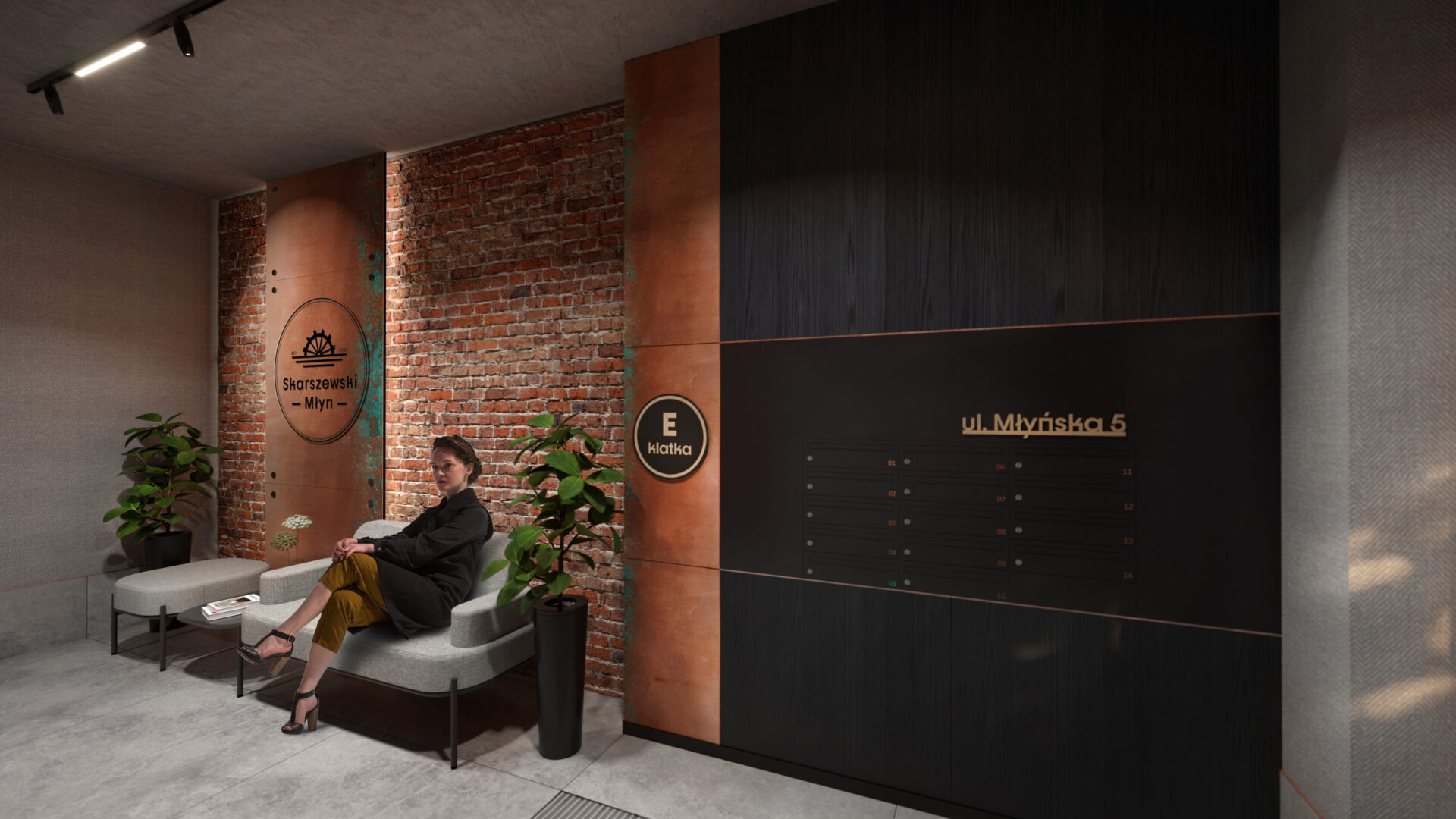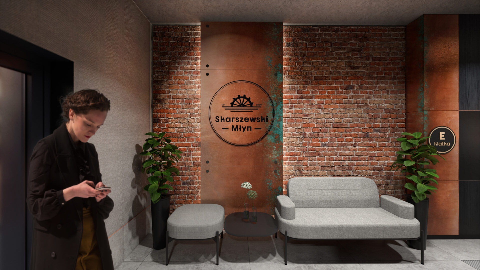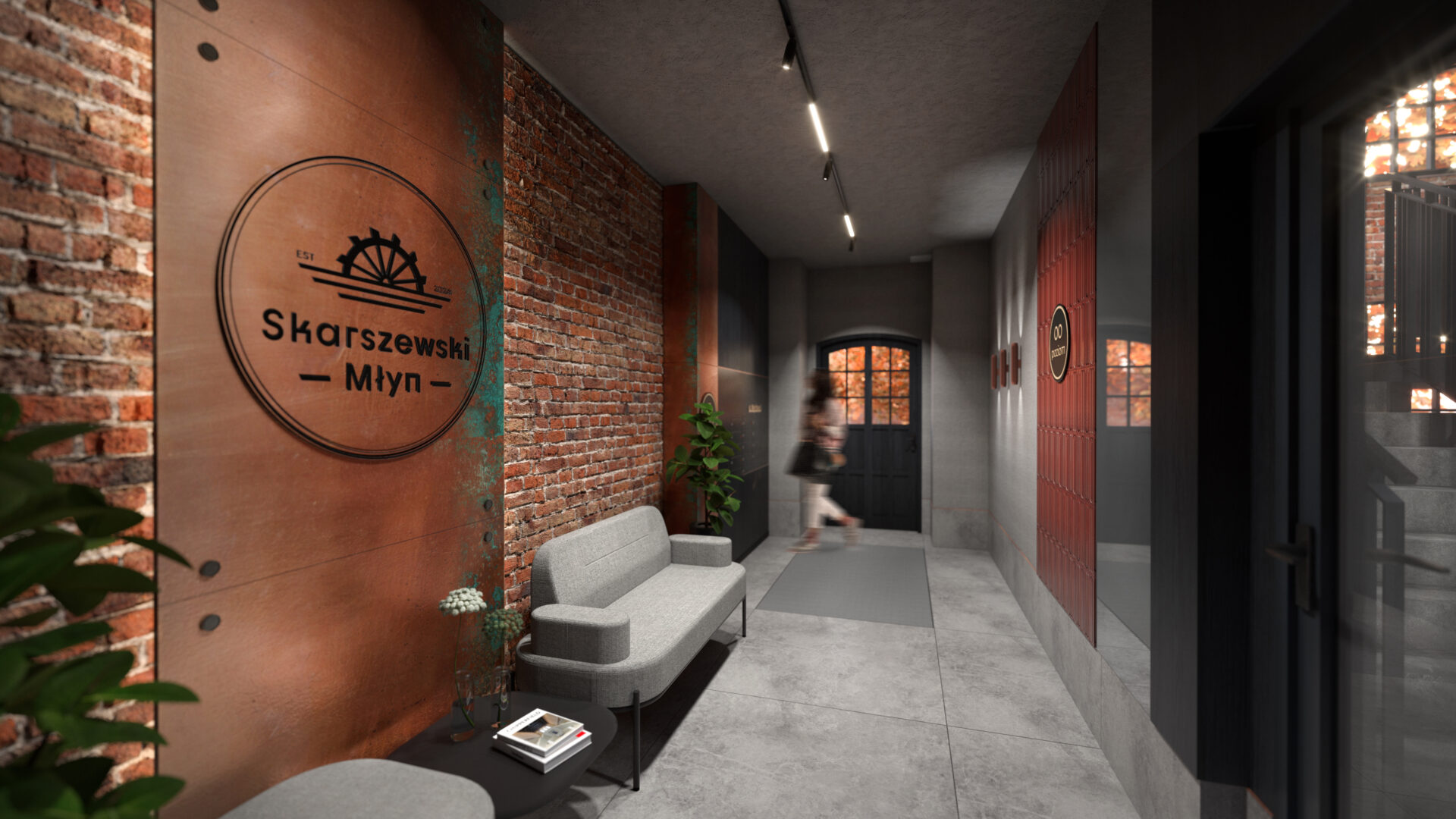 SKARSZEWSKI MŁYN to nowoczesna inwestycja, która łączy w sobie 38 niezwykłych mieszkań zlokalizowanych na 6 kondygnacjach nadziemnych. Całość utrzymana jest w industrialnym charakterze, zapewniając nie tylko walory estetyczne, ale również komfort, wygodę i najwyższy standard wykończenia. Oryginalne przestrzenie apartamentów zostały stworzone dla tych, którzy cenią unikalne miejsca i wysoki standard wykończenia. Nasza pracowania zadbała, aby każdy detal części wspólnych był na wysokim poziomie, tworząc spójna estetycznie i przytulna przestrzeń codziennego życia. Duch miejsca stał się inspiracją przy poszukiwaniu motywów materiałowo-plastycznych. W roli głównej występuje oryginalna cegła, tynki i farby gliniane oraz szkliwione płytki ceramiczne w stylu retro.