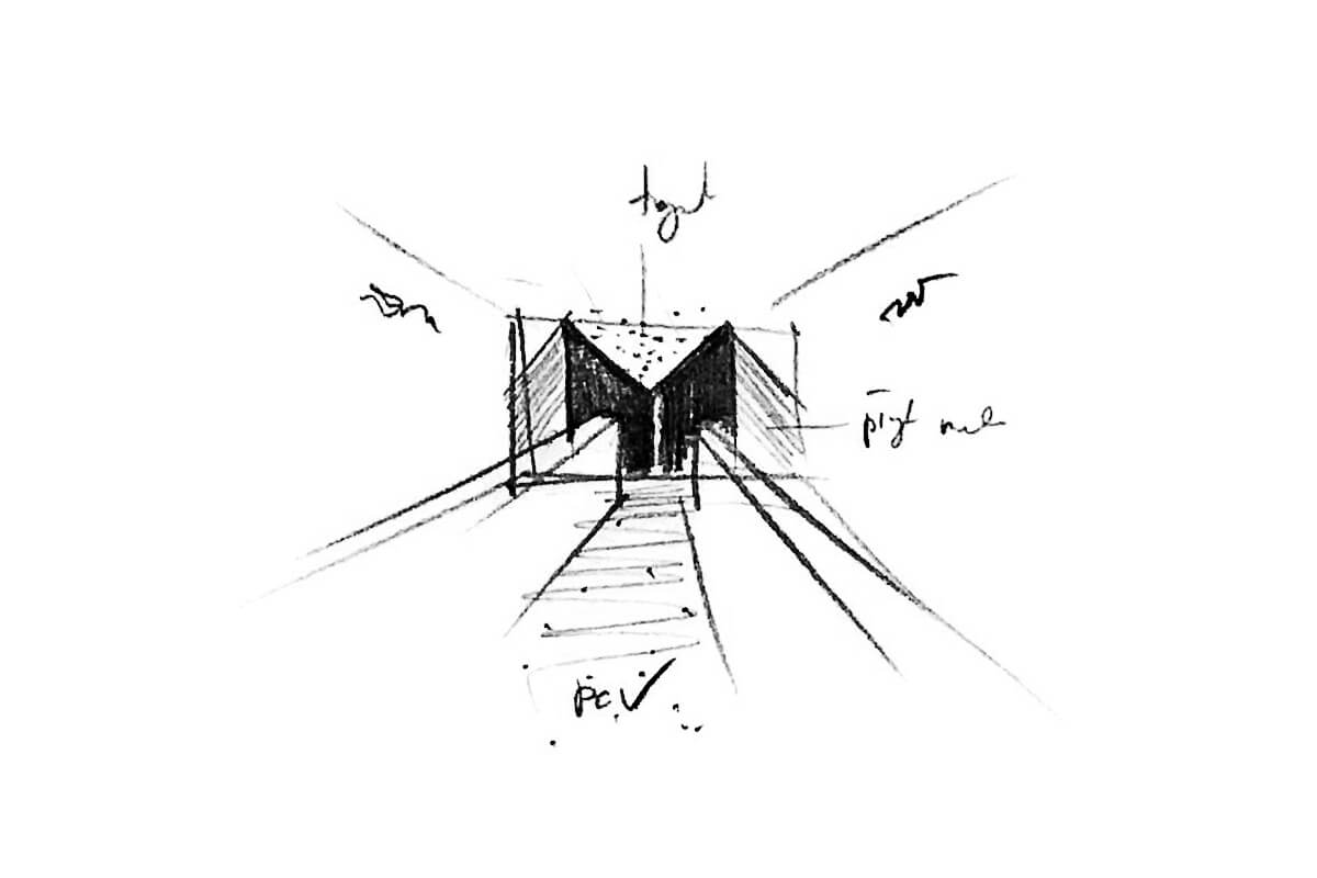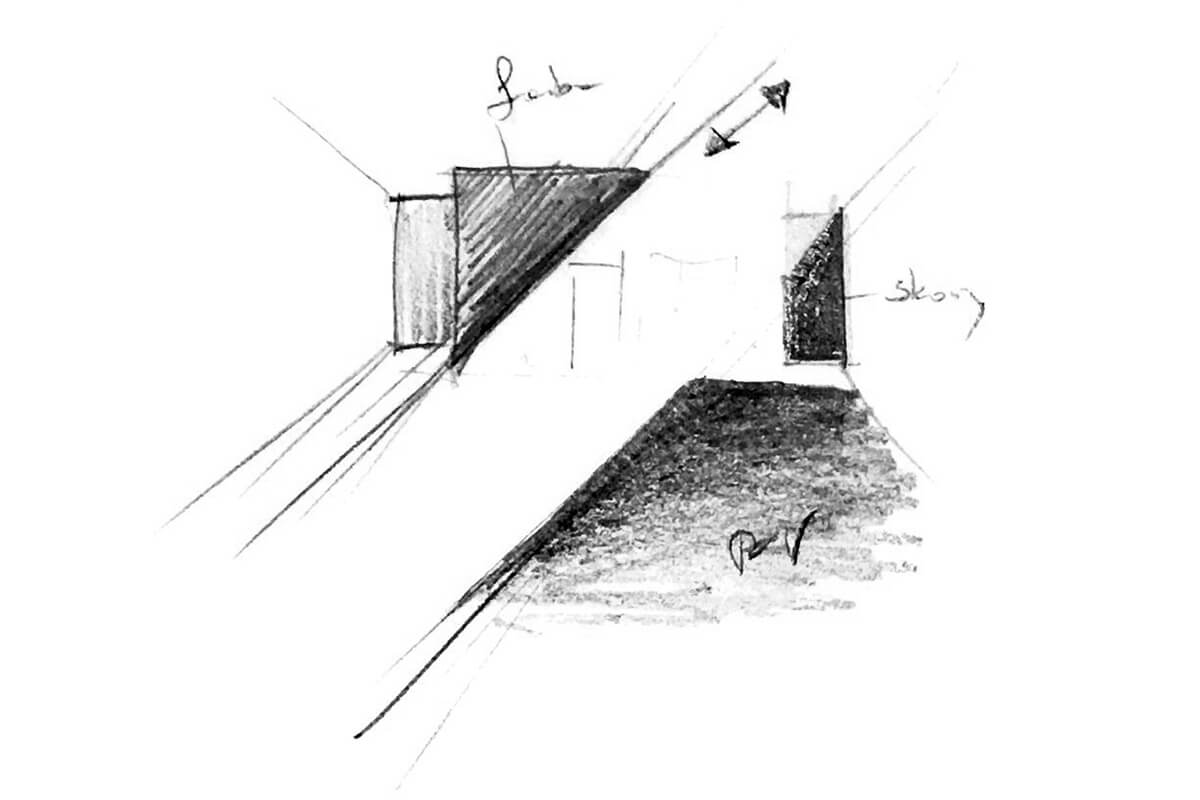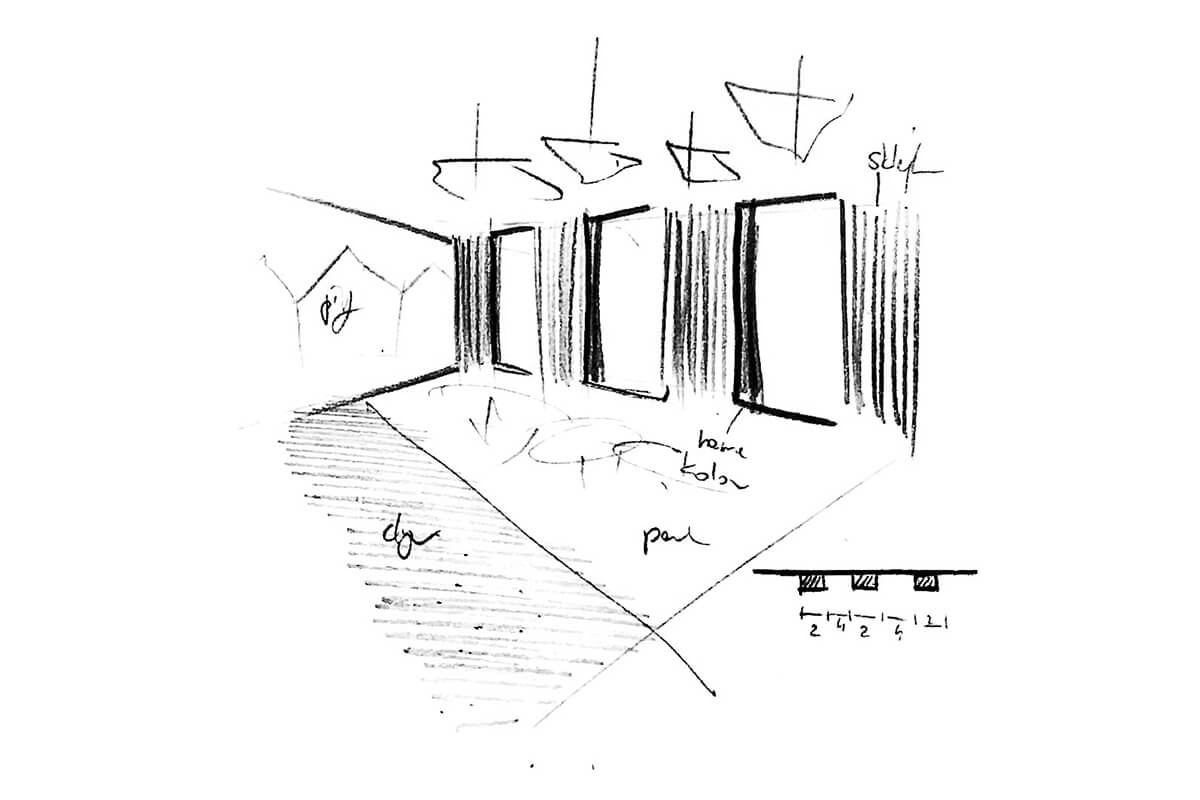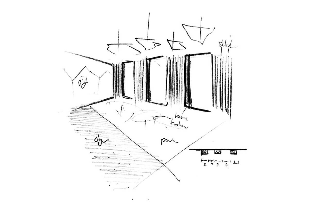 Konsekwentnie stosowanym motywem plastycznym we wnętrzach jest pewien rodzaj asymetrii, skośnych linii, który pojawia się zarówno w projektowanych formach przestrzennych, graficznej identyfikacji wizualnej wnętrza, ale także w kolorystyce ścian.